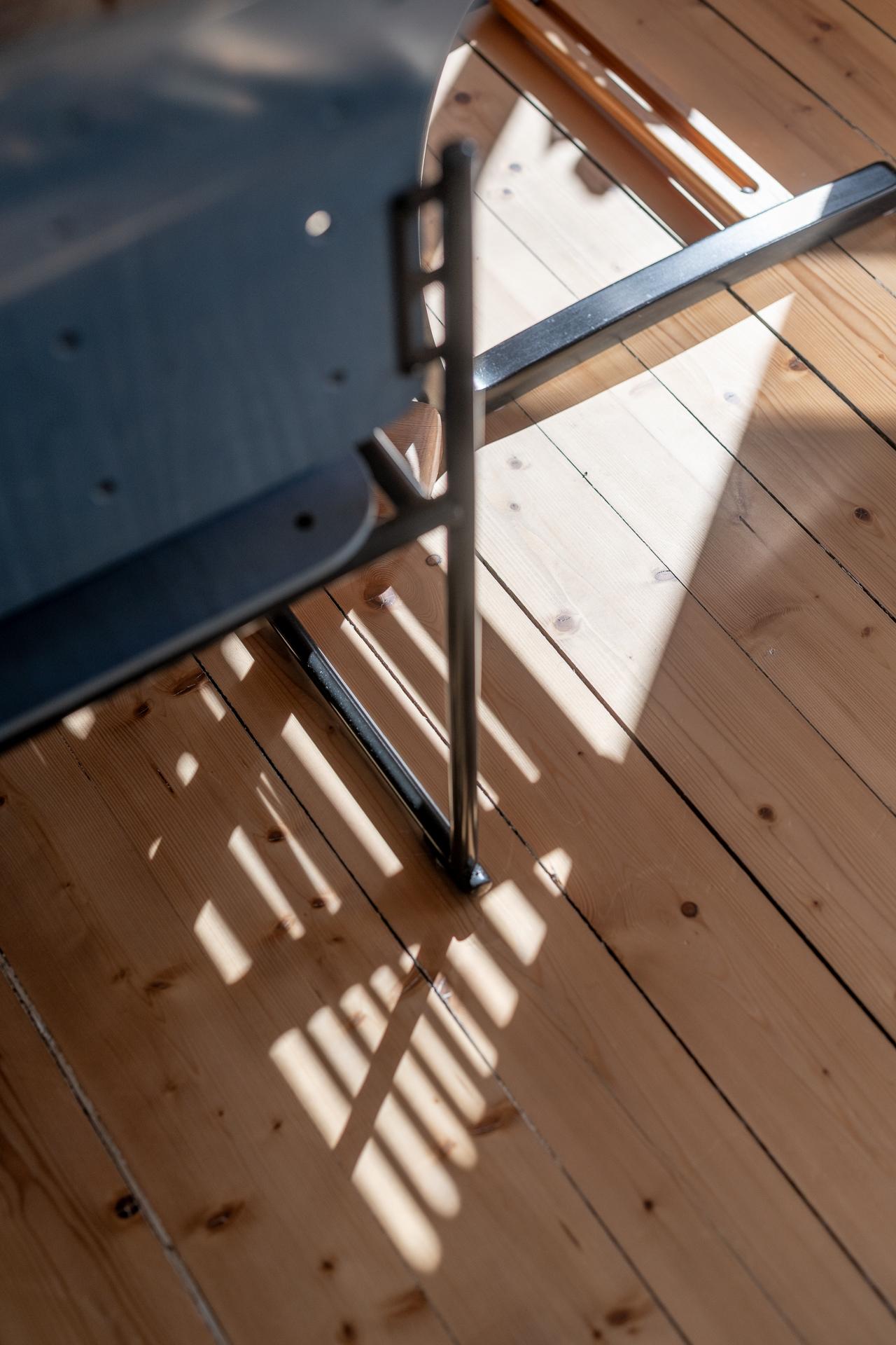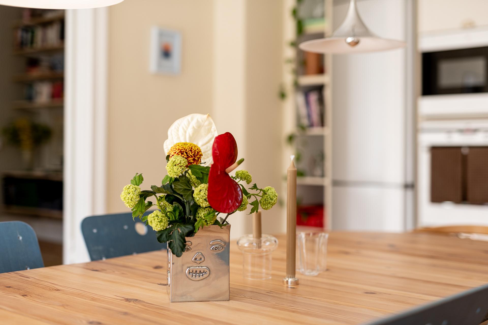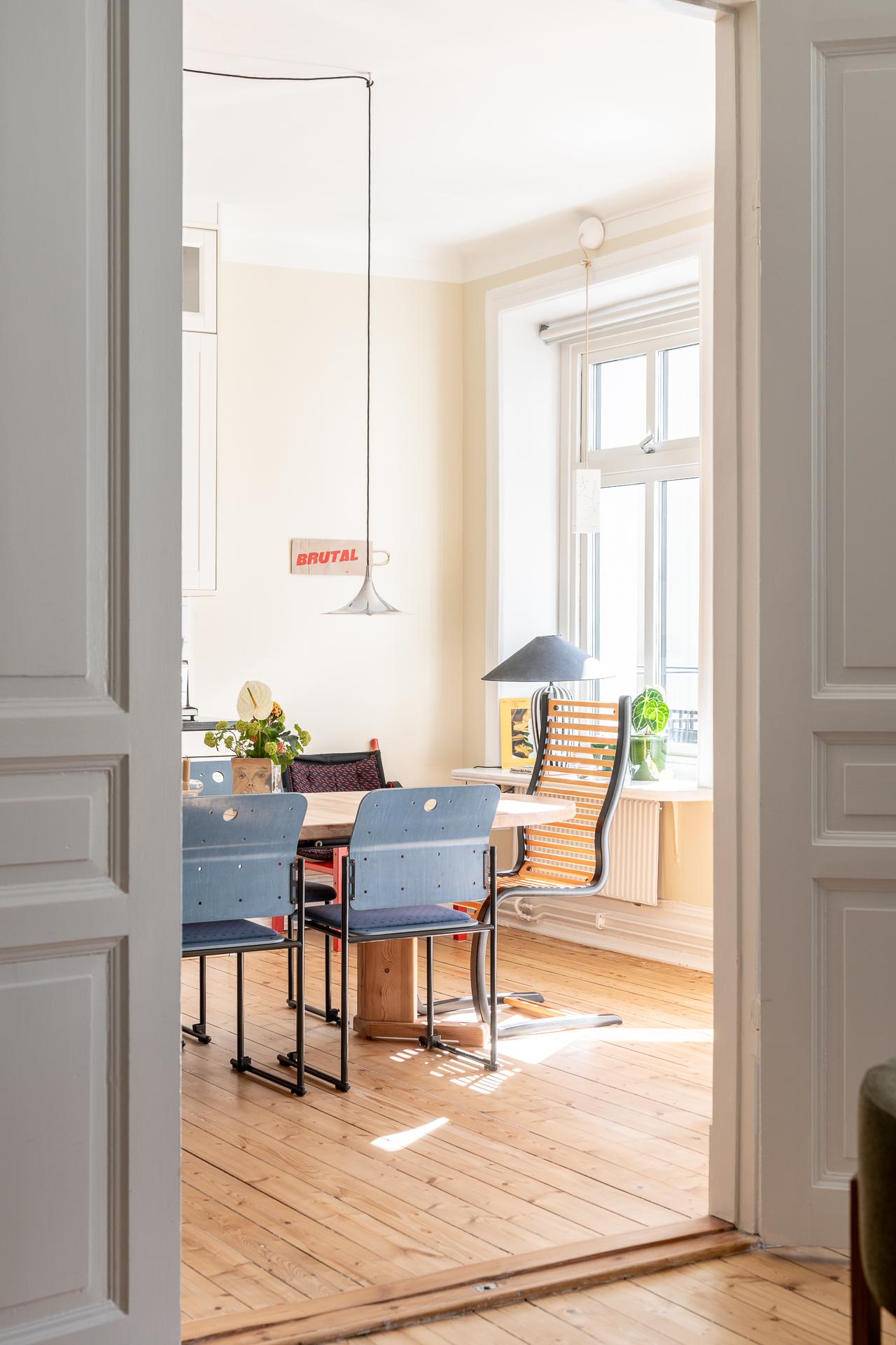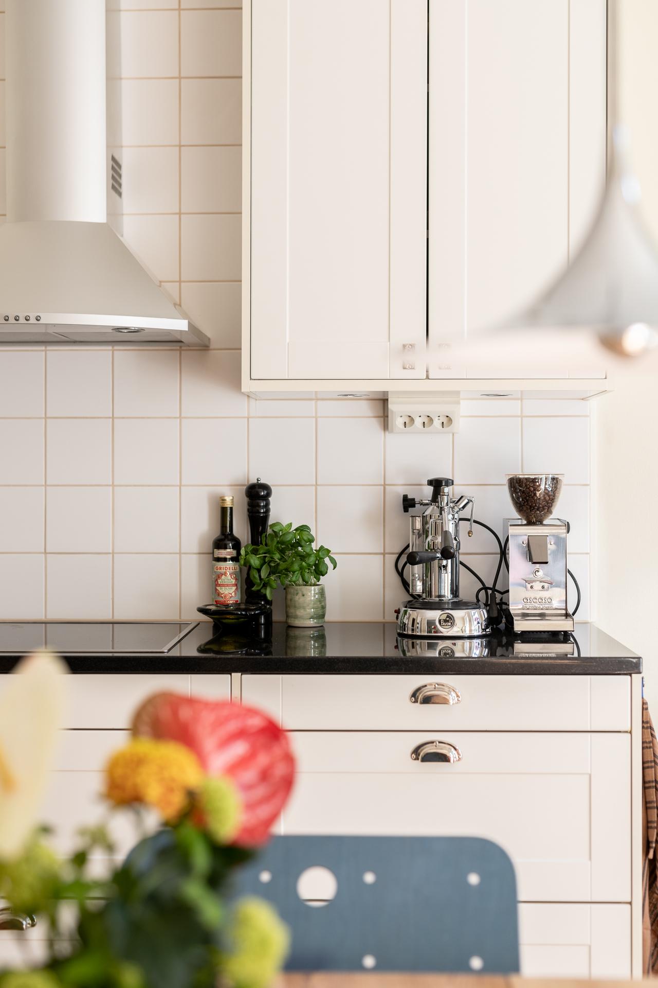 Köket och vardagsrummet ligger i fil, elegant placerade några trappsteg upp från hallen, vilket skapar en subtil och spännande nivåindelning. Den breda öppningen mellan rummen ger en känsla av öppen planlösning, samtidigt som de vackra parspegeldörrarna gör det möjligt att stänga till när så önskas. I köket finns gott om plats för stora middagar med vänner och familj – här ryms utan problem ett långbord för tio personer. Under varmare månader blir den rymliga balkongen en naturlig förlängning av rummet, perfekt för både livliga middagar och stilla stunder i eftermiddags- och kvällssolen. Arbetsytorna är generösa och förvaringen välplanerad, med överskåp som nyttjar den imponerande takhöjden. Det framtagna originalgolvet i brädor ger karaktär, och ovanför tronar en vacker takrosett.