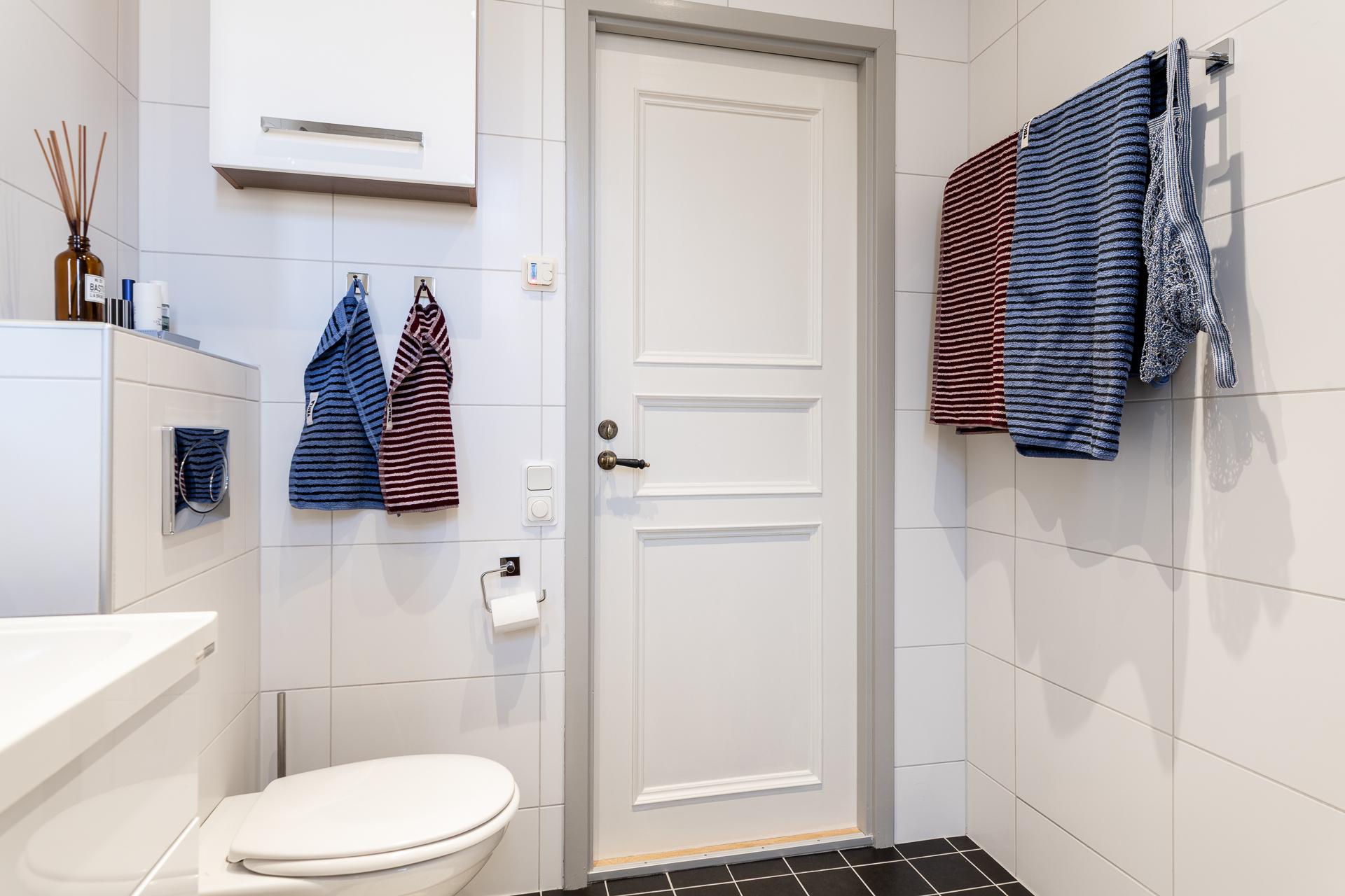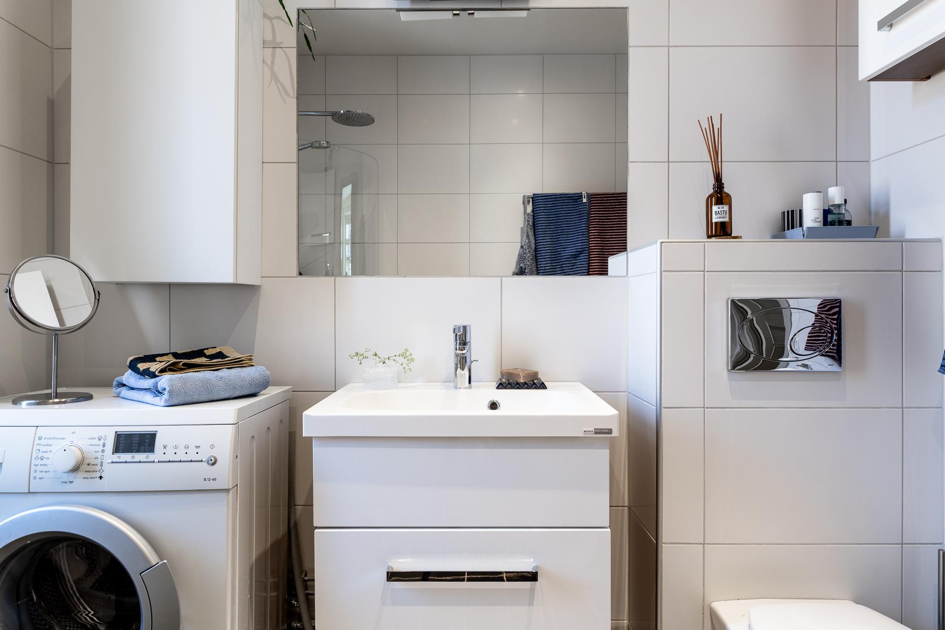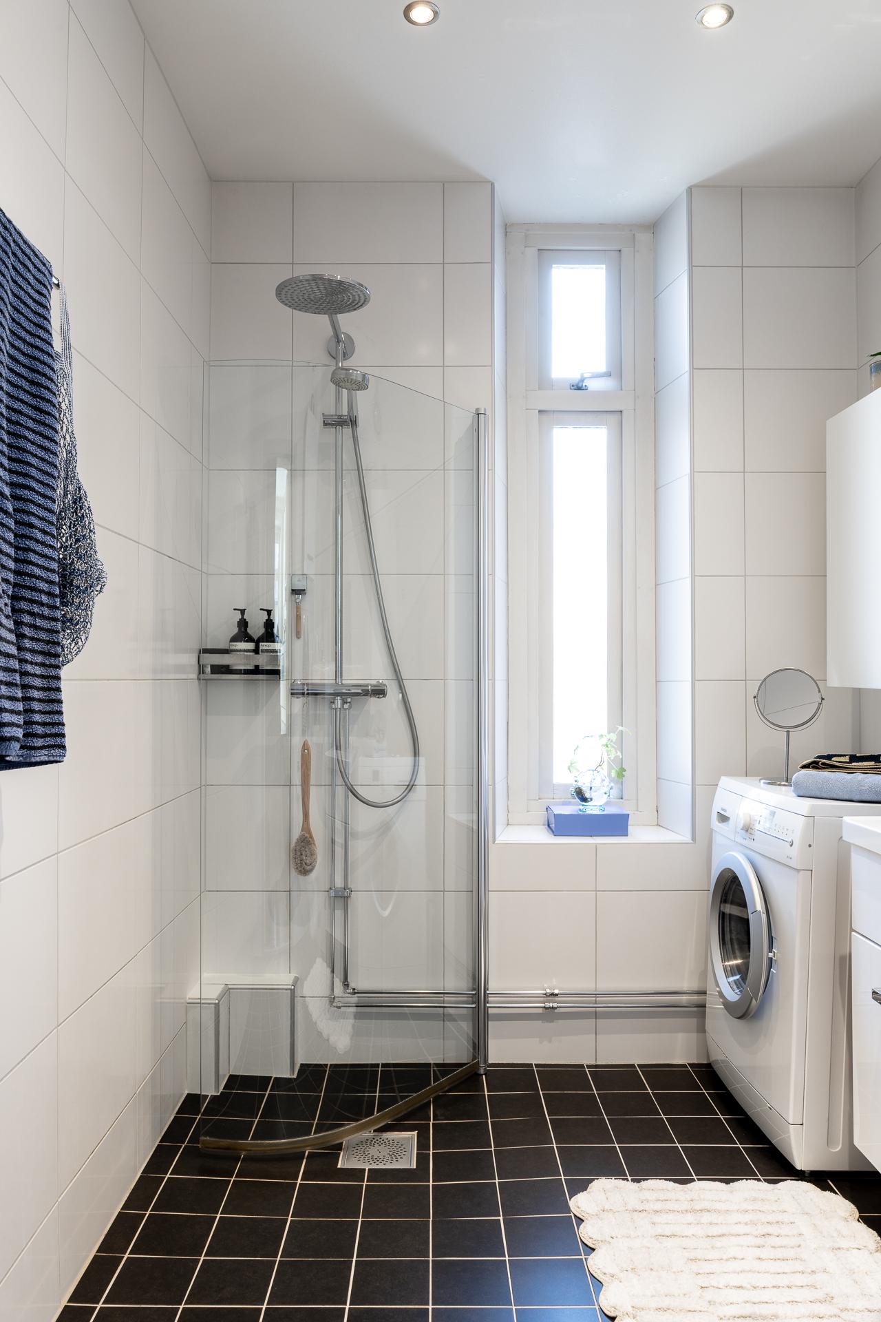 Badrummet är fräscht och stilrent, med duschhörna, handdukstork, tvättkommod, tvättmaskin och vägghängd toalett. Duschutrymmet, som avgränsas med infällbara glasdörrar, är utrustat med både takdusch och handmunstycke. Väggarna kläs av stora vita kakelplattor, medan golvet pryds av grå klinker med behaglig golvvärme. Ett avlångt fönster släpper in både dagsljus och frisk luft.