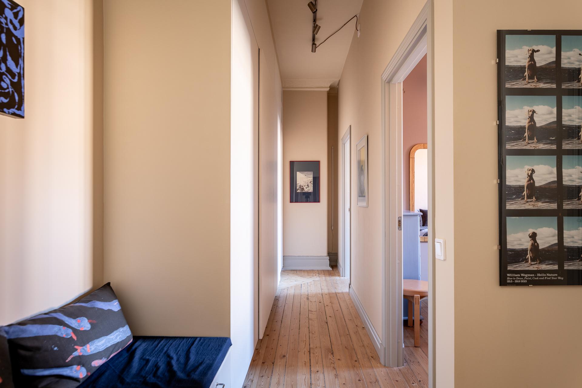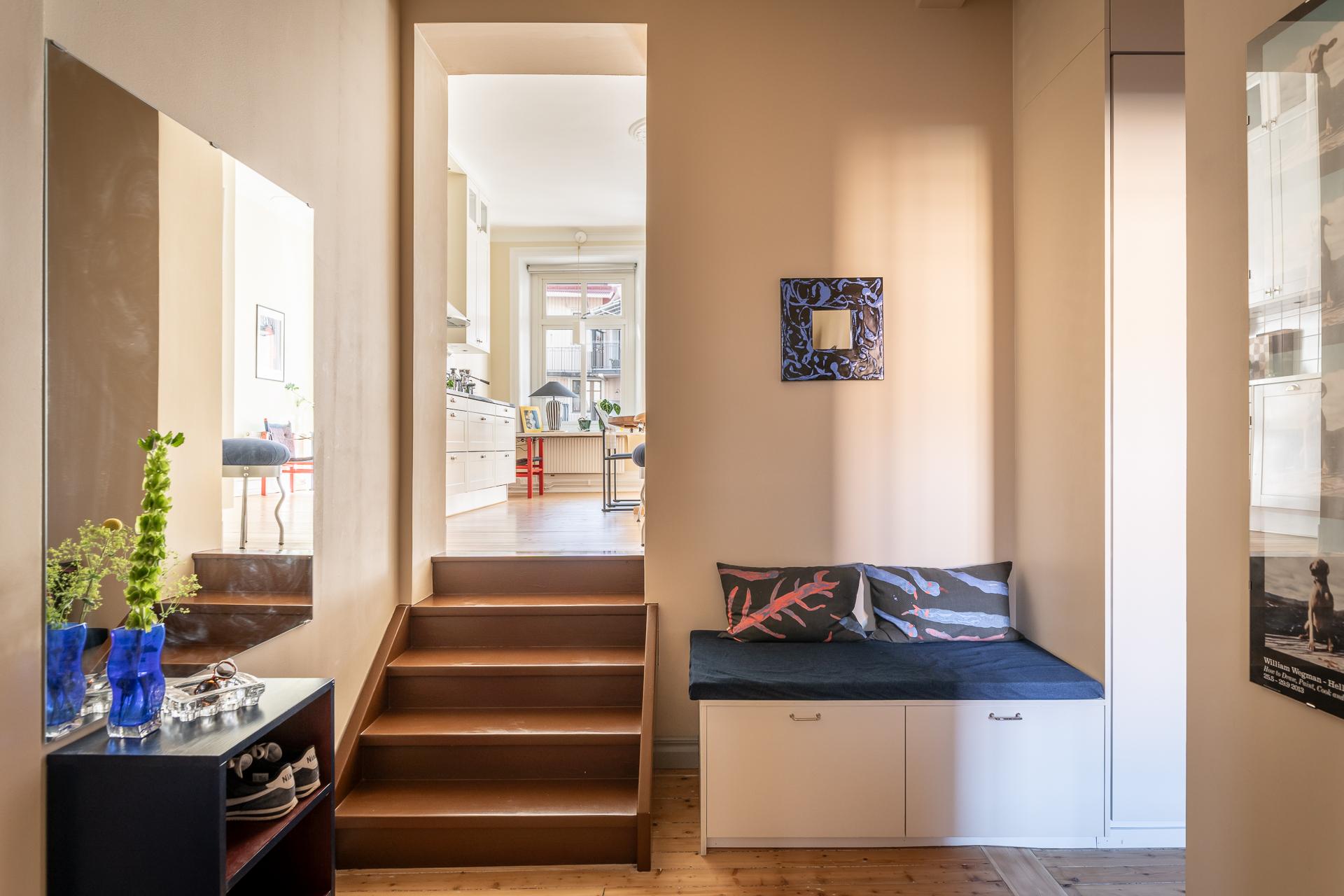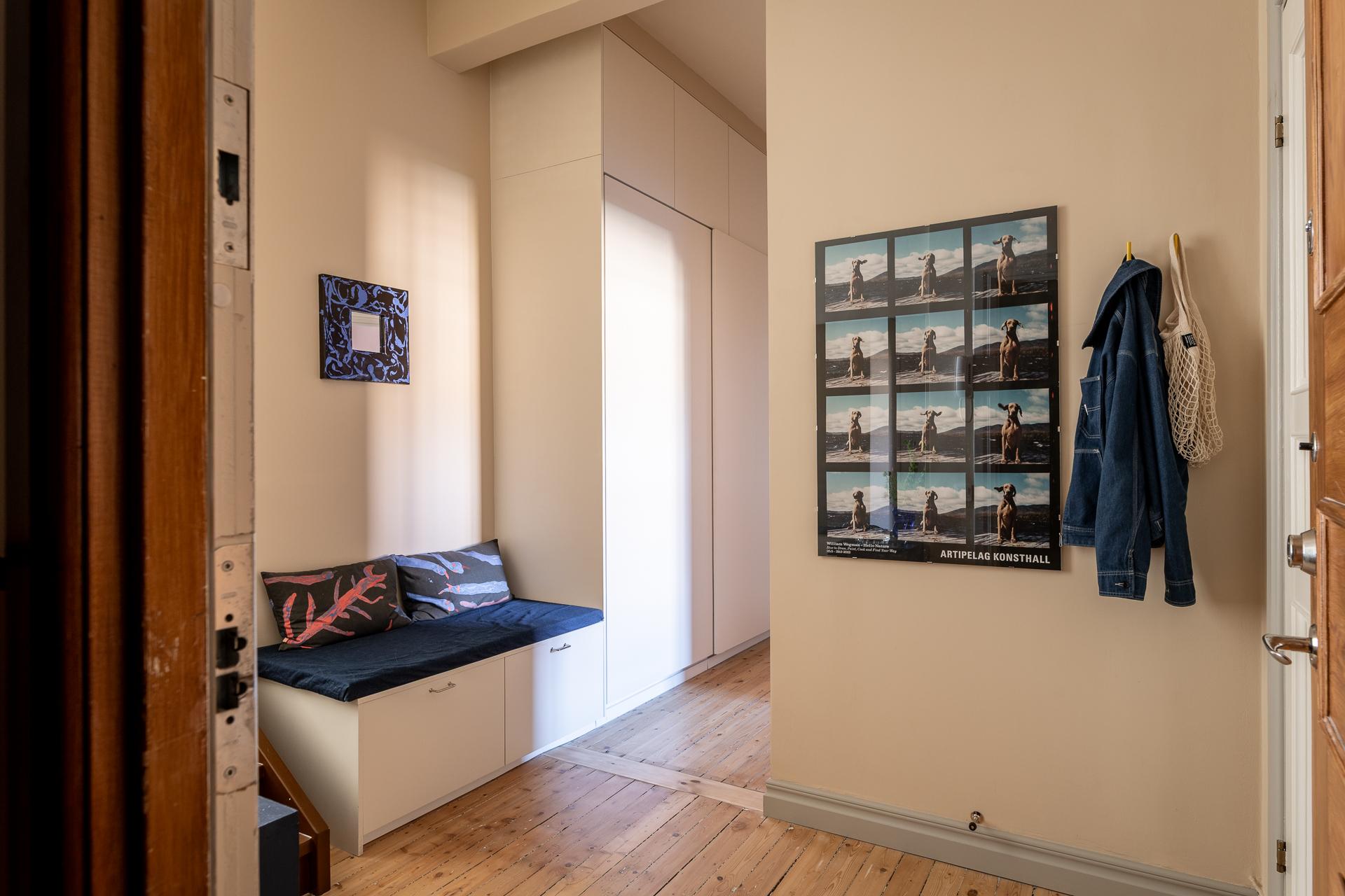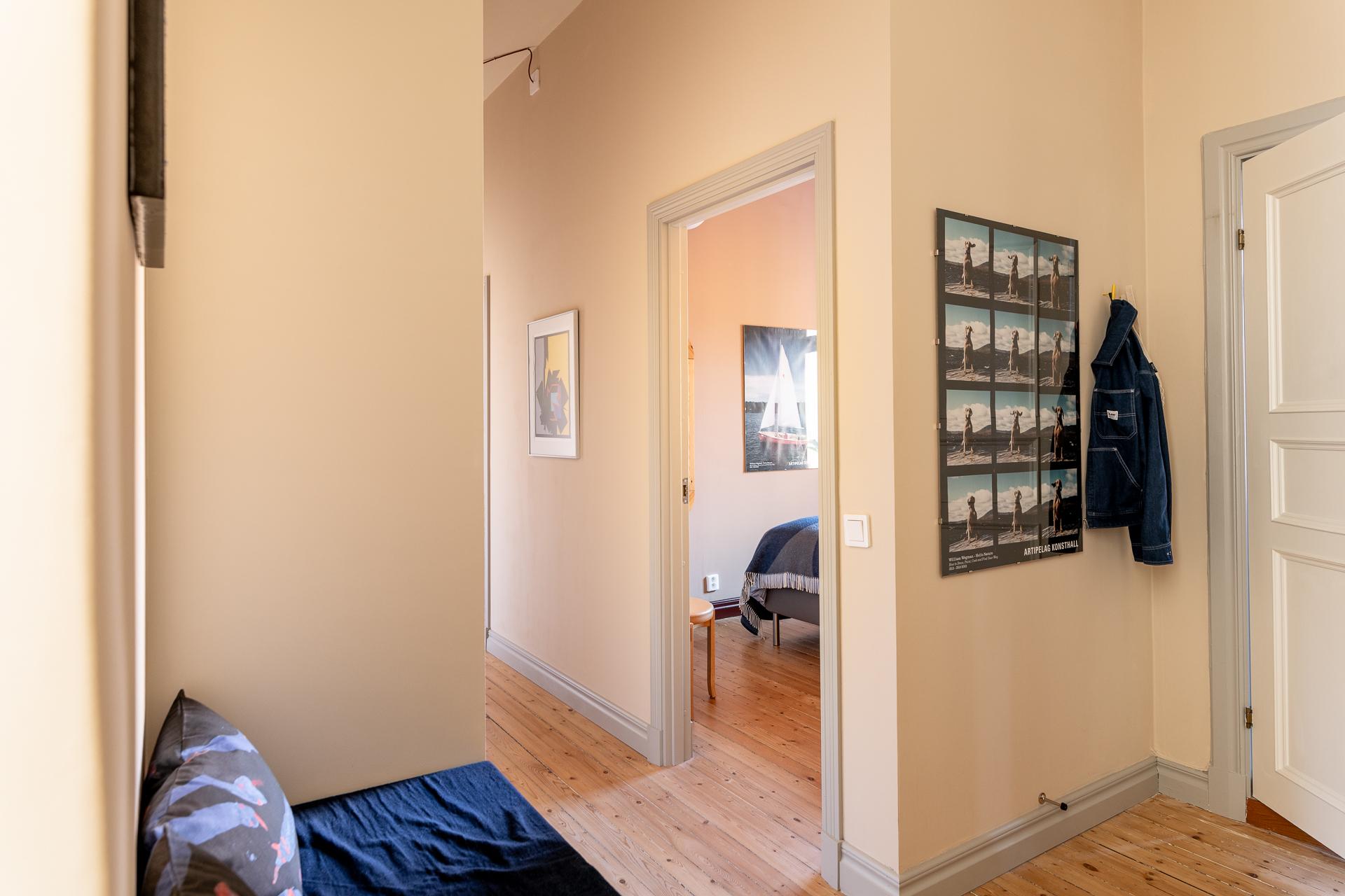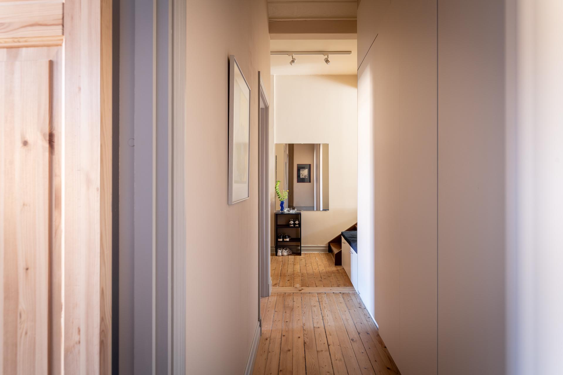 Den välkomnande hallen erbjuder praktiska avhängningsmöjligheter direkt vid entrén, samt ytterligare förvaring i en inbyggd garderob längre in. Här ligger det vackra originalgolvet i framtagna brädor som sätter tonen redan från första steget in.