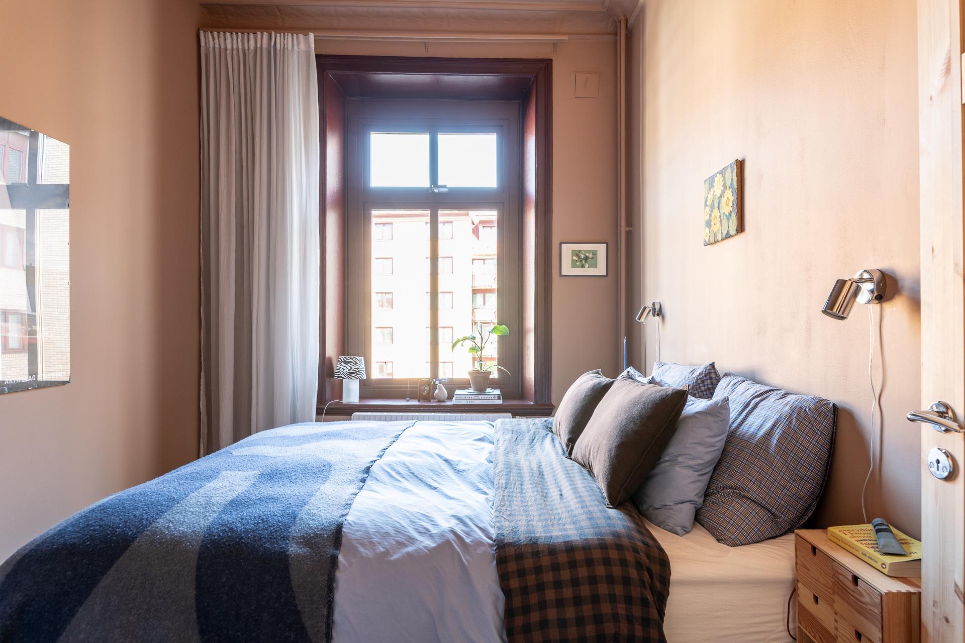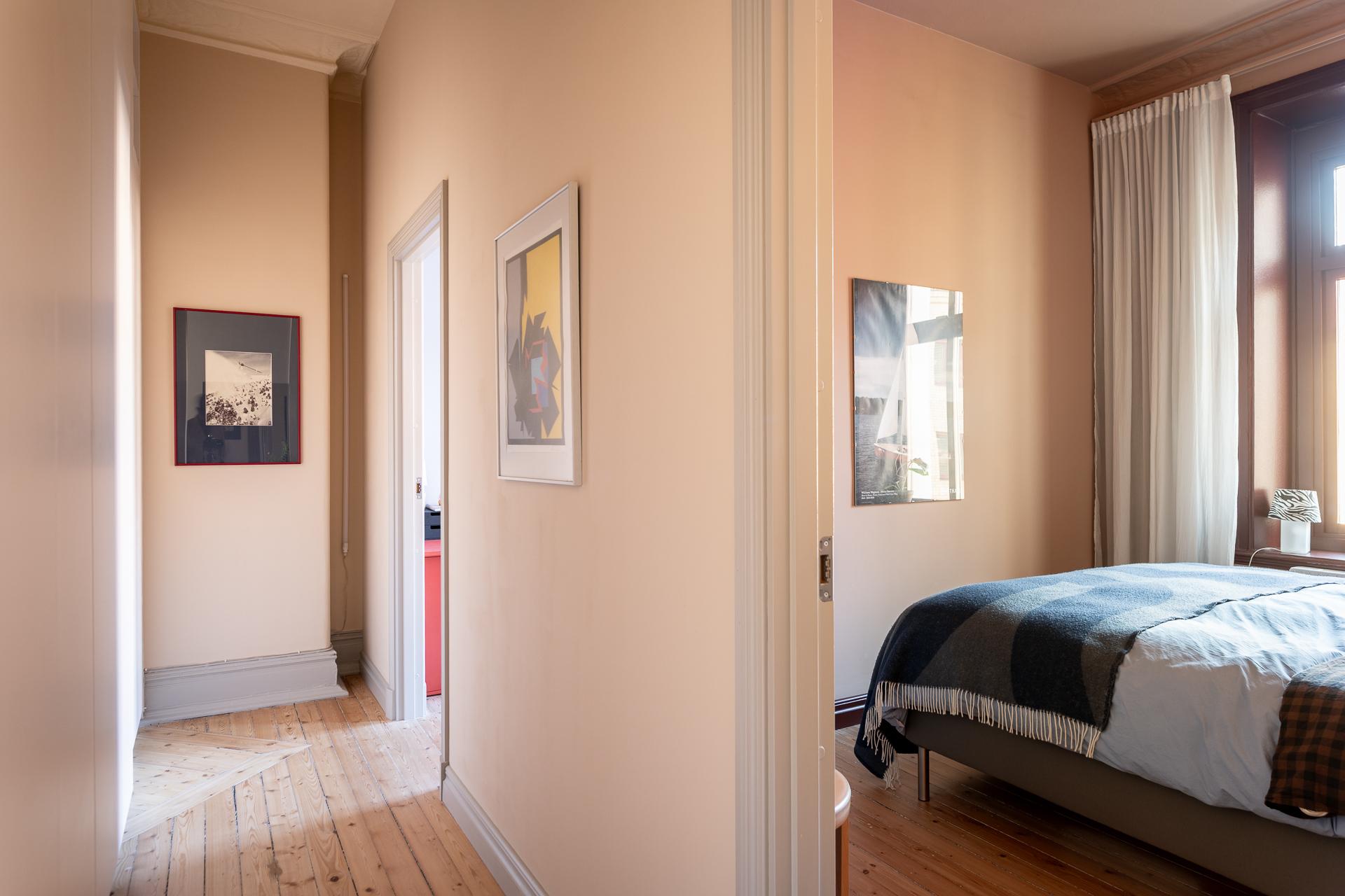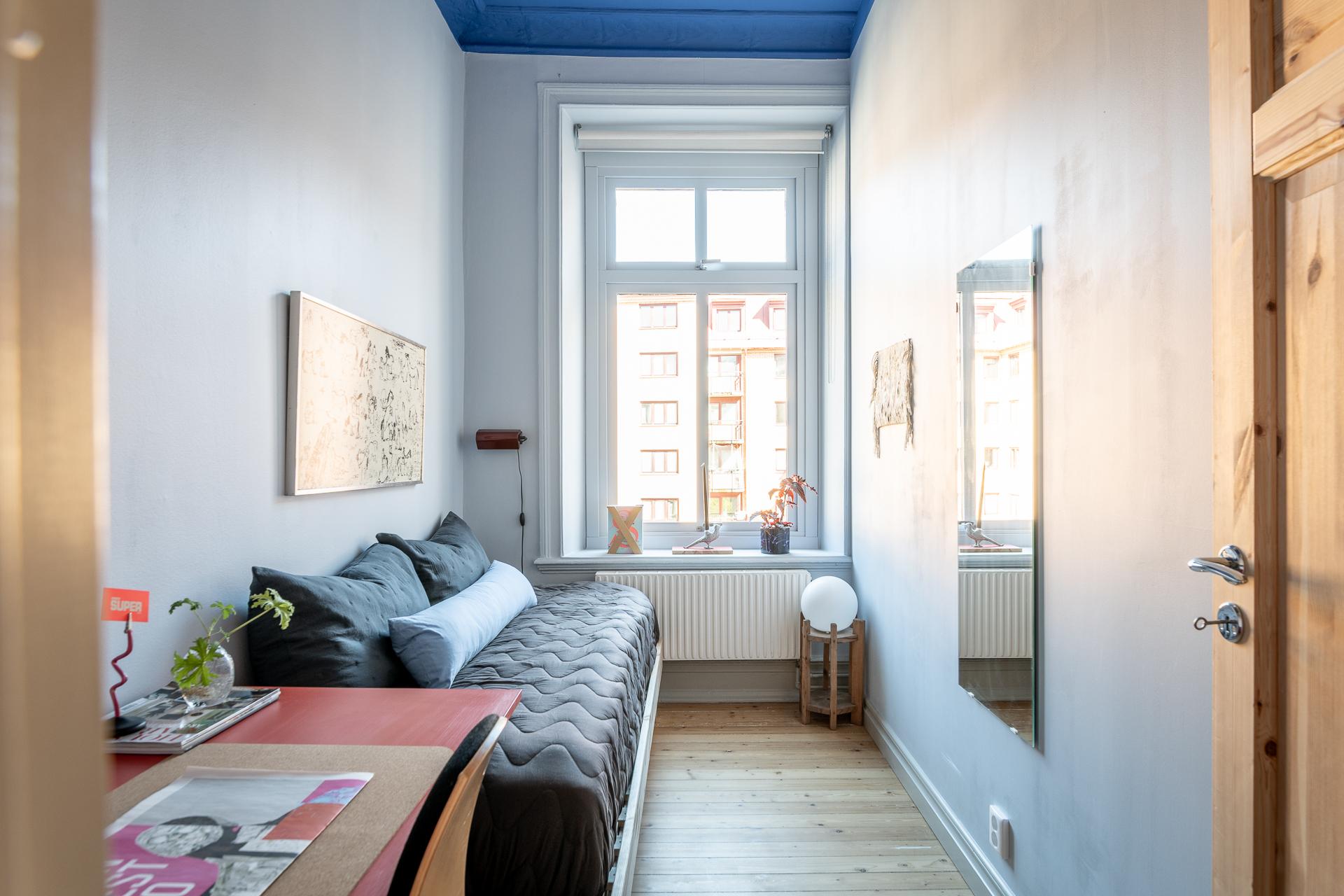 Det större sovrummet är generöst tilltaget och rymmer utan problem både dubbelsäng och sängbord. Rummet fungerar lika väl som ett lugnt allrum eller hemmakontor för den som önskar avskildhet. Tack vare läget mot gården är atmosfären rofylld och tyst, både dag och natt. Det vitlaserade brädgolvet samspelar fint med de ljusa väggarna, och den dekorativa stuckaturen tillsammans med takrosetten ger rummet en elegant inramning.