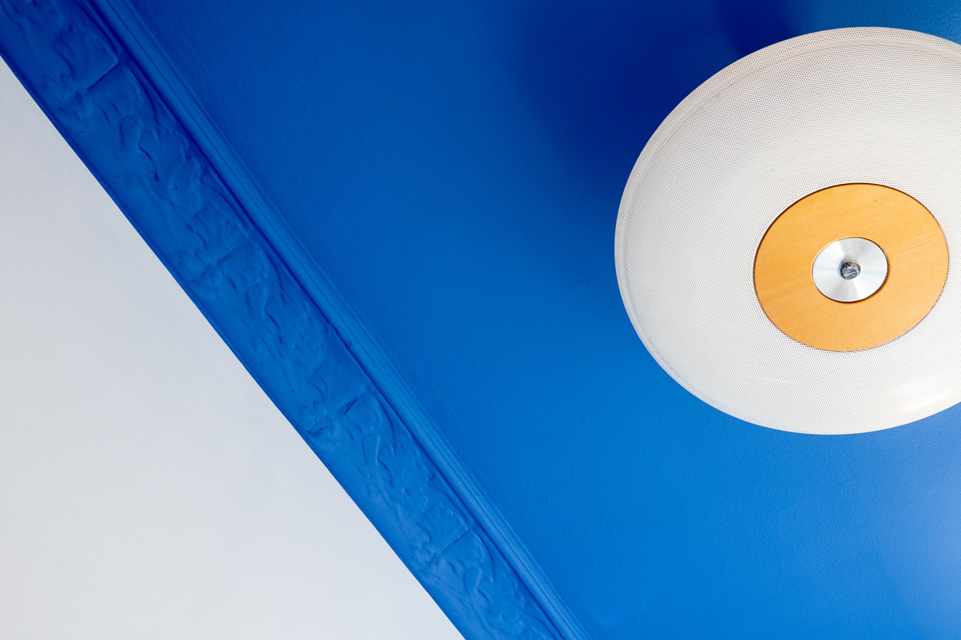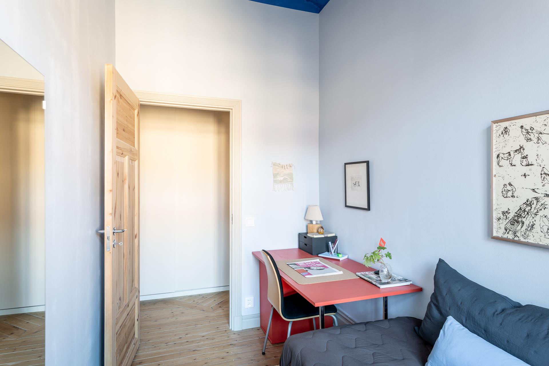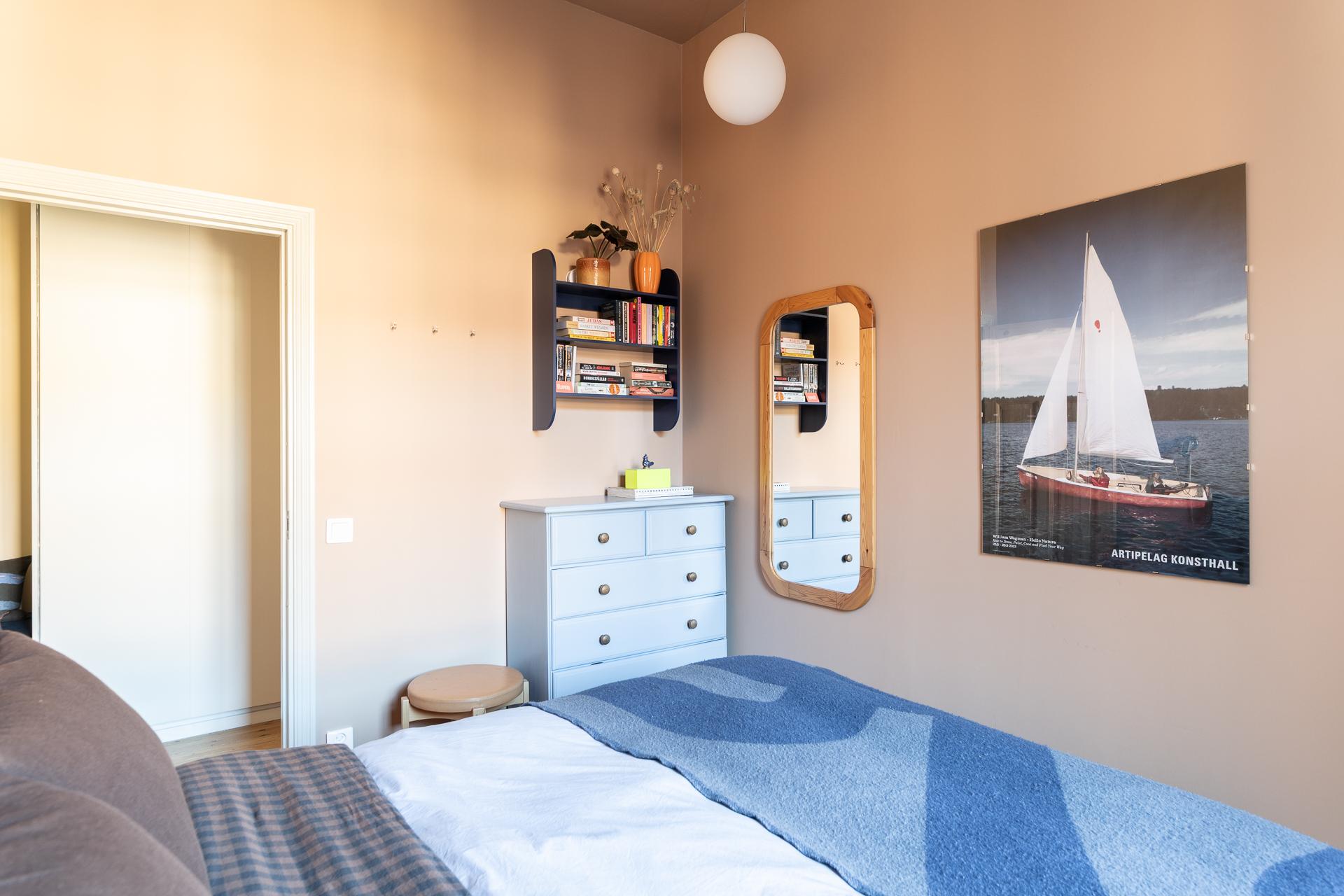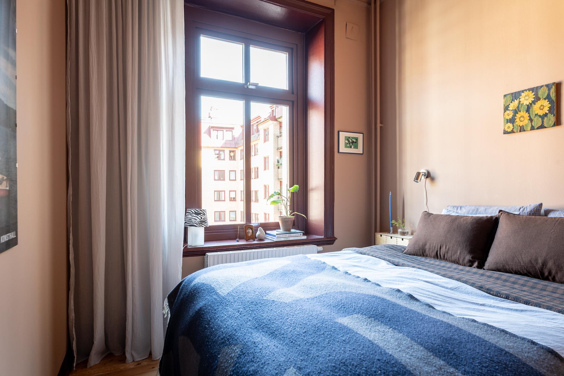 Det större sovrummet är generöst tilltaget och rymmer utan problem både dubbelsäng och sängbord. Rummet fungerar lika väl som ett lugnt allrum eller hemmakontor för den som önskar avskildhet. Tack vare läget mot gården är atmosfären rofylld och tyst, både dag och natt. Det vitlaserade brädgolvet samspelar fint med de ljusa väggarna, och den dekorativa stuckaturen tillsammans med takrosetten ger rummet en elegant inramning.
