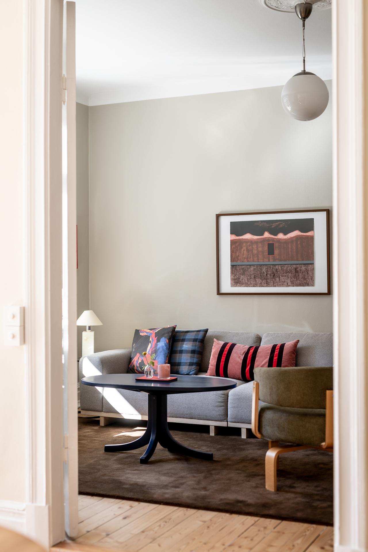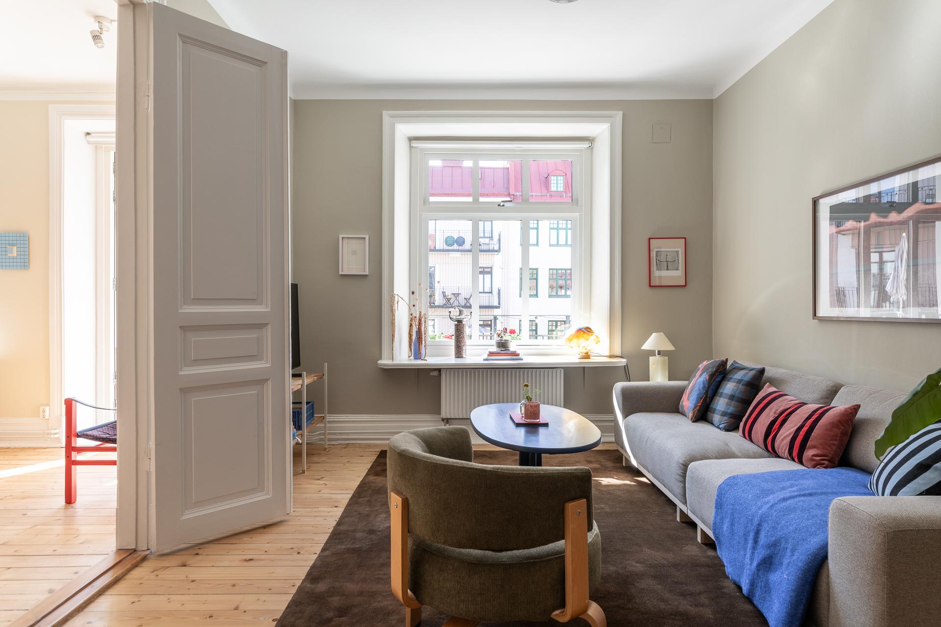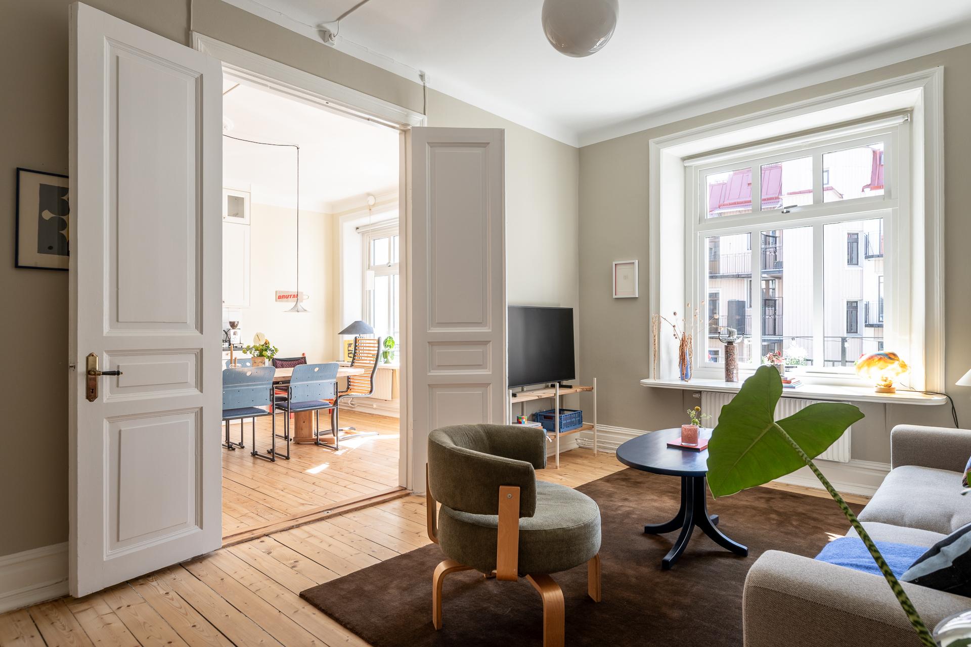 Vardagsrummet bjuder in till avkoppling och umgänge, med gott om plats för en stor soffgrupp. Längs ena väggen sträcker sig praktiska, inbyggda skjutdörrsgarderober från golv till tak, vilket ger utmärkta förvaringsmöjligheter utan att störa rummets harmoni. De målade väggarna i en mjuk, behaglig ton lyfter fram de vita originallisterna, och även här återfinns det vackra brädgolvet och en dekorativ takrosett.