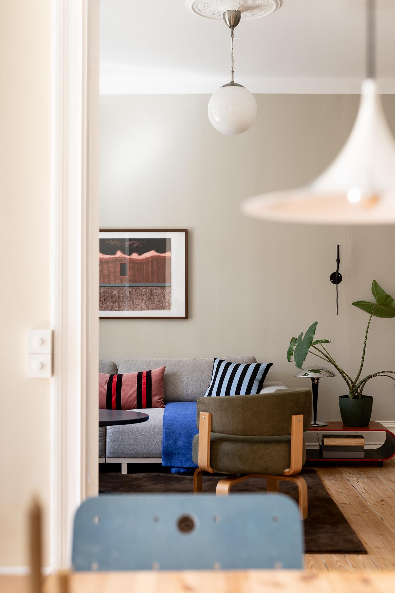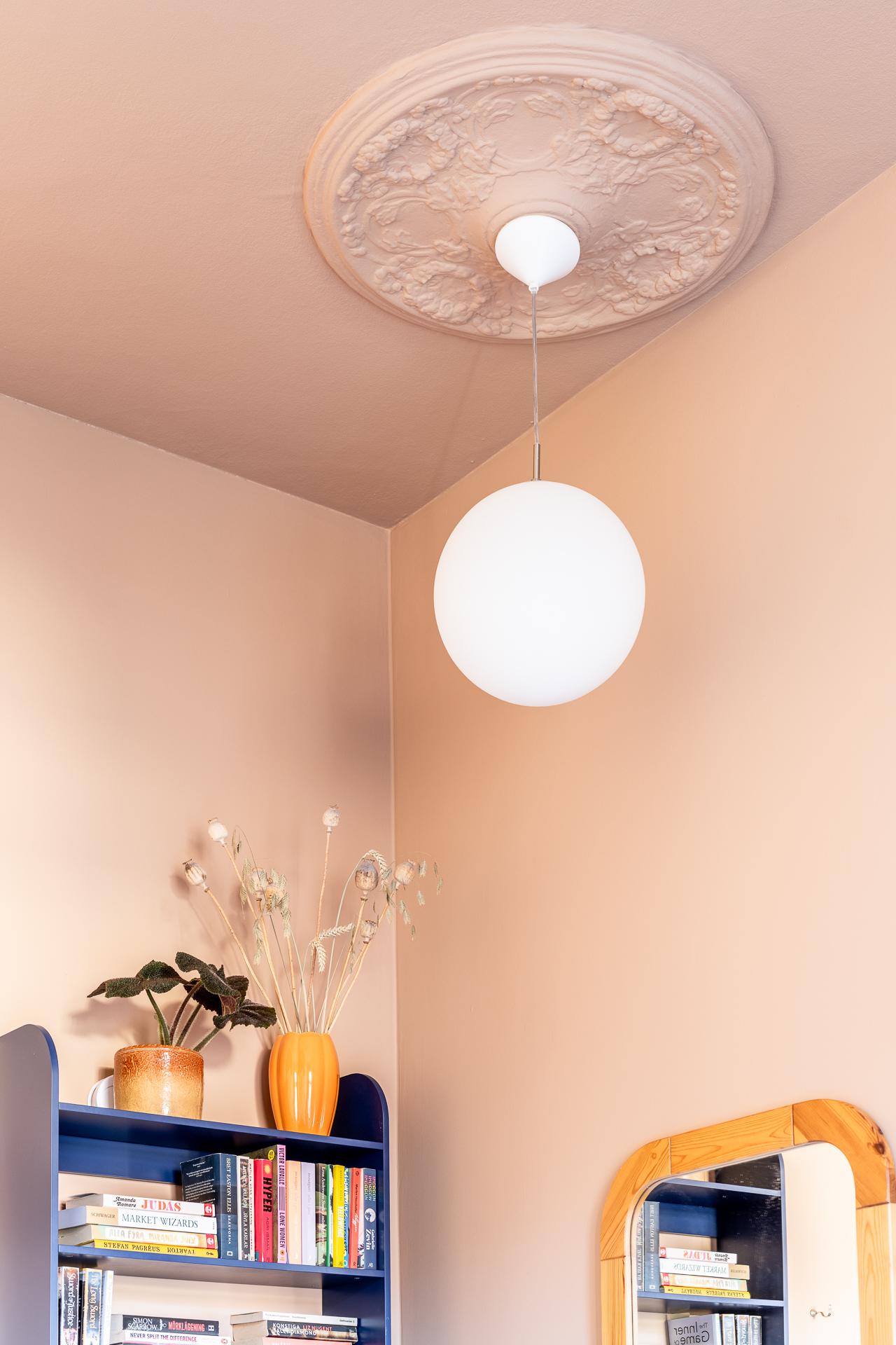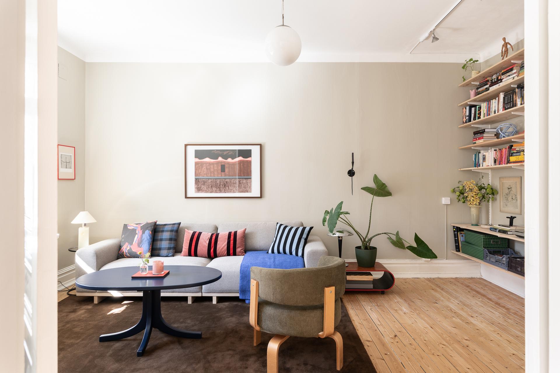 Vardagsrummet bjuder in till avkoppling och umgänge, med gott om plats för en stor soffgrupp. Längs ena väggen sträcker sig praktiska, inbyggda skjutdörrsgarderober från golv till tak, vilket ger utmärkta förvaringsmöjligheter utan att störa rummets harmoni. De målade väggarna i en mjuk, behaglig ton lyfter fram de vita originallisterna, och även här återfinns det vackra brädgolvet och en dekorativ takrosett.