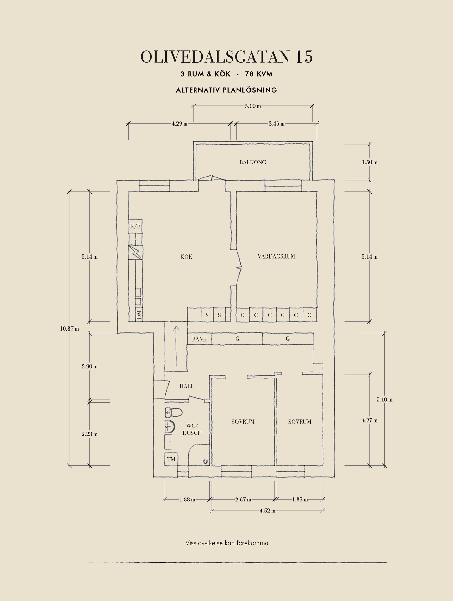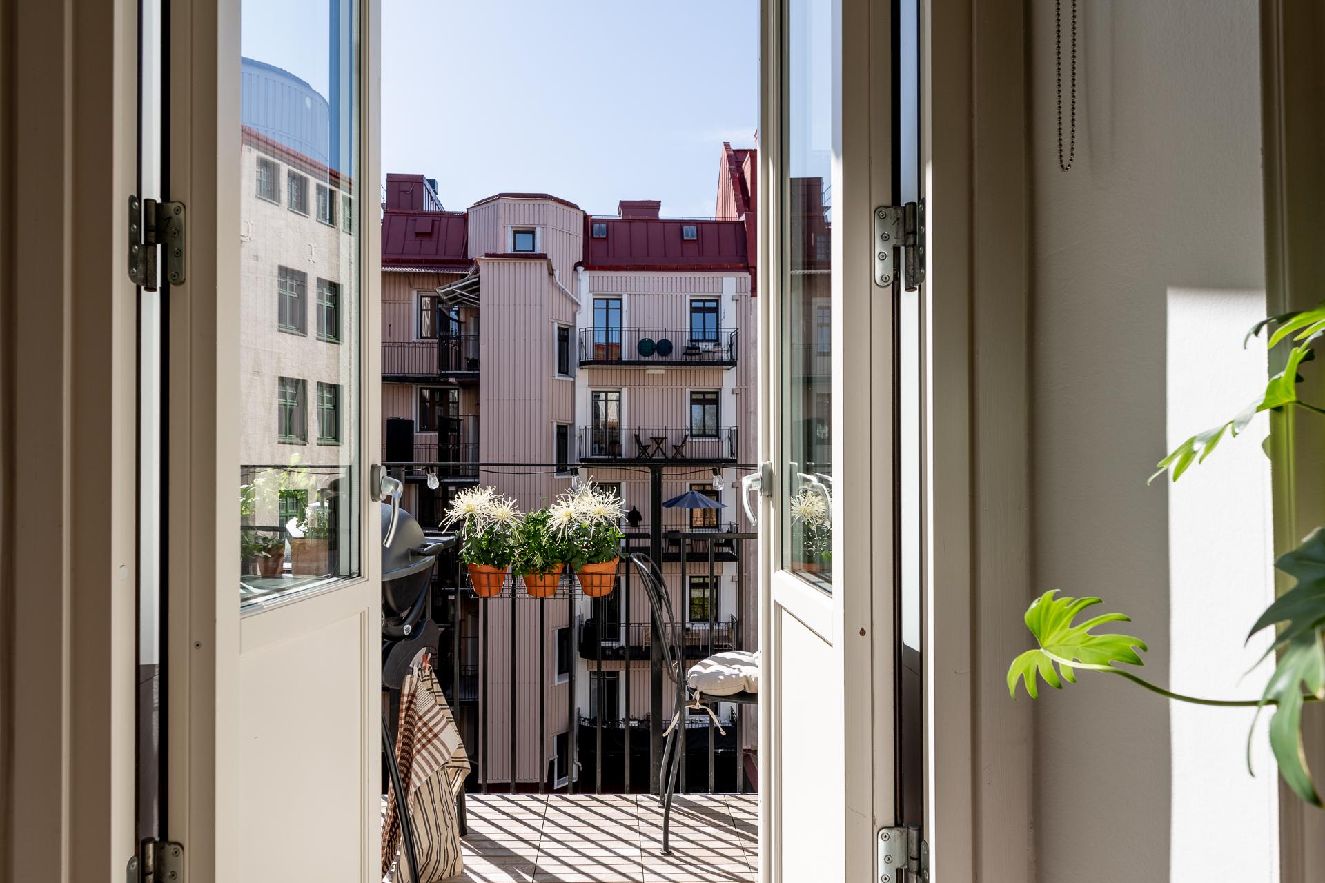 Mellan två stillsamma innergårdar på charmiga Olivedalsgatan finner du denna unika trerummare från sekelskiftet, generöst fördelad över 78 kvadratmeter. Lägenheten är belägen på fjärde våningen av fem, med tillgång till hiss, och de höga fönstren i djupa nischer fyller rummen med ett vackert och rikligt ljusinsläpp. Den stora balkongen i väster blir snabbt en favoritplats, där eftermiddags- och kvällssolen dröjer sig kvar och utsikten över takåsarna skapar en luftig, nästan svävande känsla. Planlösningen är social och inbjudande, med vardagsrum och kök i fil, elegant placerade några trappsteg upp från hallen – perfekt för både vardagsliv och middagar i gott sällskap. Här finns gott om utrymme att samla många gäster kring bordet. Föreningen är stabil med goda intäkter från tre lokaler och hyresrätter, och huset är utrustat med hiss för extra bekvämlighet.