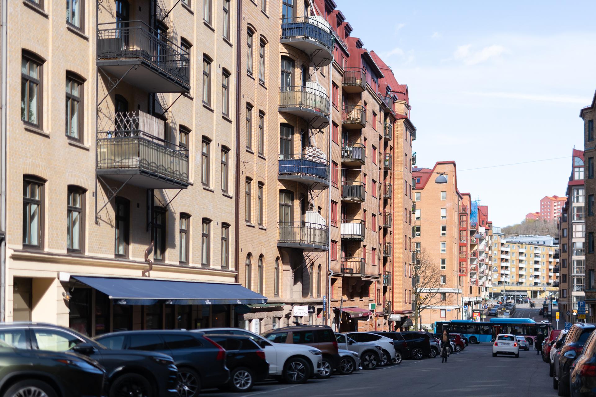 Huset uppfördes 1908 efter ritningar av arkitekten Gustaf W. Johansson. Gatufasaden bär tydliga drag av jugend, med sina mjukt välvda balkonger i sirligt svart smide. Den robusta bottenvåningen i grovhuggen sten kontrasteras av de ljusare våningsplanens diskreta murade dekorationer i låg relief. På den rofyllda gårdssidan, där lägenheten är belägen, öppnar sig en grönskande innergård som delas med grannfastigheterna – en trivsam oas med grillmöjligheter, utemöbler och en liten lekplats. Kvarteren präglas av en varm, småskalig charm, där lokala favoriter som Olivens Skafferi och Bistro Odette bidrar till områdets personliga karaktär. Runt hörnet väntar både Linnégatans livliga puls och Slottsskogens vidsträckta grönska, och med närhet till Änggårdsbergen och Botaniska trädgården finns naturen alltid inom räckhåll. Kommunikationerna är utmärkta – hållplatsen vid Olivedalsgatan nås på knappt en minut och erbjuder täta avgångar med både spårvagn och buss.