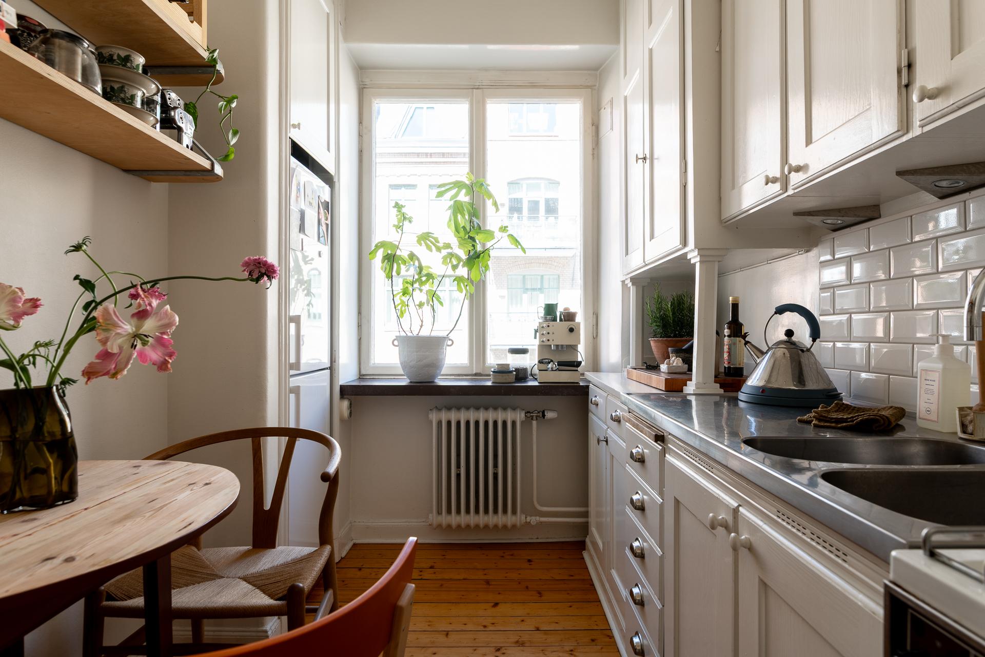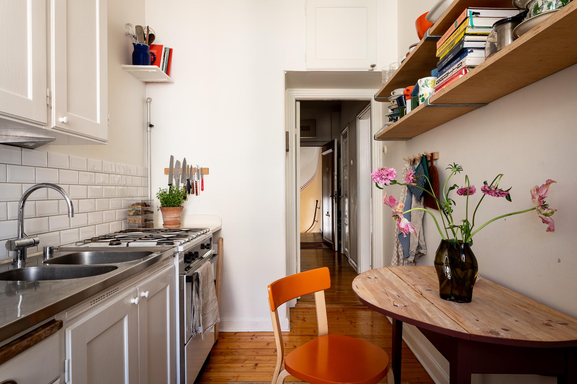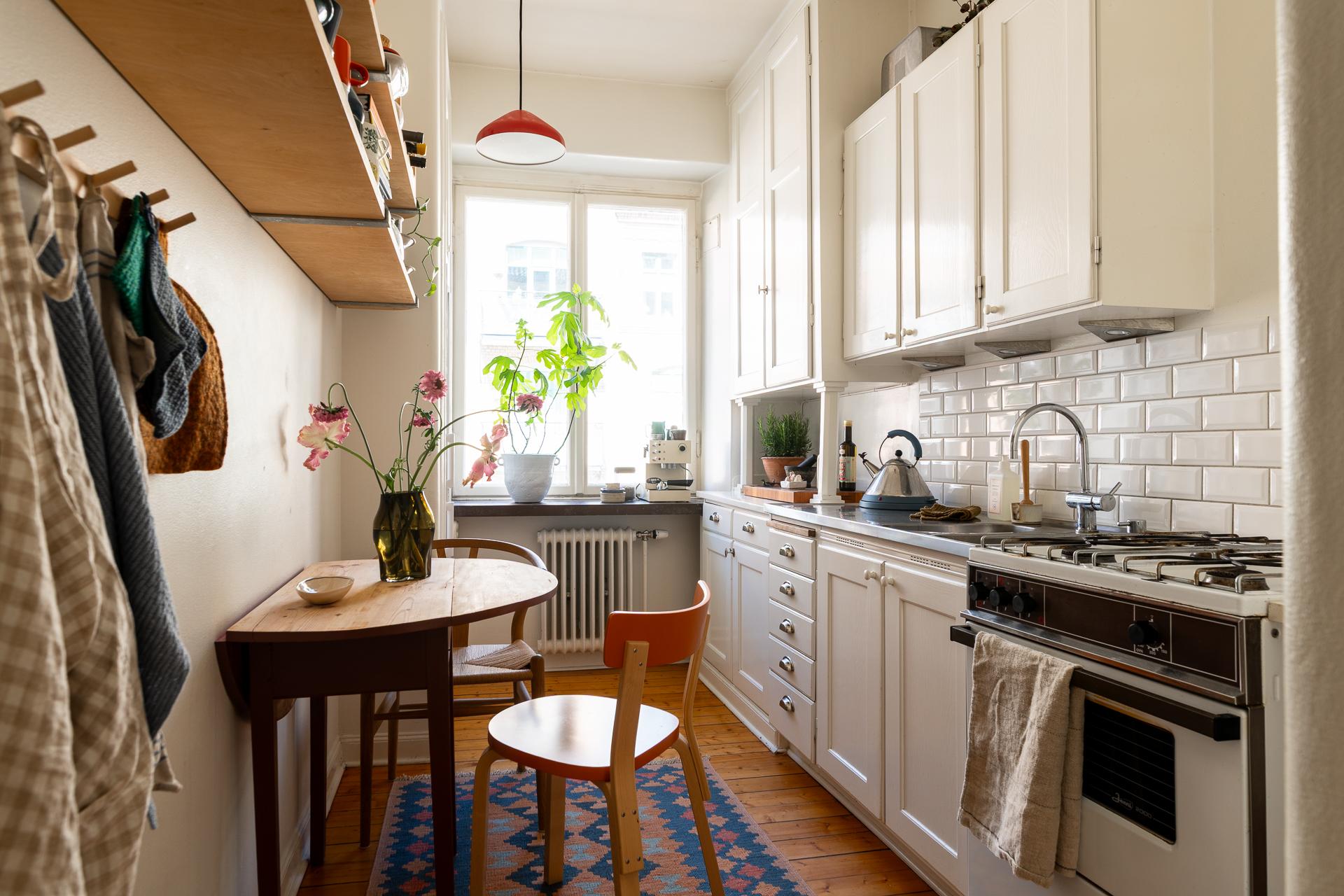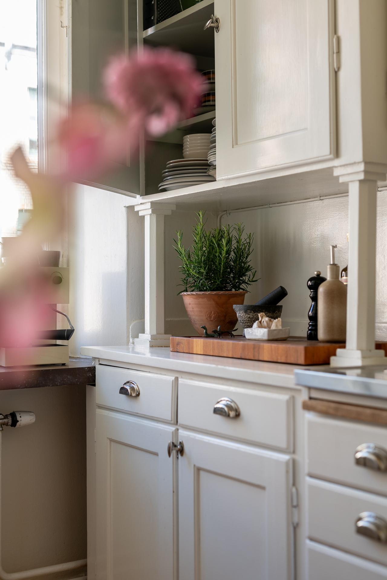 Rakt fram från hallen ligger köket – en plats där det tidstypiska möter moderna inslag på ett smakfullt sätt. Den ursprungliga köksinredningen med sina gedigna skåp och generösa förvaringsmöjligheter har bevarats och kompletterats med noggrant utvalda material. Här finns gasspis med ugn, kyl och frys, diskret integrerade i ett charmigt originalskafferi. Längst in i rummet släpper ett högt fönster in dagsljus och ger en fin kontakt med omgivningen.