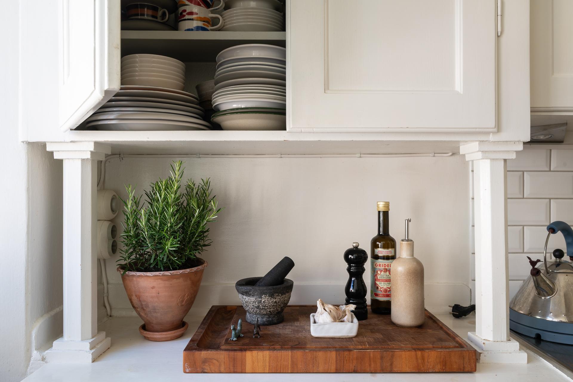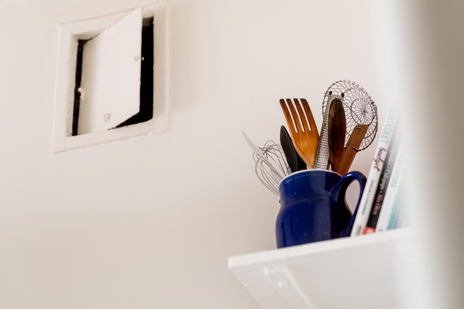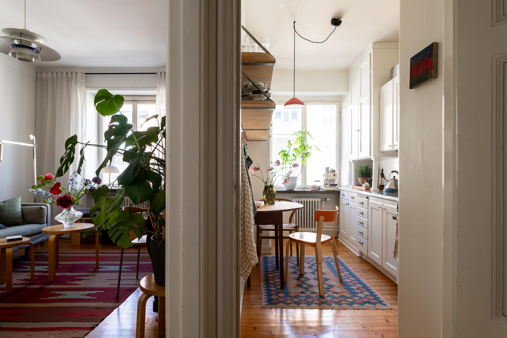 Rakt fram från hallen ligger köket – en plats där det tidstypiska möter moderna inslag på ett smakfullt sätt. Den ursprungliga köksinredningen med sina gedigna skåp och generösa förvaringsmöjligheter har bevarats och kompletterats med noggrant utvalda material. Här finns gasspis med ugn, kyl och frys, diskret integrerade i ett charmigt originalskafferi. Längst in i rummet släpper ett högt fönster in dagsljus och ger en fin kontakt med omgivningen.