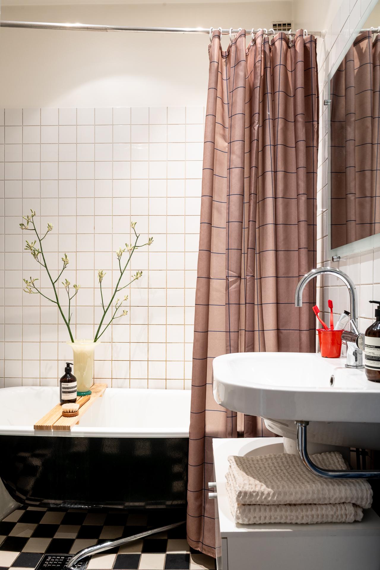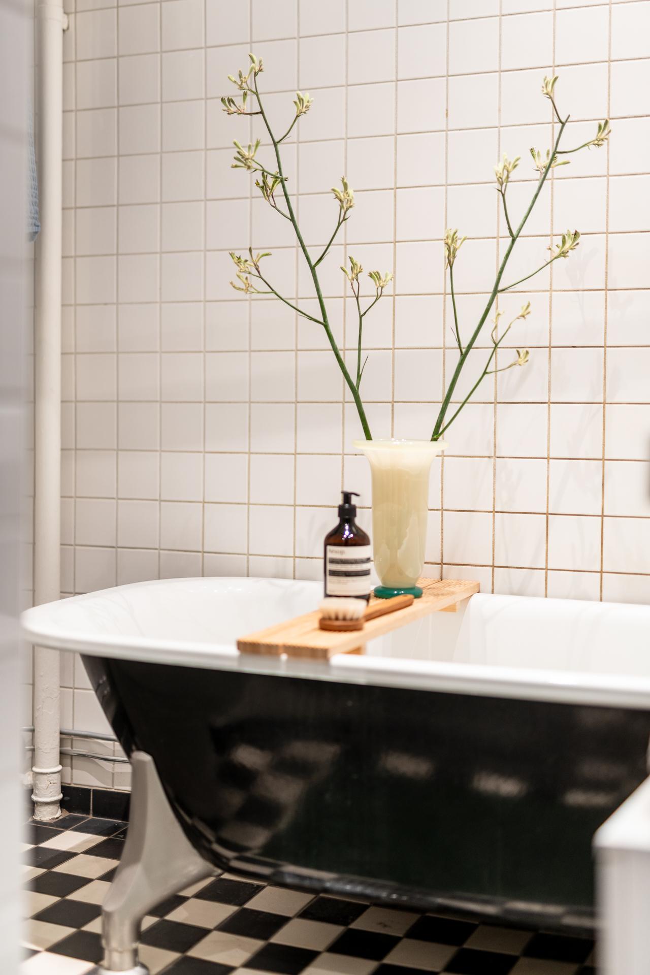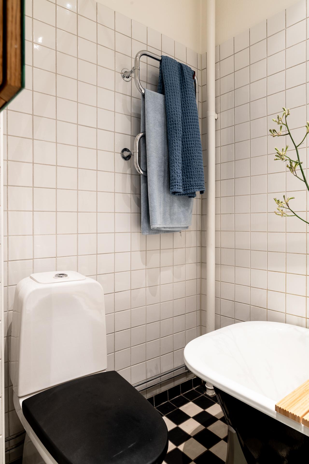 Badrummet nås från hallen och är funktionellt utformat med badkar, wc och kommod med spegel ovanför. Här finns även möjlighet att installera tvättmaskin för den som önskar. En väl avvägd kombination av material skapar ett stilrent och lättskött utrymme.