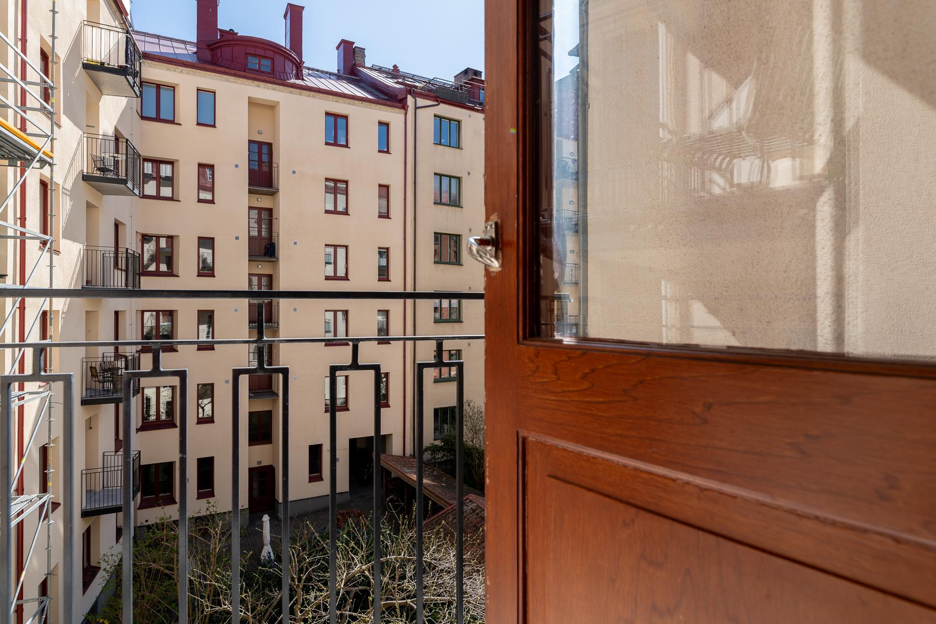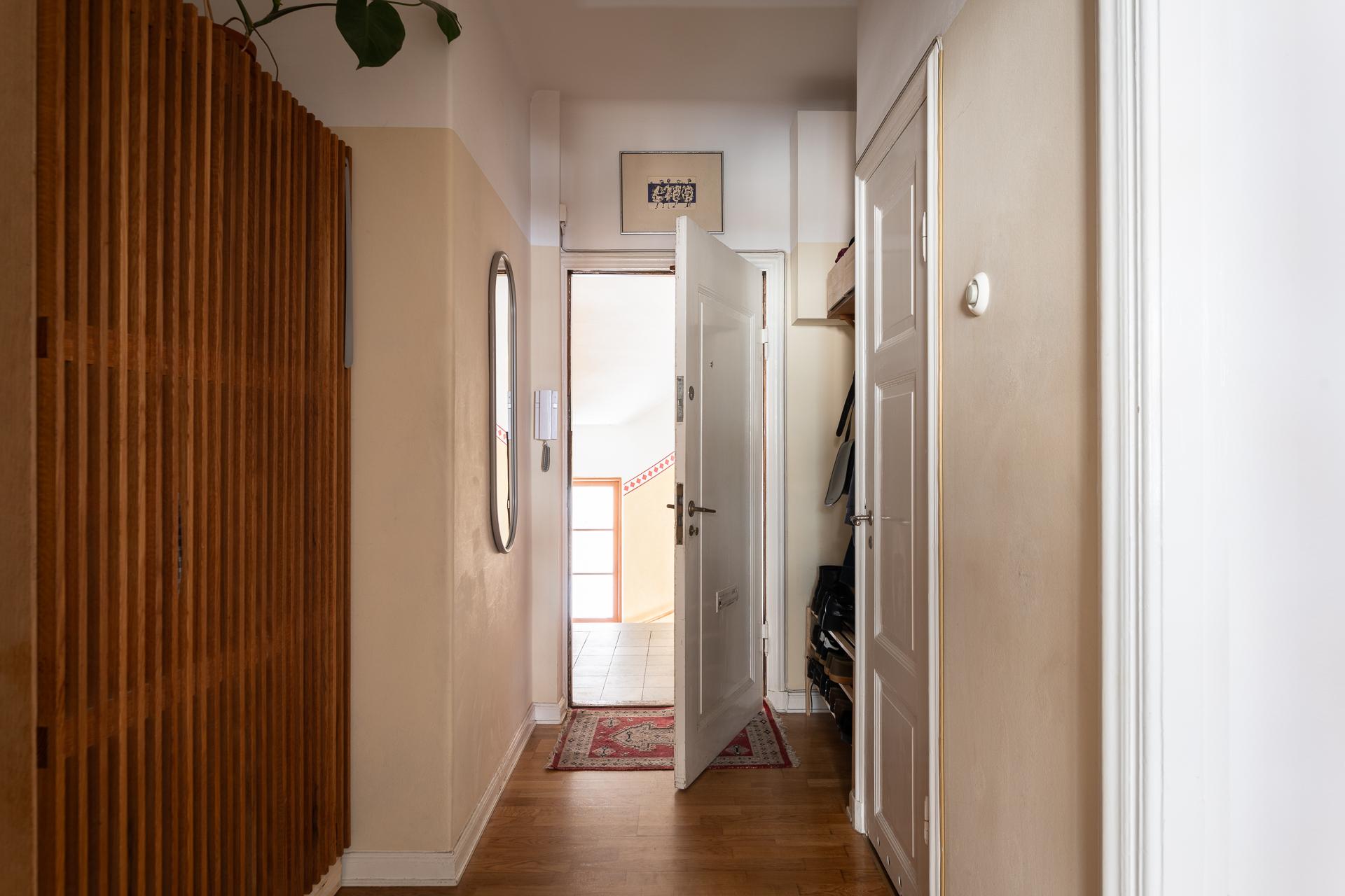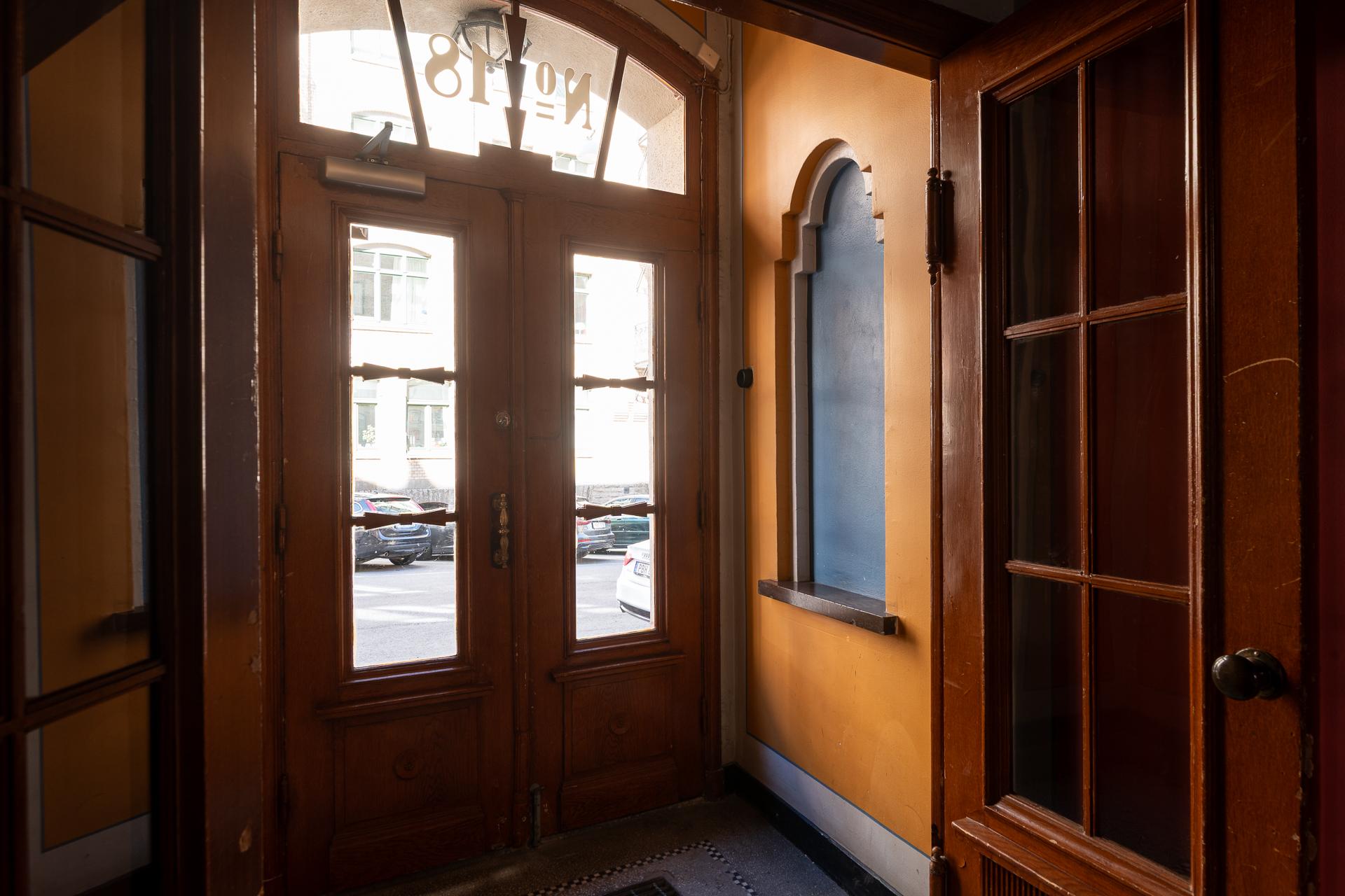 Redan i trapphuset möts du av en känsla av tidlös kvalitet. Detaljer som trappräcke, dörrar och hiss har tagits om hand med varsam hand och speglar husets ursprungliga karaktär. På varje våningsplan finns små vädringsbalkonger – perfekta för en stund i solen med en kopp kaffe. Lägenheten är belägen på tredje våningen, smidigt nåbar med hiss, och bjuder på klassiska attribut från 1920-talet såsom höga fönster, platsbyggd förvaring och vackra snickerier.