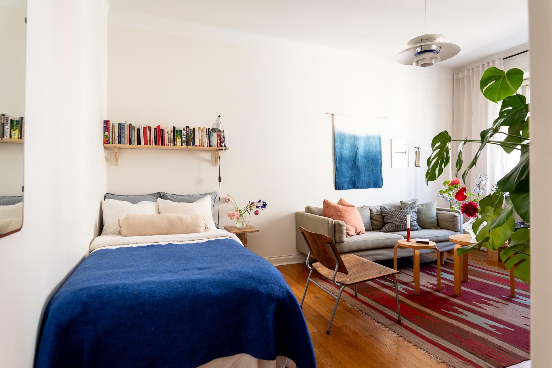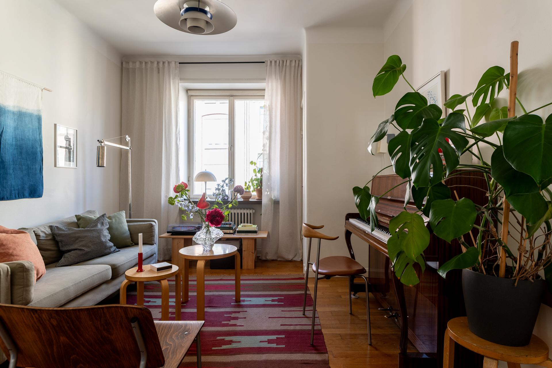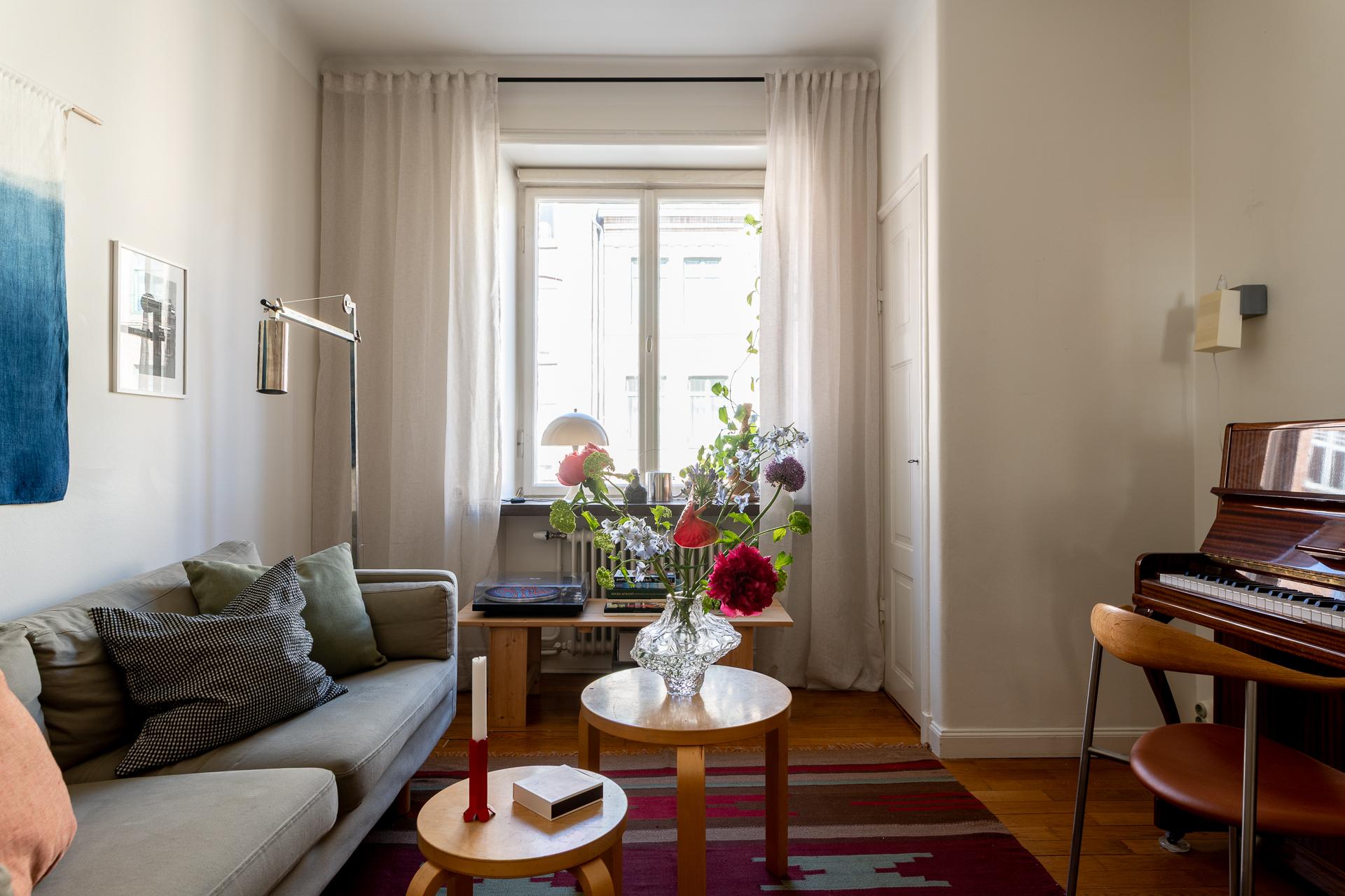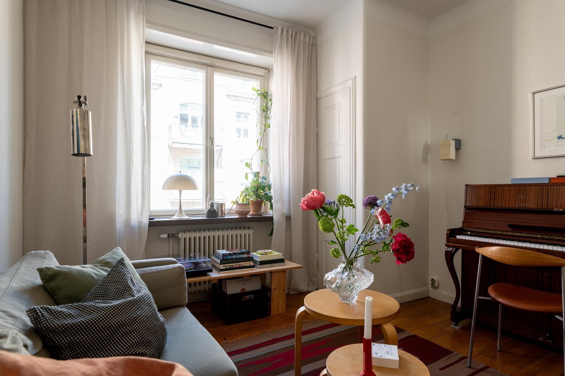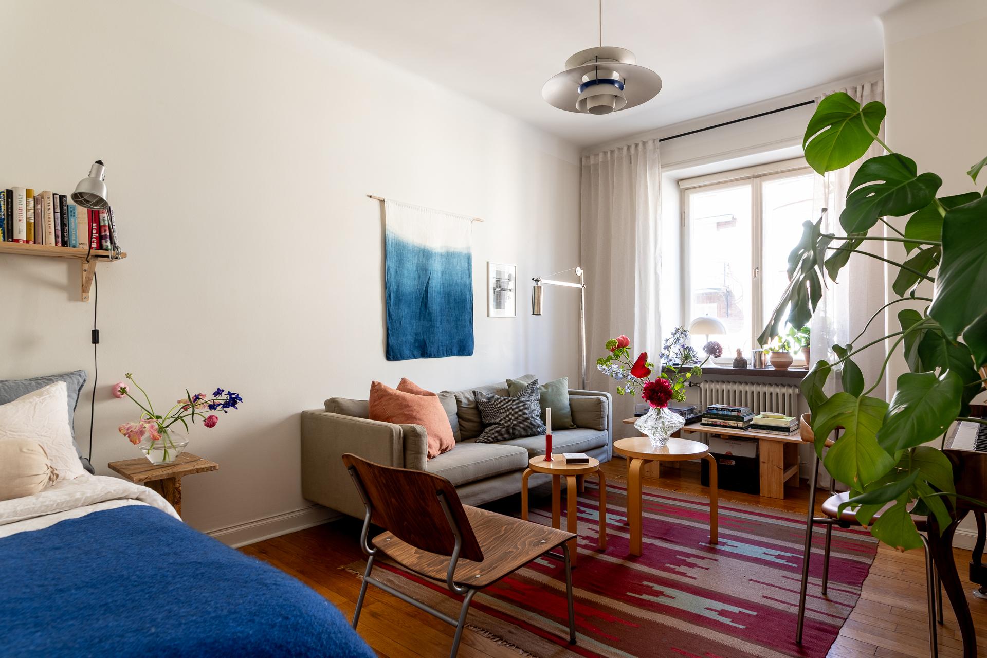 Bostadens allrum är både flexibelt och inbjudande, med plats för såväl säng som soffgrupp. Rummets storlek gör det möjligt att skapa en avskild sovdel för den som önskar. Bevarade detaljer som garderob, fönsterparti, element och takrosett ger rummet en tydlig karaktär och förstärker känslan av historia. Samtidigt upplevs atmosfären lugn och avskild, som en stilla kontrast till stadslivet utanför.