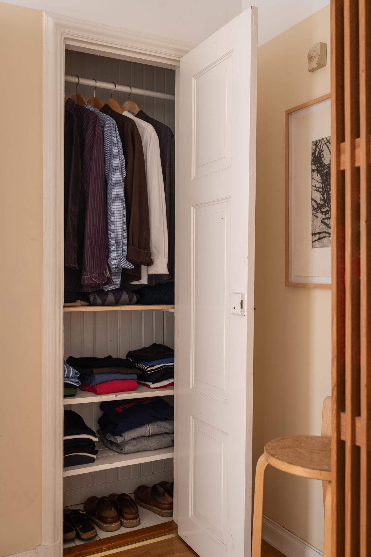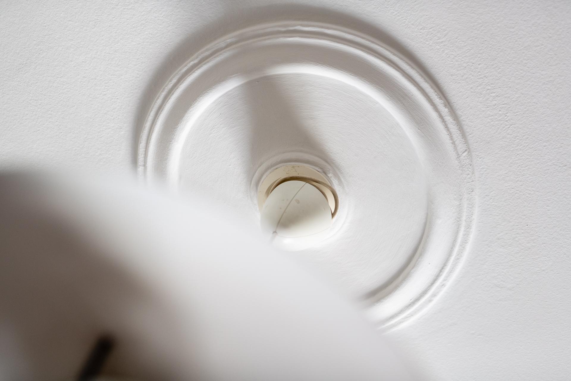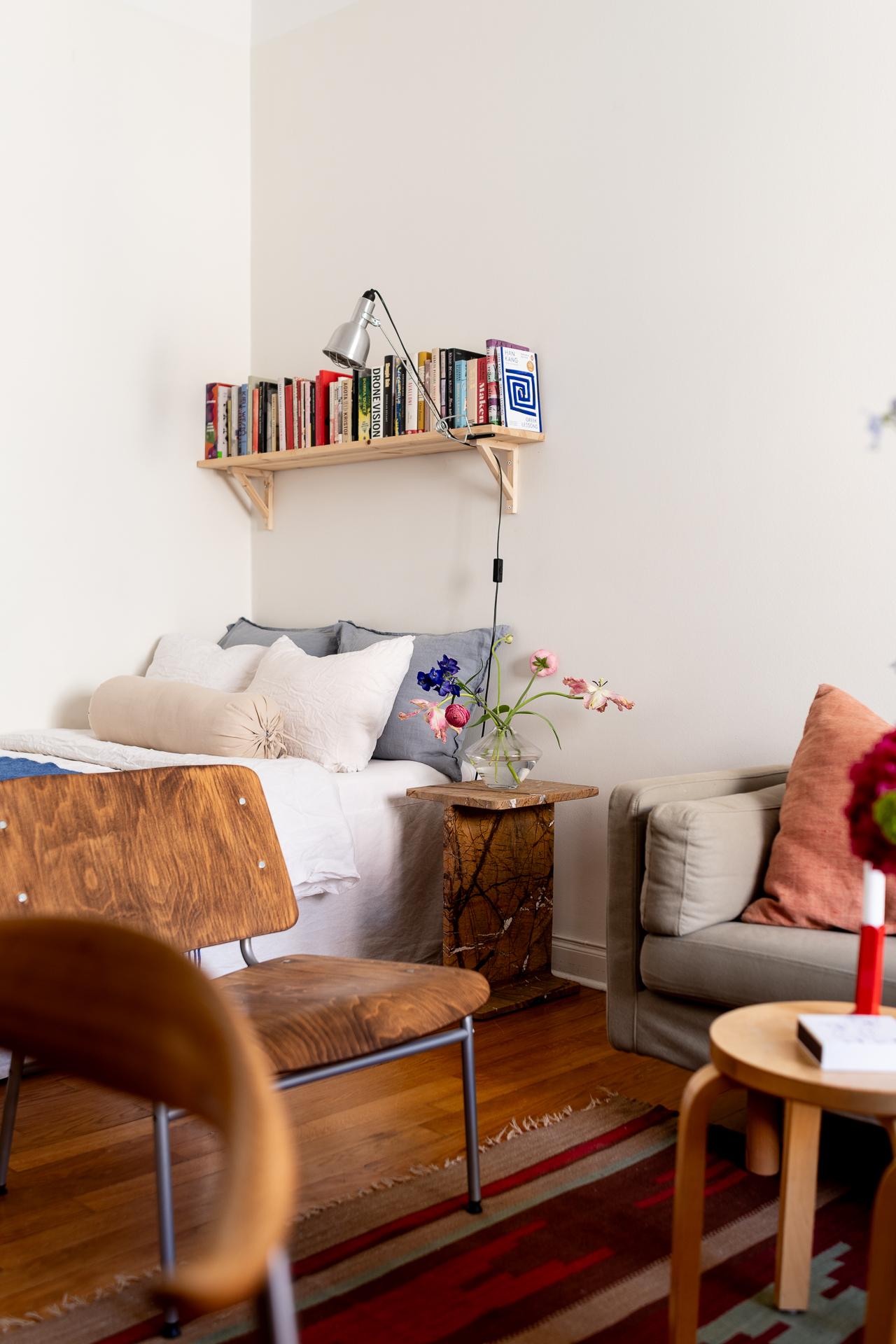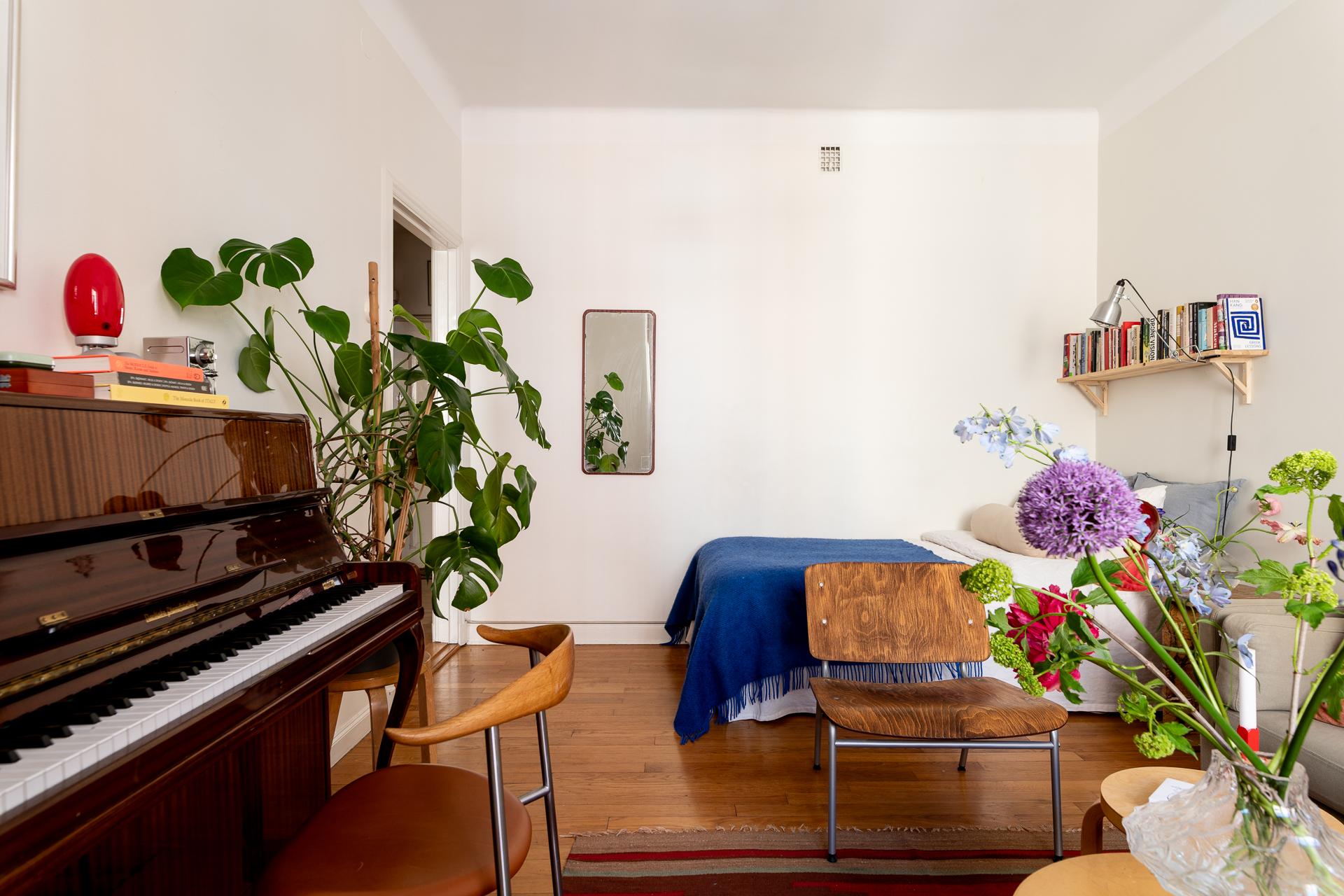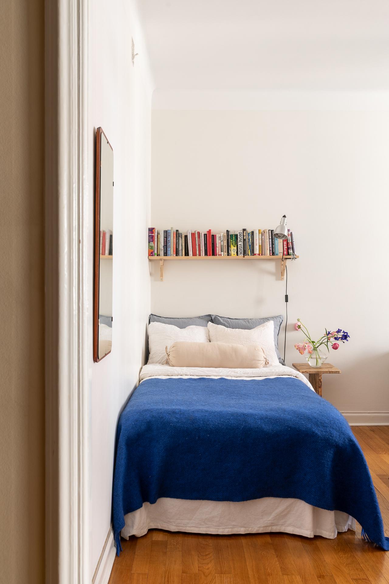 Bostadens allrum är både flexibelt och inbjudande, med plats för såväl säng som soffgrupp. Rummets storlek gör det möjligt att skapa en avskild sovdel för den som önskar. Bevarade detaljer som garderob, fönsterparti, element och takrosett ger rummet en tydlig karaktär och förstärker känslan av historia. Samtidigt upplevs atmosfären lugn och avskild, som en stilla kontrast till stadslivet utanför.