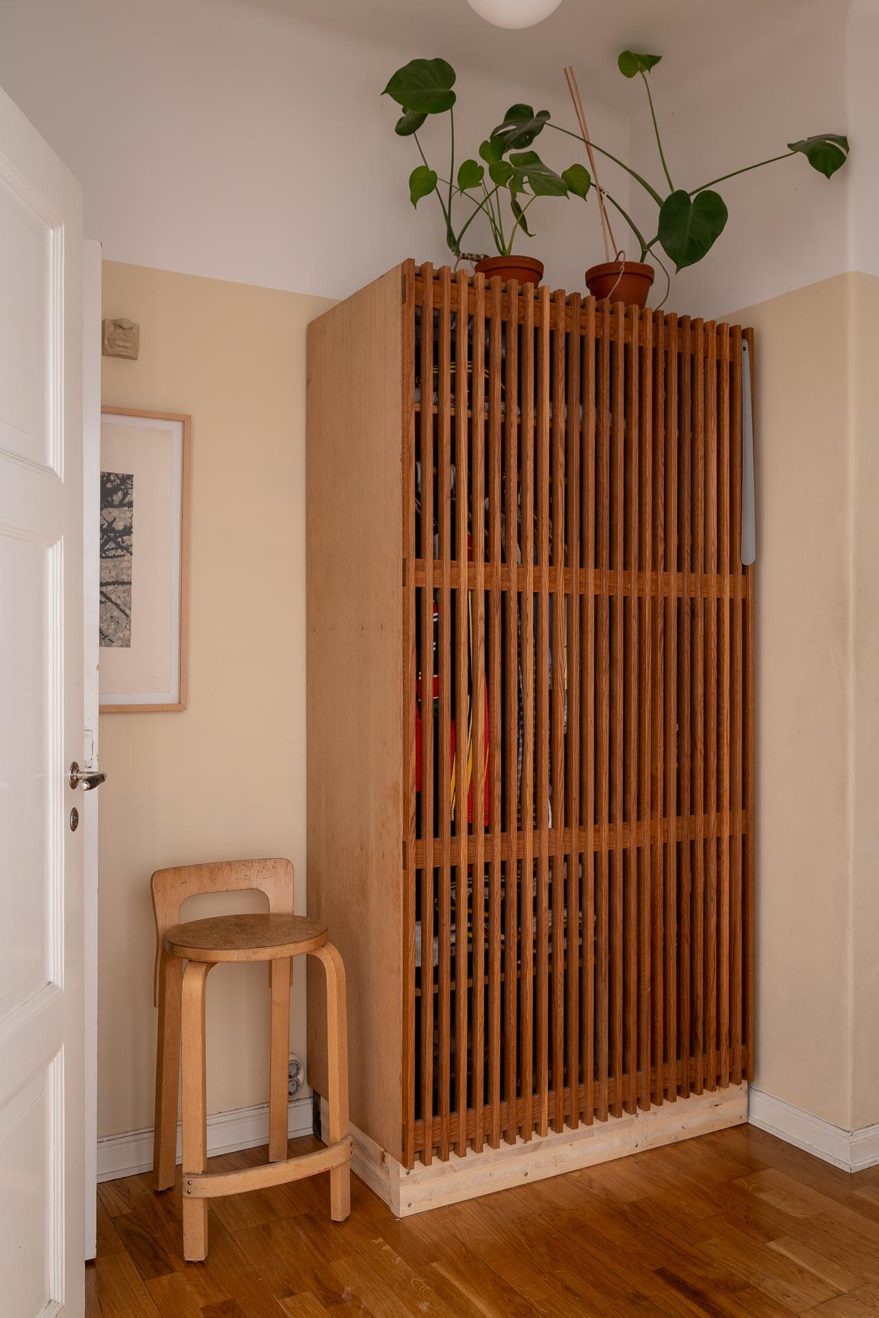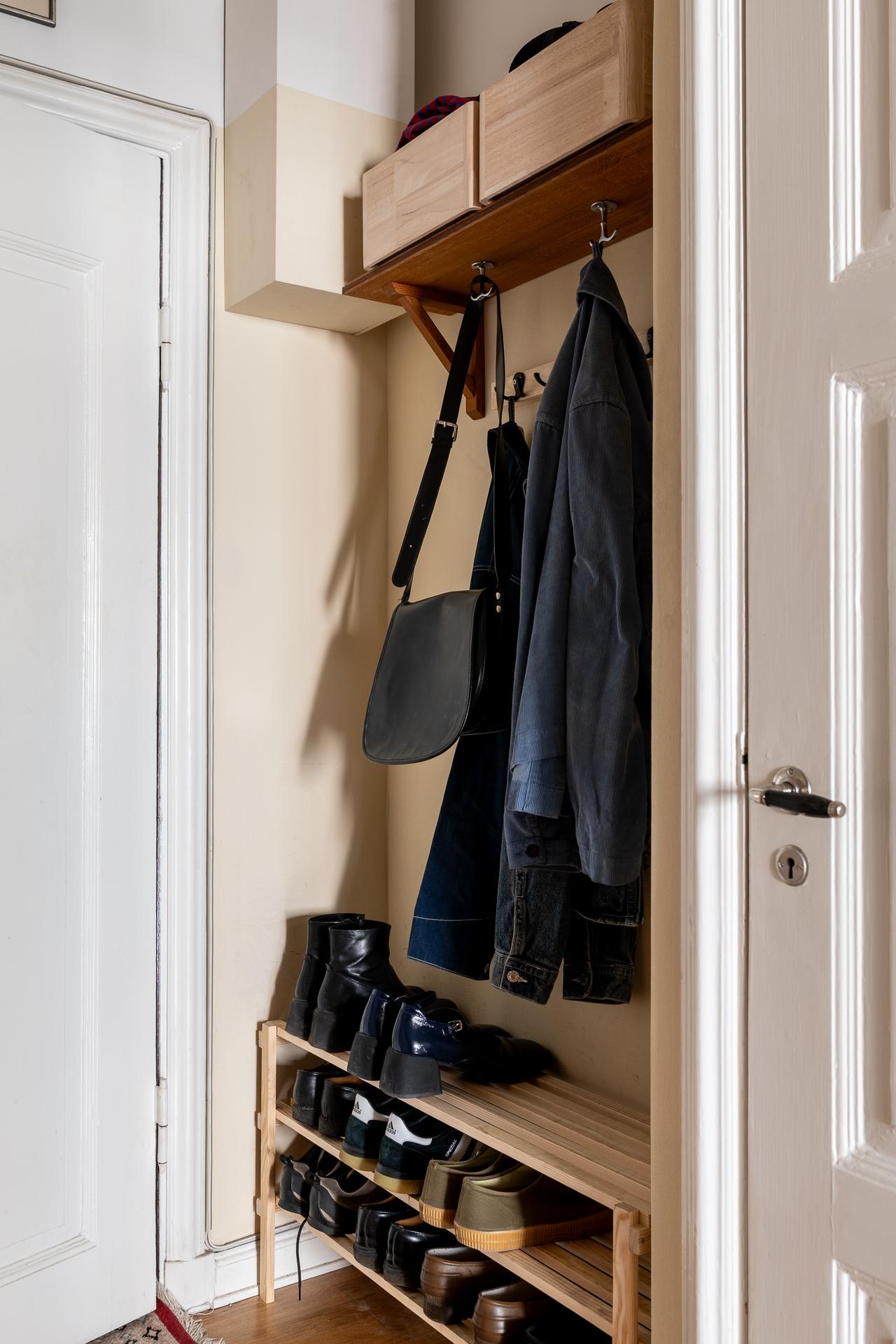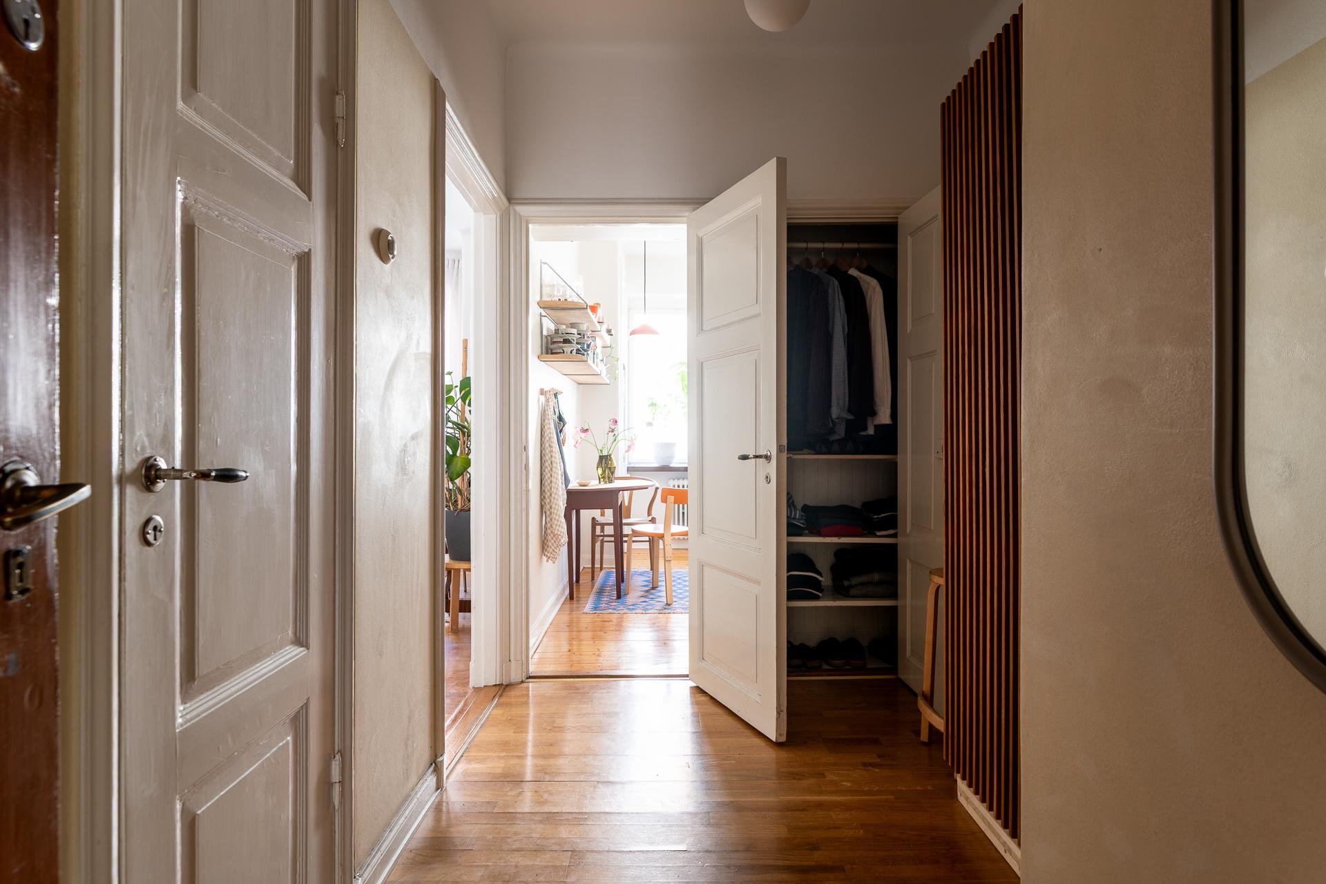 Hallen välkomnar med rymd och en luftig känsla tack vare den generösa takhöjden. Här finns gott om plats att hänga av sig direkt vid entrén, och längre in öppnar ytan upp sig och ger möjlighet till en arbetsplats eller extra förvaring. I anslutning finns även en rymlig garderob som smälter in i helheten.
