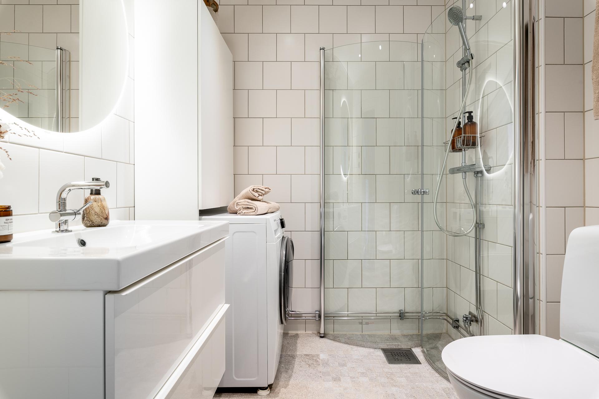 - Övriga utrymmen: Bostadsrättsinnehavaren nyttjar ett källarförråd. På gården finns uteplats med trädgårdsmöbler, pergola, och grill. I källaren finns tre gemensamma tvättstugor i uppgångarna 26-30. I varje tvättstuga finns två tvättmaskiner, en torktumlare, och ett torkrum. Det finns även mangel- och strykrum. Cykelrum finns i källaren.