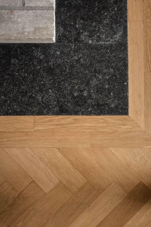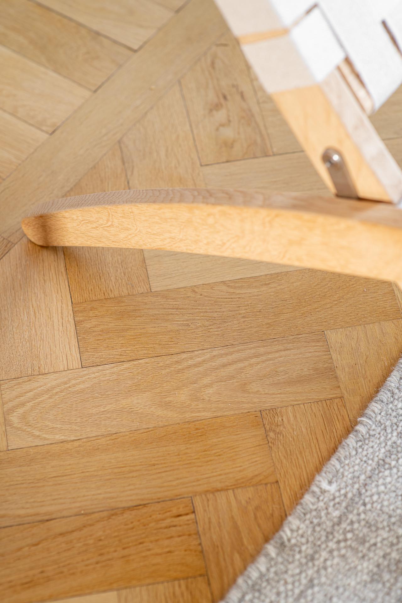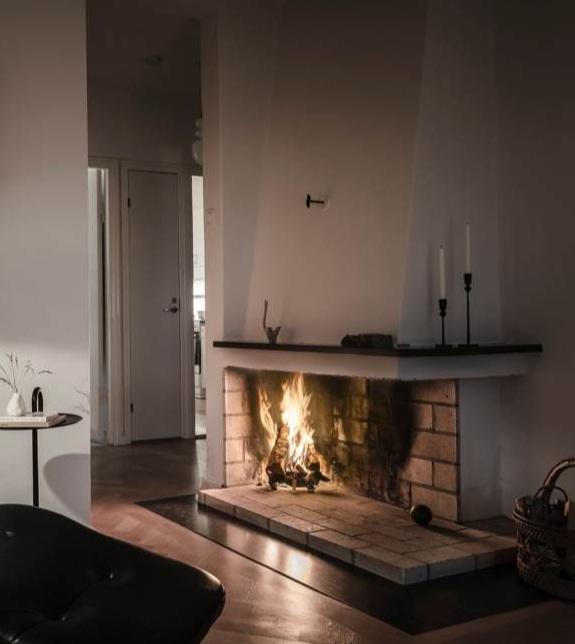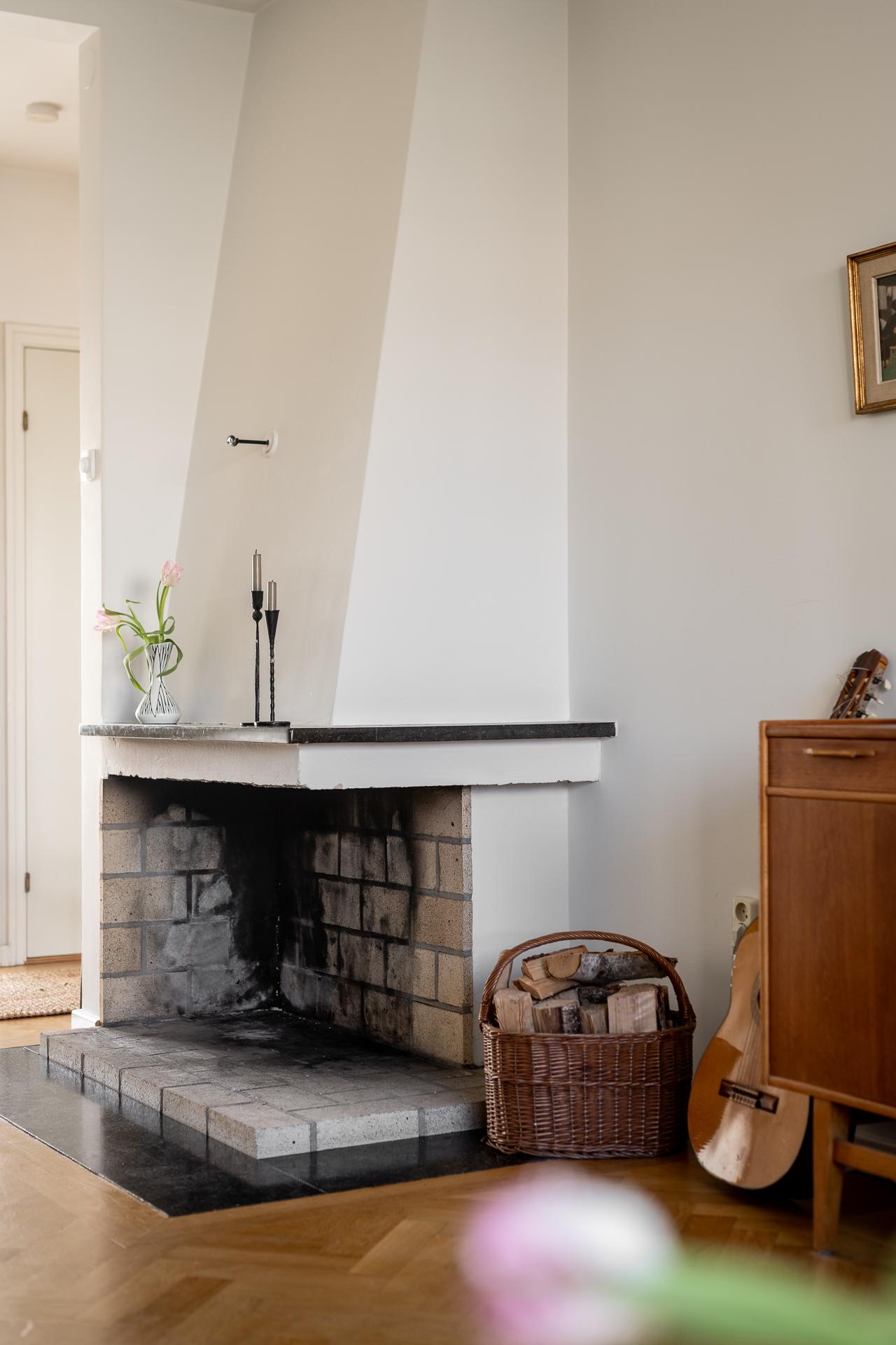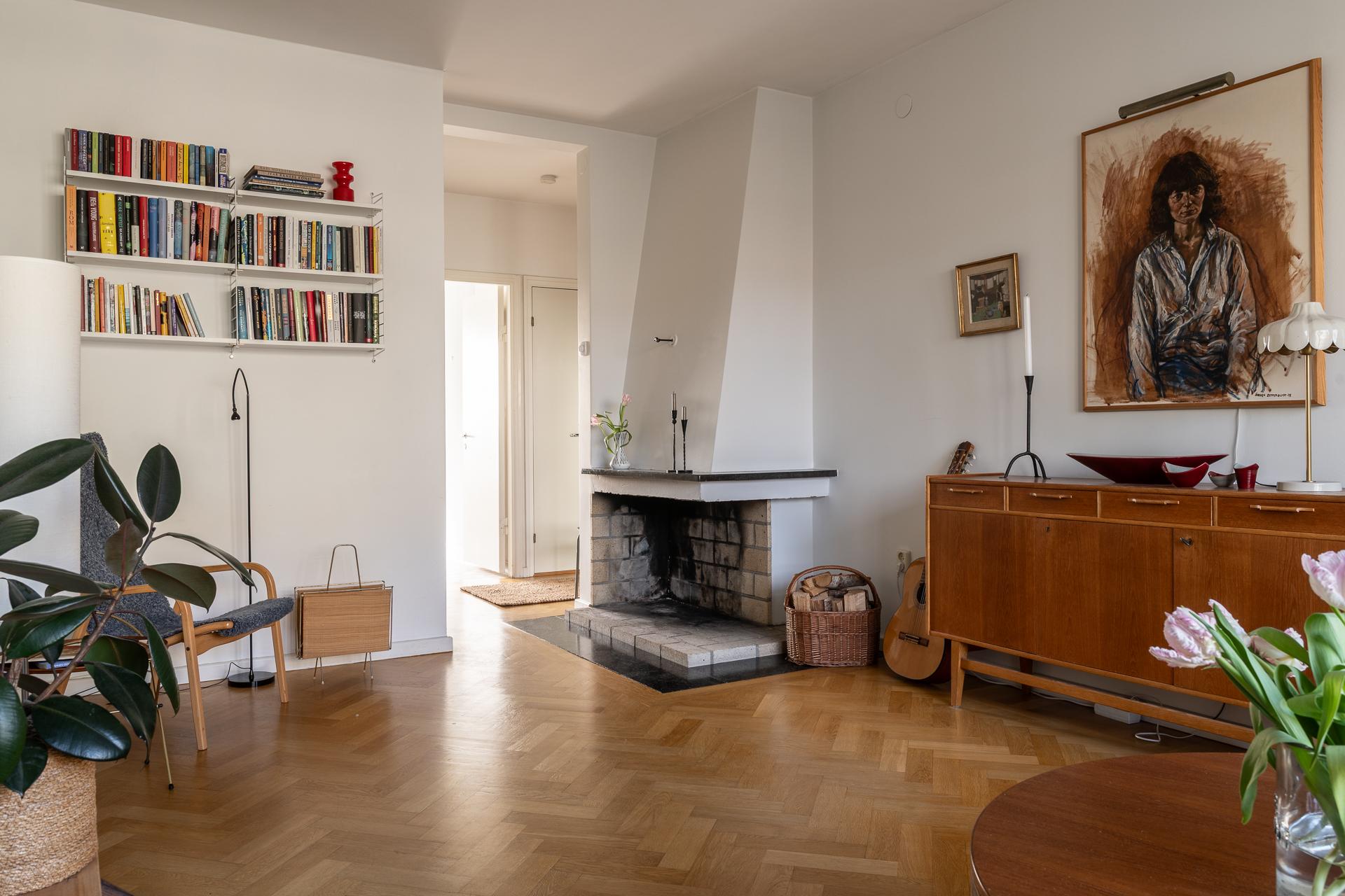 Vardagsrummet är hemmets hjärta – en social och inbjudande plats för både umgänge och avkoppling. Här ryms soffa, fåtölj och eventuellt en mindre matgrupp. Det stora fönsterpartiet tillsammans med takhöjden skapar ett ljust och luftigt rum. Den fungerande öppna spisen med stenkrans ger både estetiskt värde och härlig stämning. Golvet är lagt i klassiskt fiskbensmönster och väggarna är ljust målade.