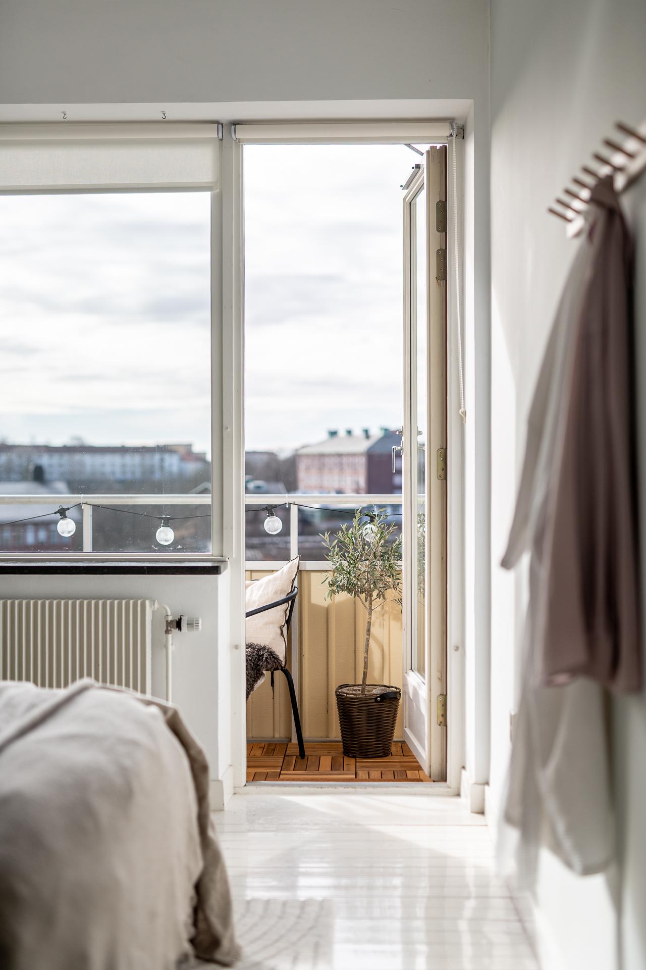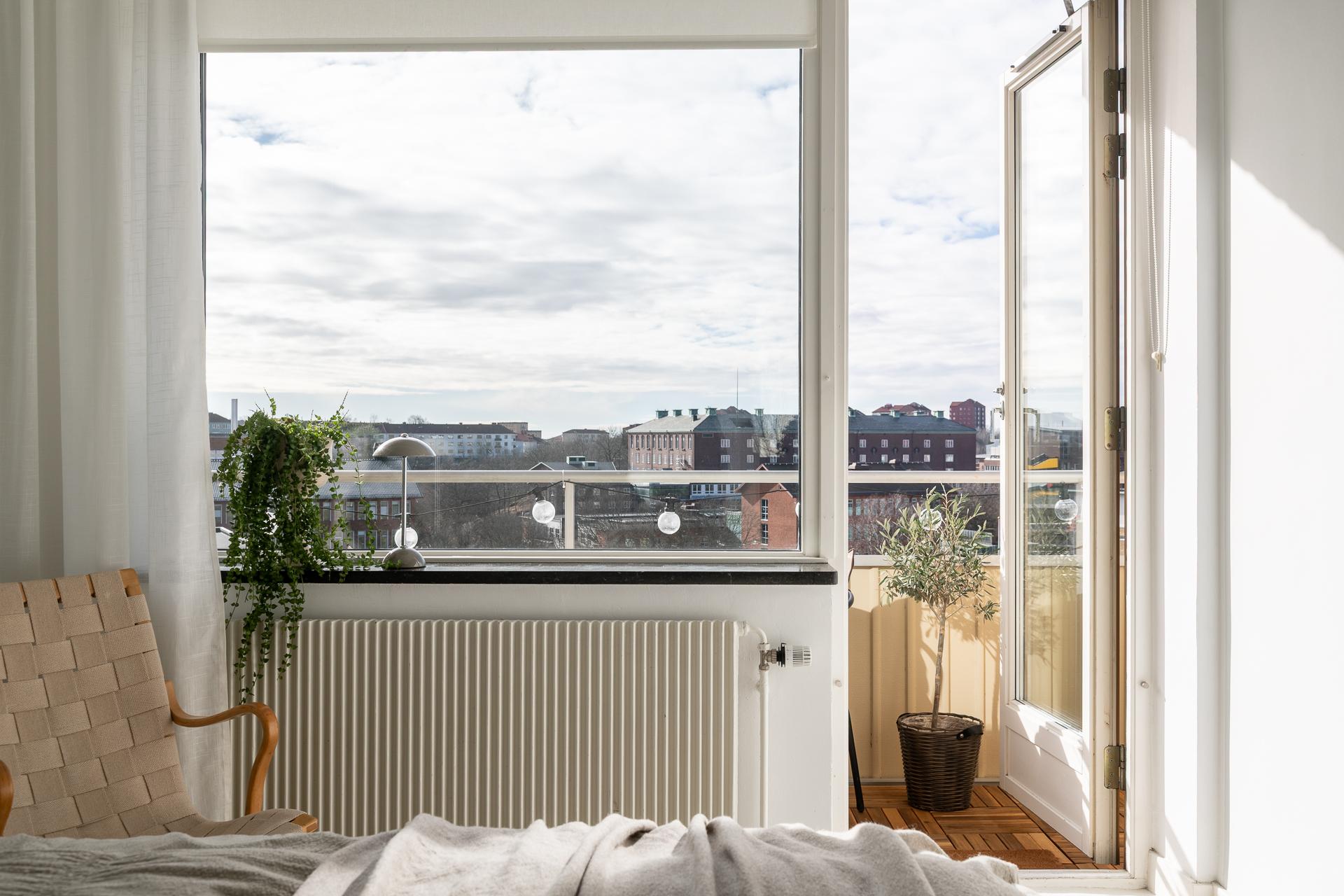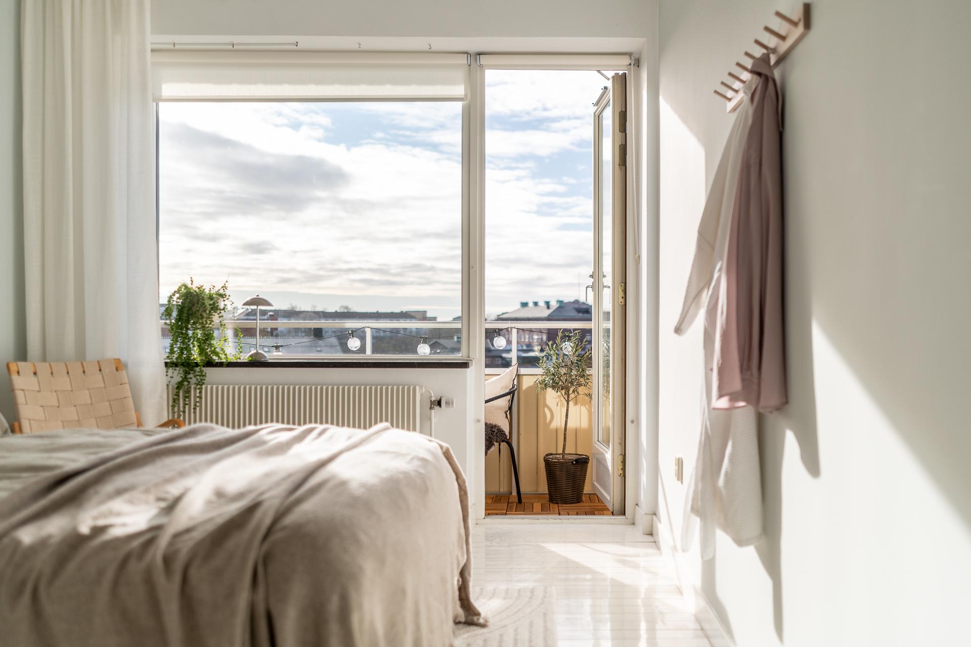Sovrummet är rogivande och rymmer dubbelsäng med sidobord samt två garderober. Härifrån når man balkongen som ligger i ett helt fritt och privat läge med vidsträckt utsikt över stadens takåsar och natur. Eftermiddagssol och solnedgångarna här är något man gärna stannar upp inför. Golvet består av vitmålat brädgolv och väggarna är ljust målade.