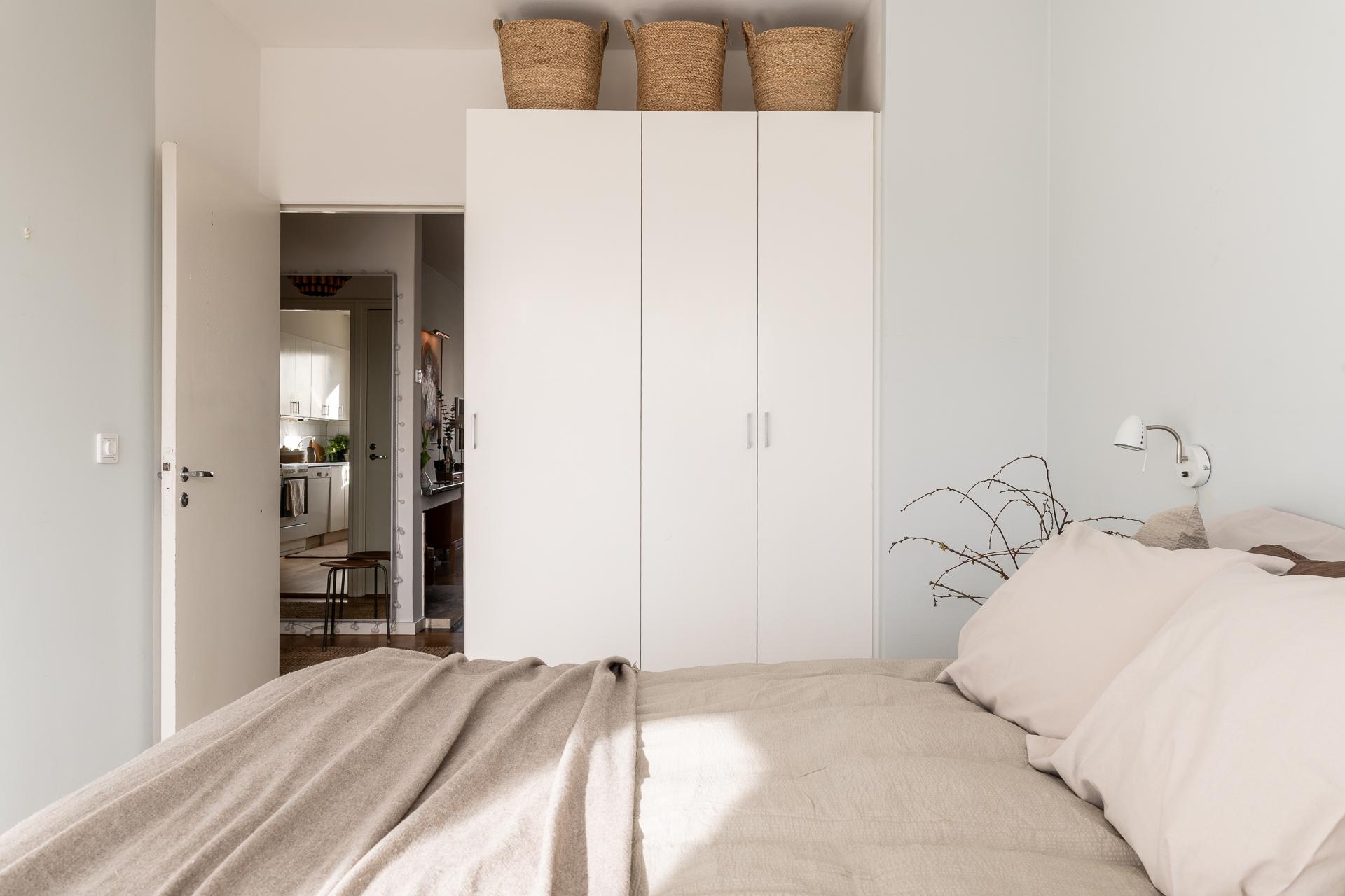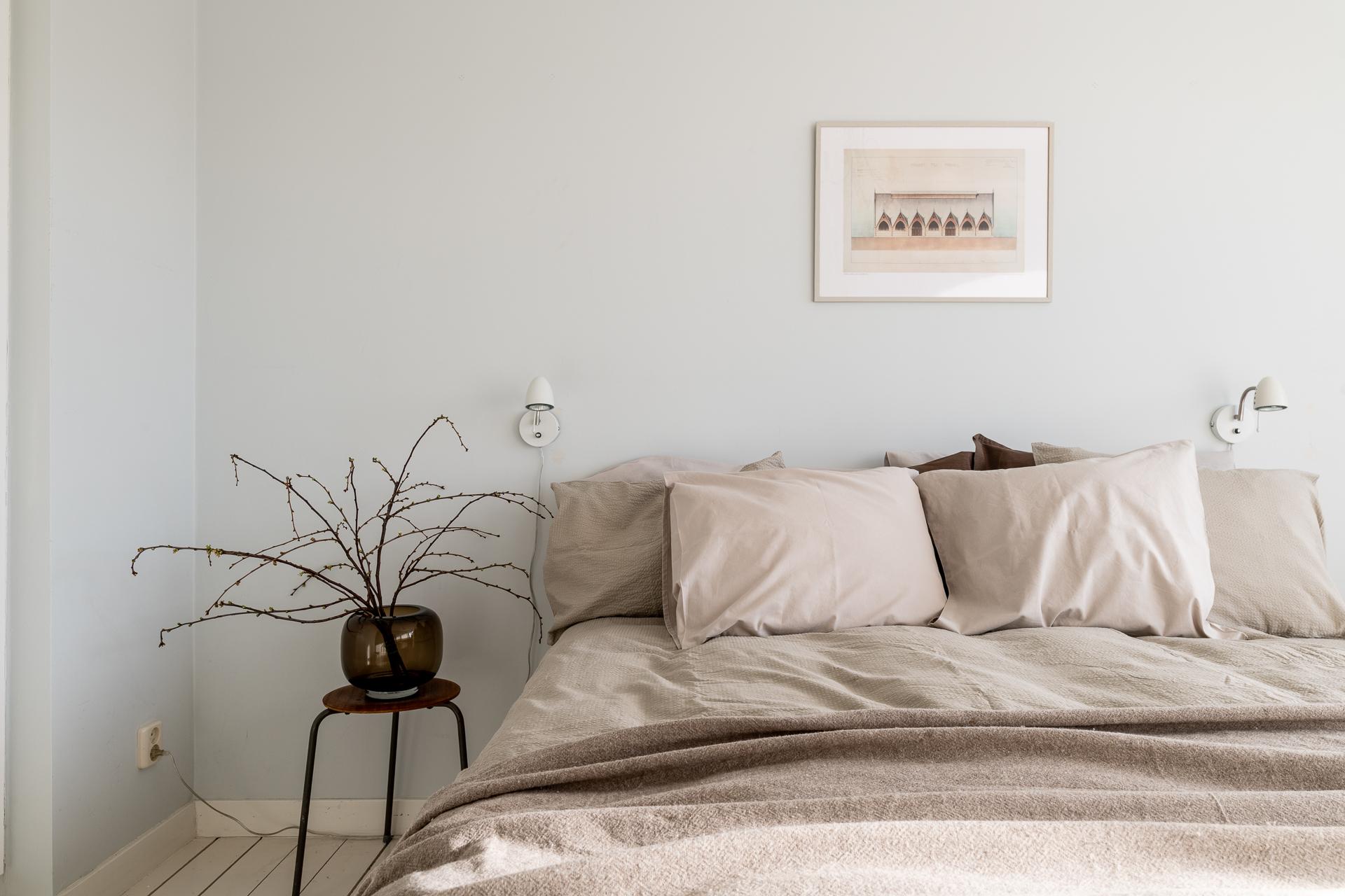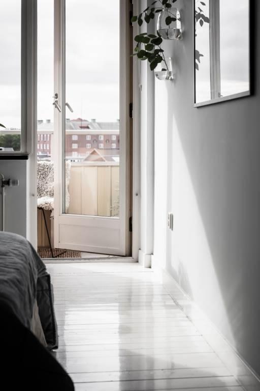 Sovrummet är rogivande och rymmer dubbelsäng med sidobord samt två garderober. Härifrån når man balkongen som ligger i ett helt fritt och privat läge med vidsträckt utsikt över stadens takåsar och natur. Eftermiddagssol och solnedgångarna här är något man gärna stannar upp inför. Golvet består av vitmålat brädgolv och väggarna är ljust målade.