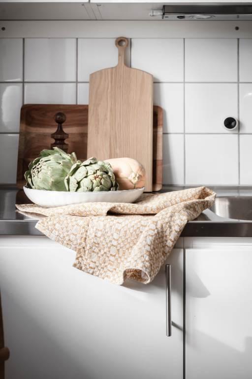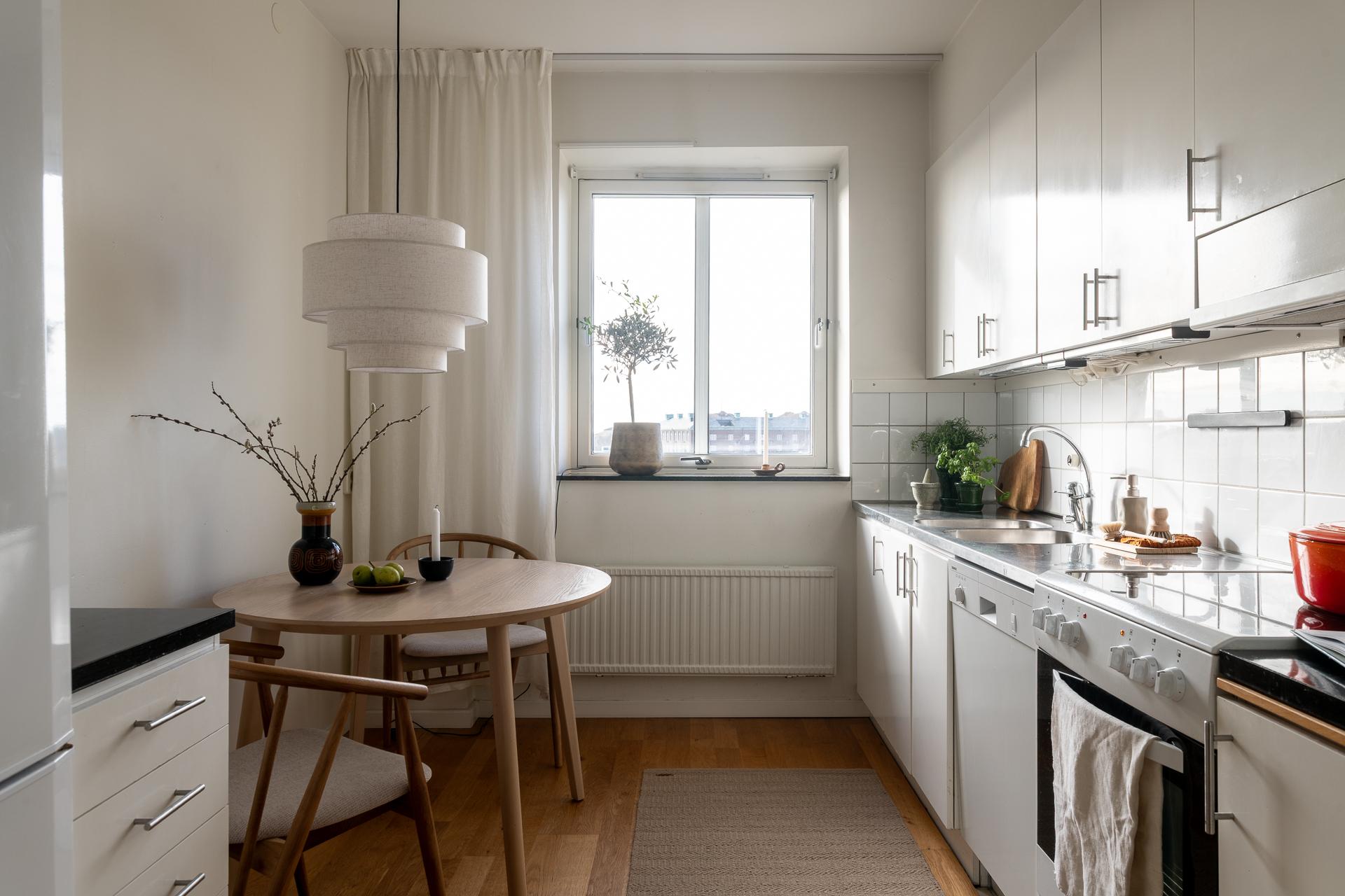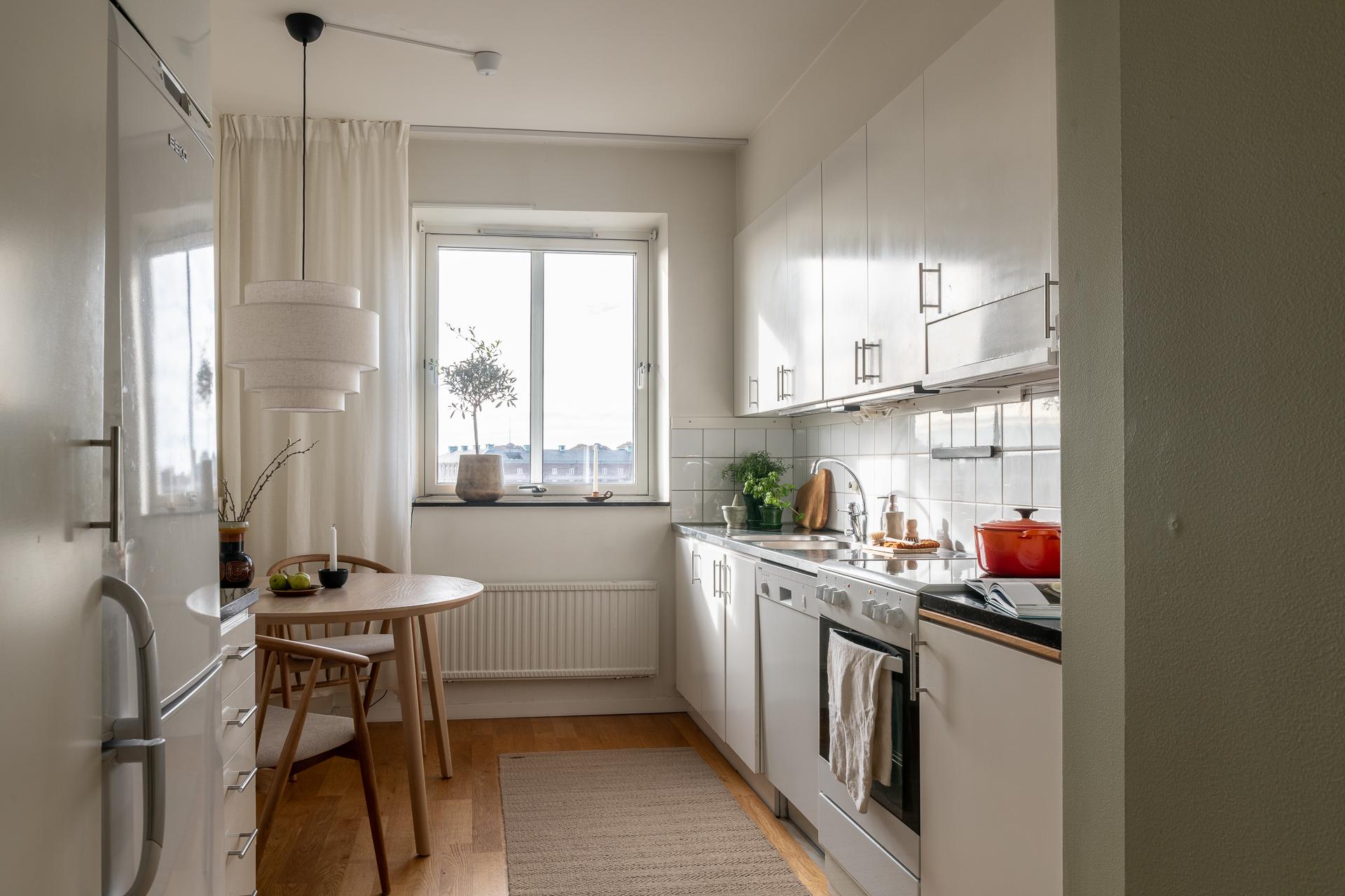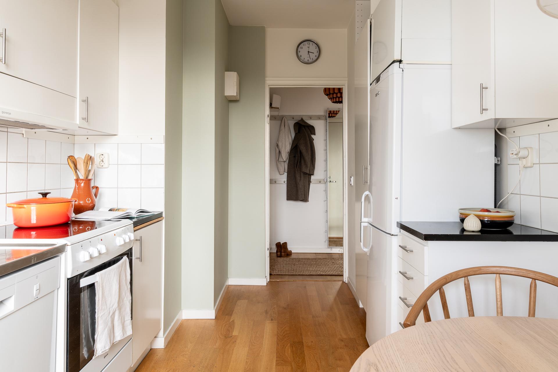 Köket är i klassisk funkisanda – funktionellt och välplanerat med gott om förvaring i över- och underskåp samt bra arbetsytor. Framför fönstret mot väster ryms en matplats med utsikt över staden. Skåpsluckor i vitt och kaklat stänkskydd ger en tidlös känsla. Maskinell utrustning består av kyl/frys, spis, ugn och fläkt. Golvet är belagt med ett ekliknande laminatgolv och väggarna är ljust målade.