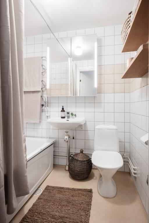 Badrummet rymmer badkar, handfat med spegelskåp, handdukstork och WC. Vita kakelväggar med bård samt ljus våtrumsmatta.