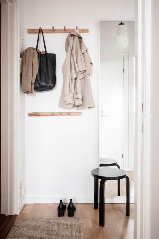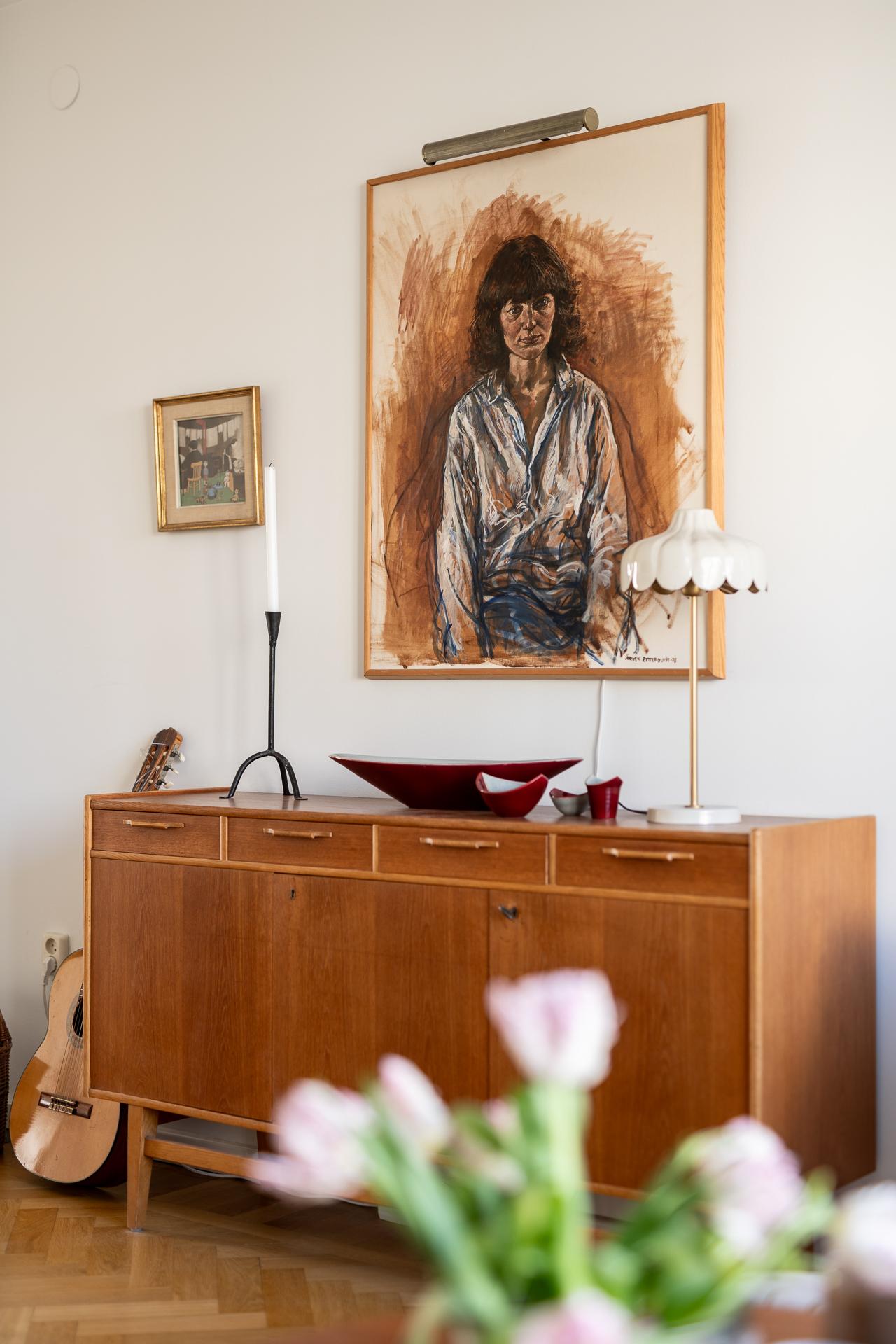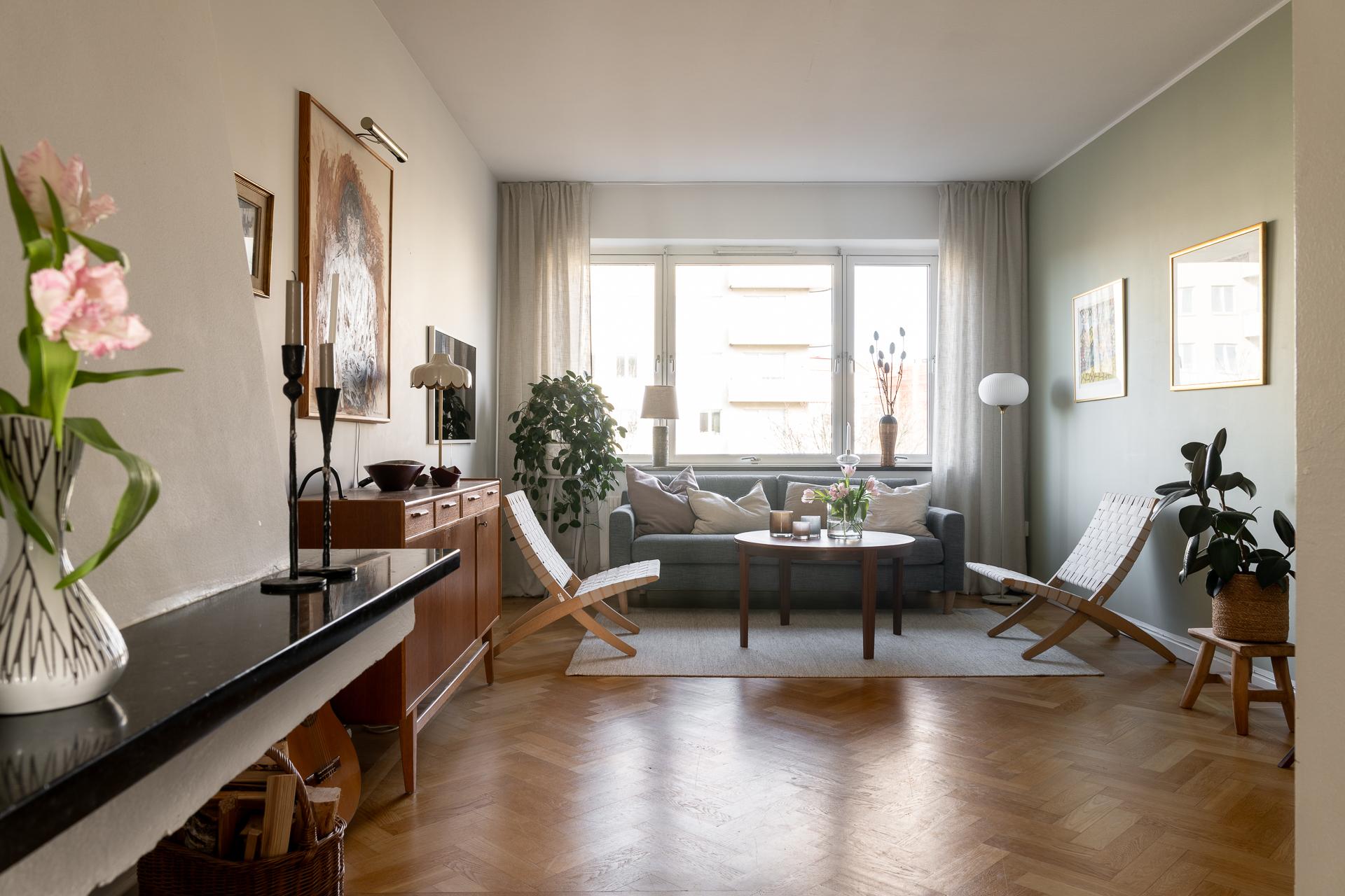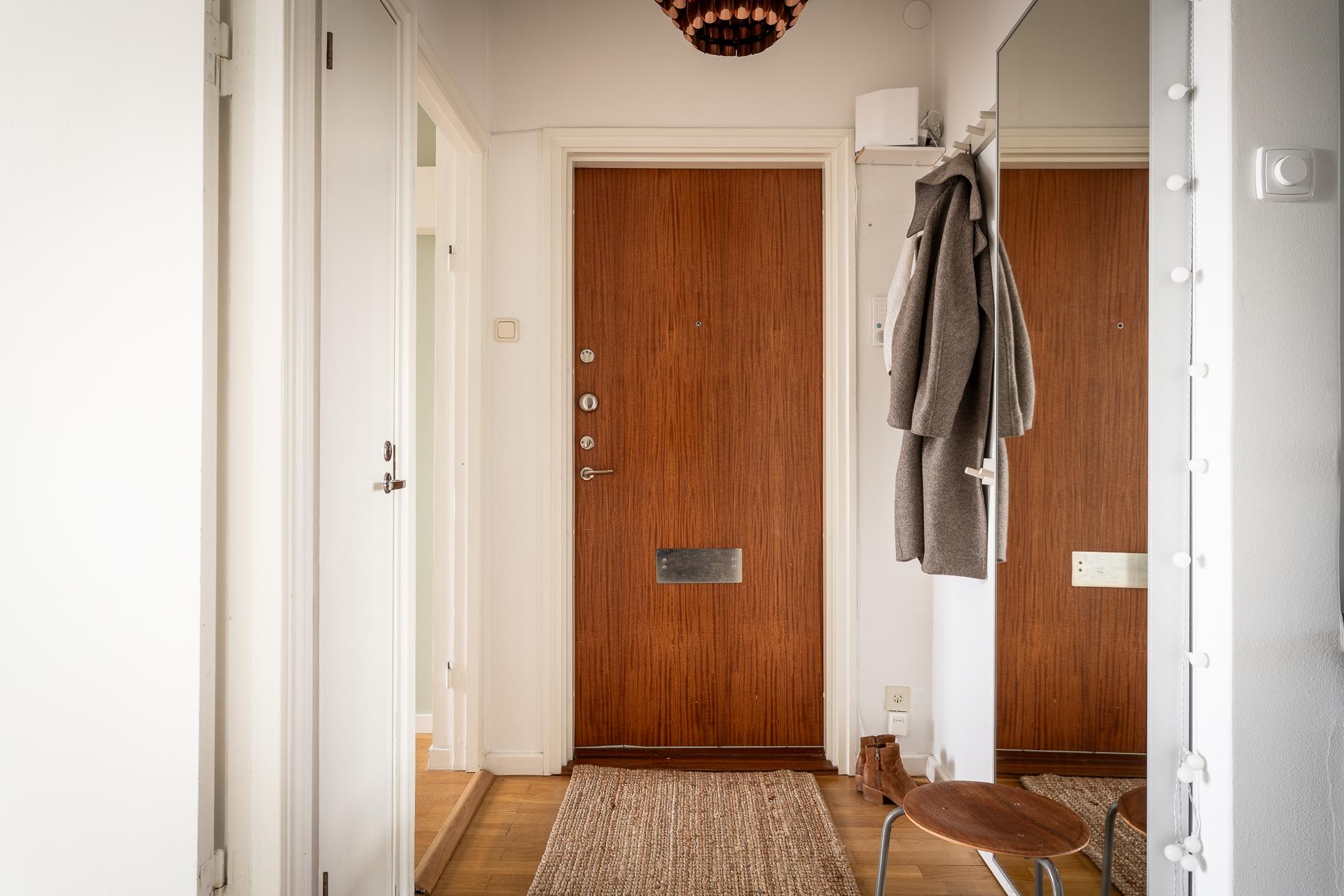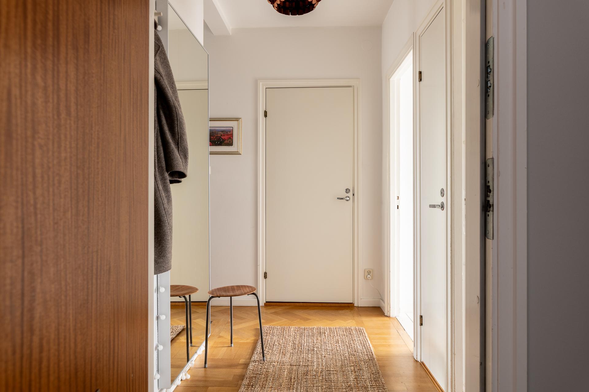 Redan i trapphuset möts vi av tidstypisk funkisanda – marmorerade trappor, höga fönster och indragna vädringsbalkonger signalerar ordning och elegans. Ta hissen eller de vackra trapporna upp till våning fyra och kliv in i en välkomnande hall med fin överblick över bostadens disposition. Här finns plats för avhängning, förvaring i klädkammare och originalparkett som löper vidare mot vardagsrummet. Väggar i ljusa toner förstärker känslan av rymd.