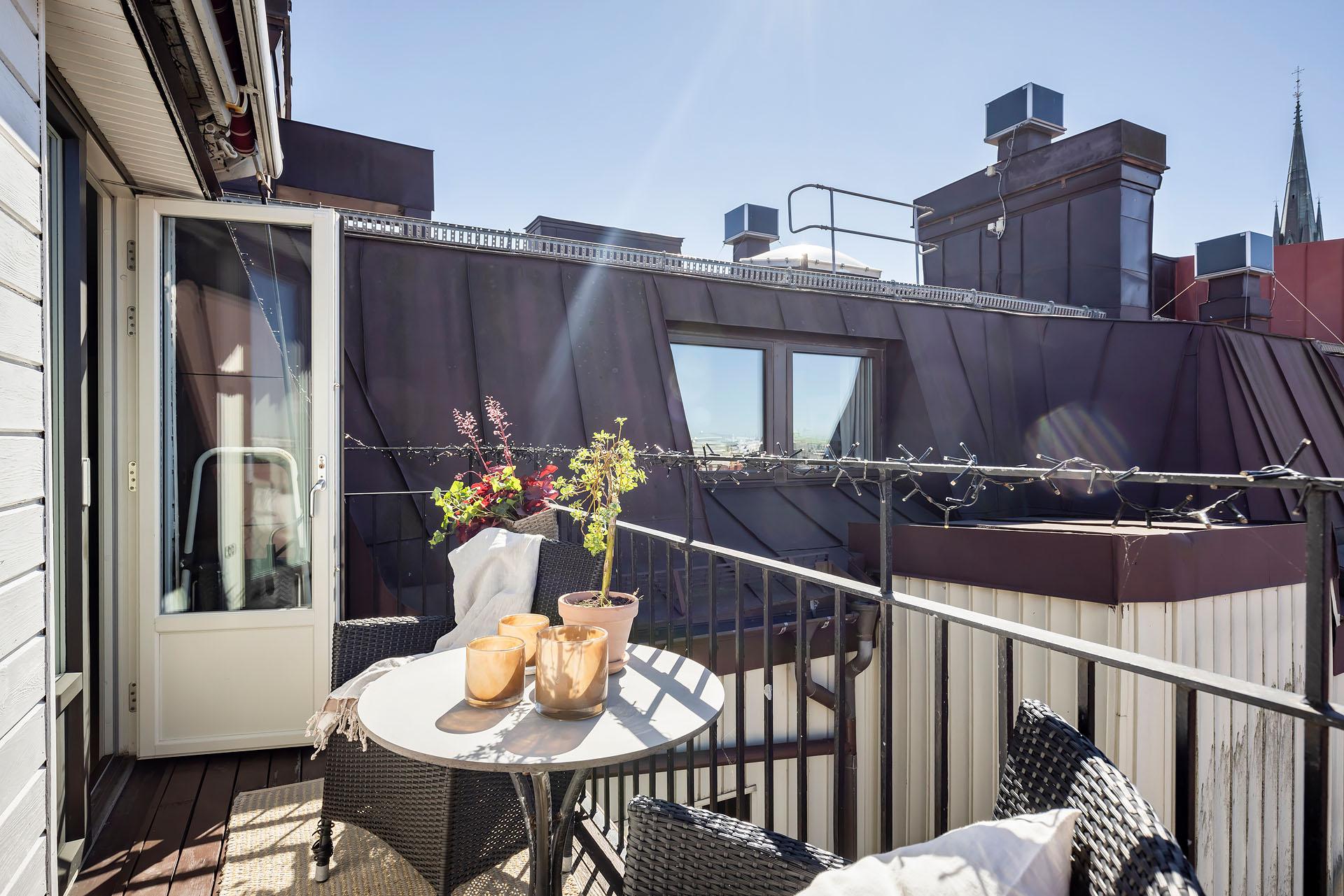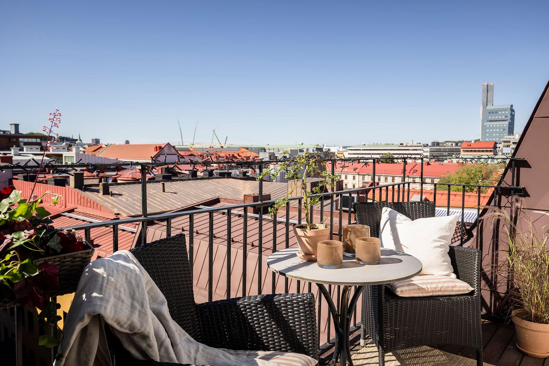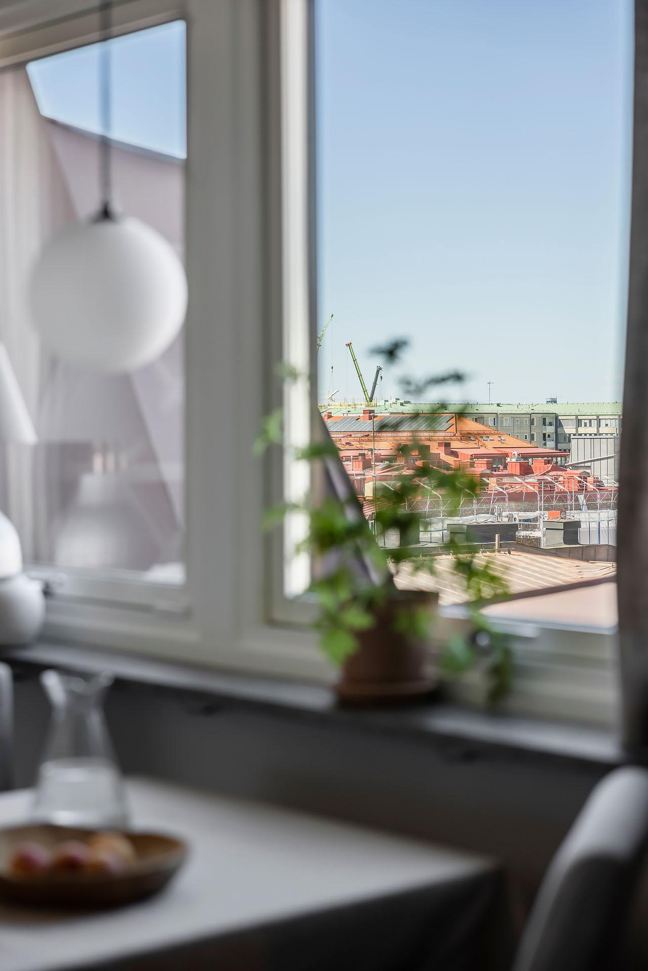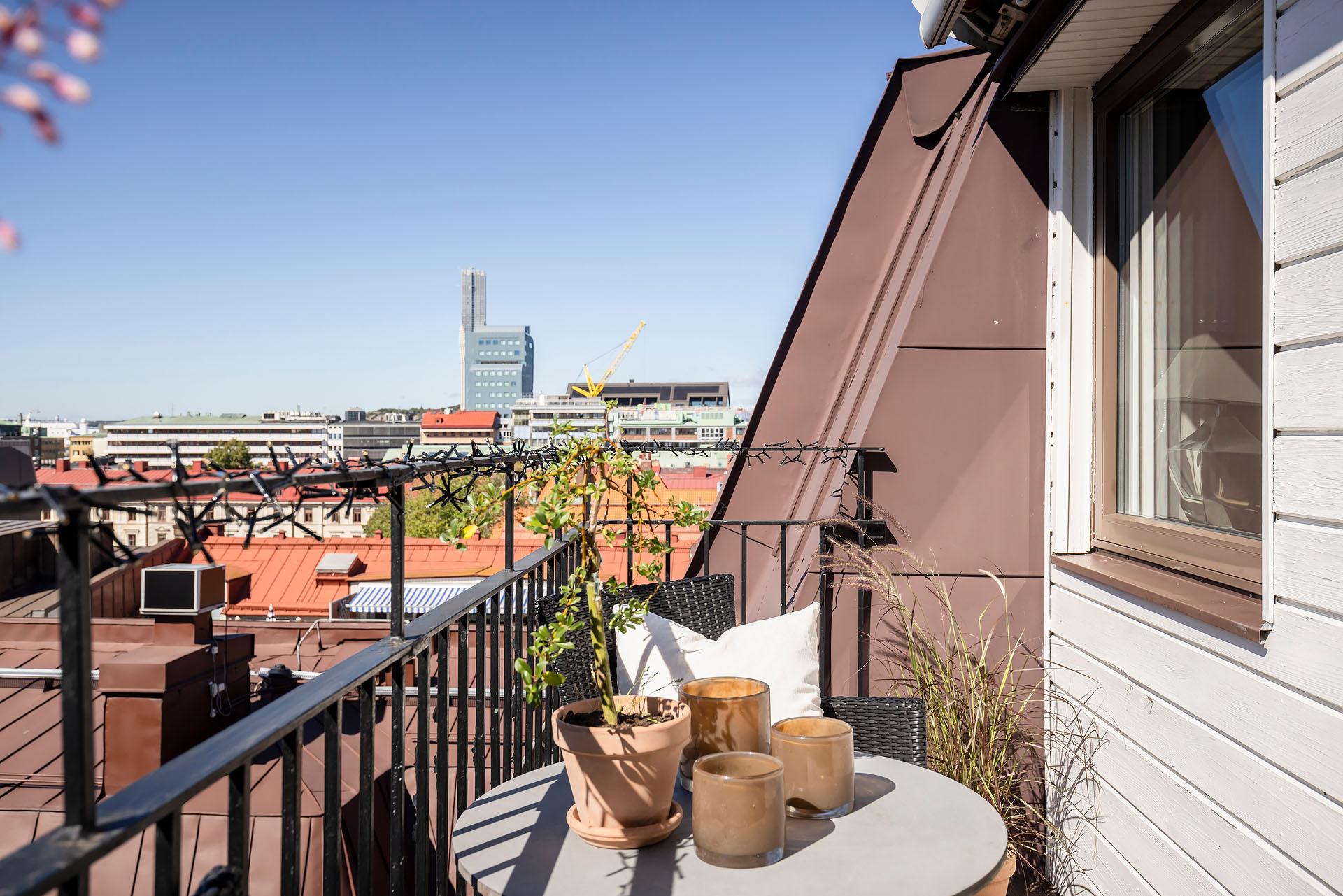 Högst upp bland takåsar och himmel väntar en privat vindsvåning som slår det mesta. Här möts slående utsikt, öppen spis, generösa sällskapsytor och en stor balkong med kvällssol – ert extra rum under sommarhalvåret. Lägg därtill två sovrum, gäst-wc och ett ljusflöde från tre väderstreck, så har du ett hem i särklass. Hiss finns, går från halvplan och till våning 4.
