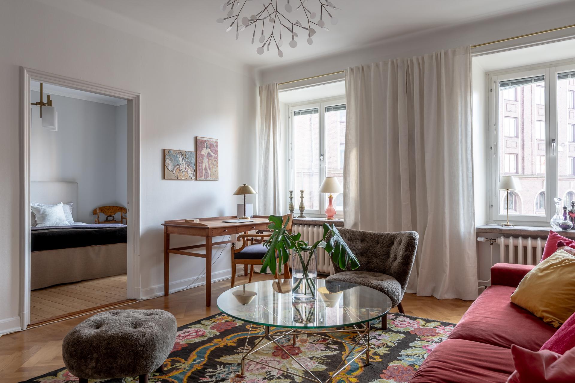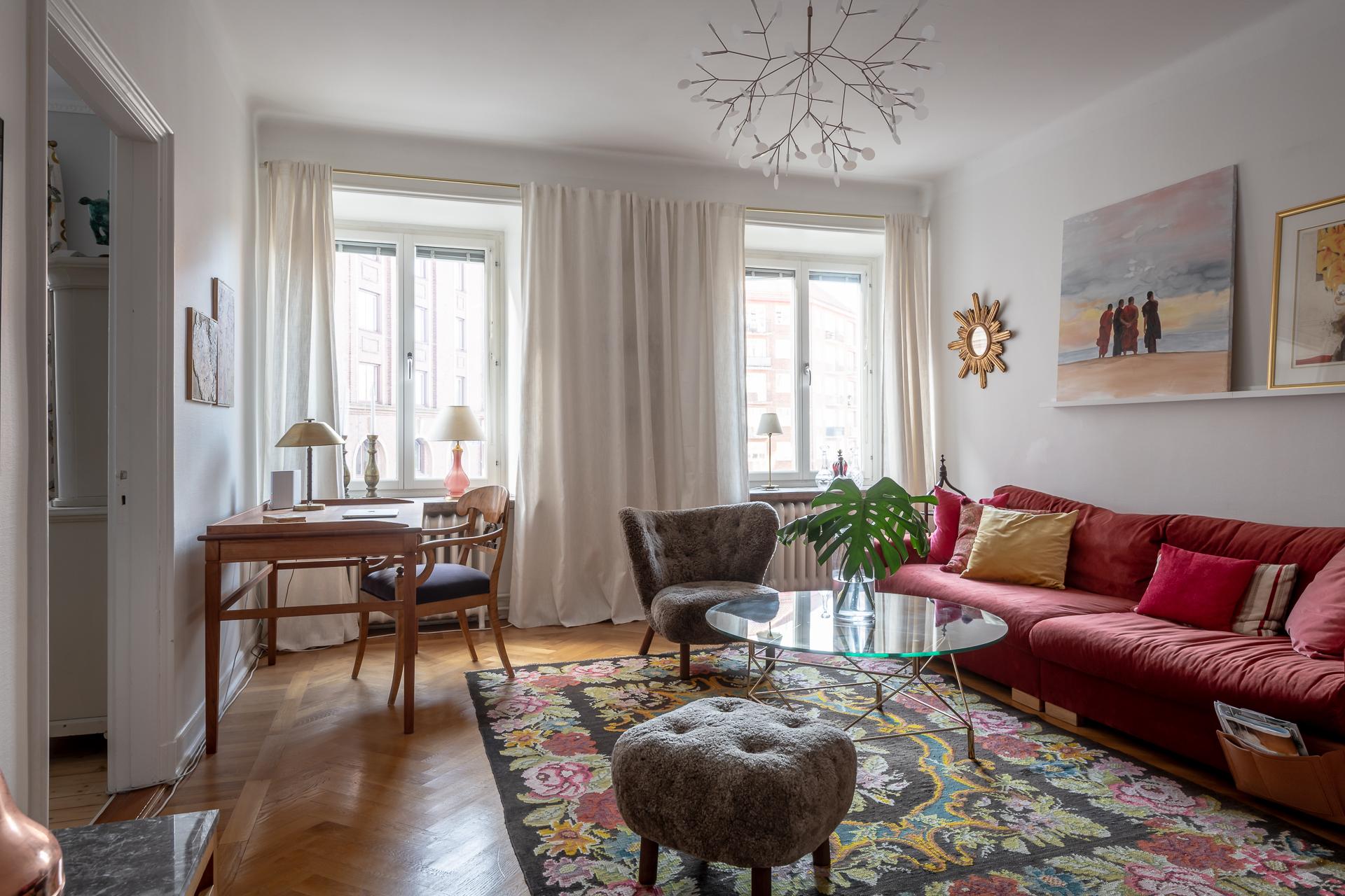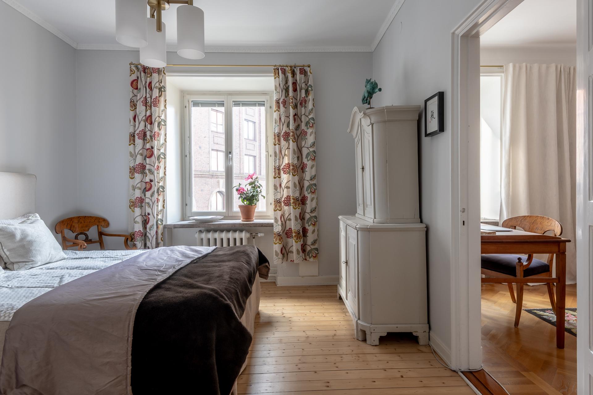 Spegeldörrar, serveringsskåp, högt i tak och djupa fönsternischer – ja denna ljusa och luftiga tvåa i mysiga Nedre Johanneberg andas verkligen 1920-tal. Vardagsrummet och det voluminösa sovrummet ligger i fil mot den lugna gatan, och härifrån har man långsträckt utsikt över det vackra kvarteret ända bort mot Norra Guldhedens höjder. Det rymliga köket och den tegelinramade balkongen, som delas med grannen, vetter mot rofylld innergård. Lägenheten ligger en trappa upp, och det är ingen direkt insyn från förbipasserande. Utanför husets port finns en lummig och insynsskyddad förträdgård med gemensam uteplats. Det är en trevlig bostadsrättsförening med välskött fastighet och den välmående ekonomin, med exceptionellt låg belåningsgrad, återspeglas inte minst i den låga avgiften. Varmt välkomna på visning!