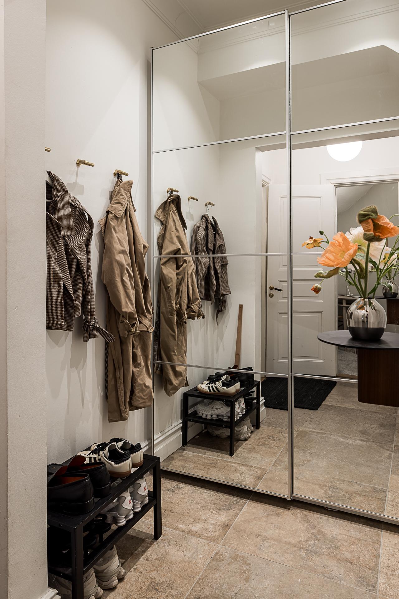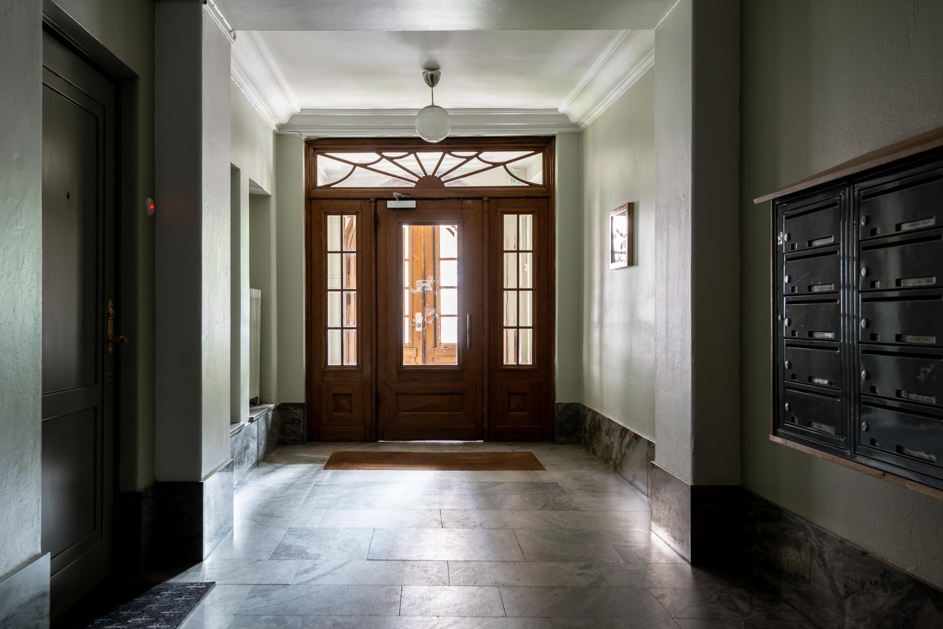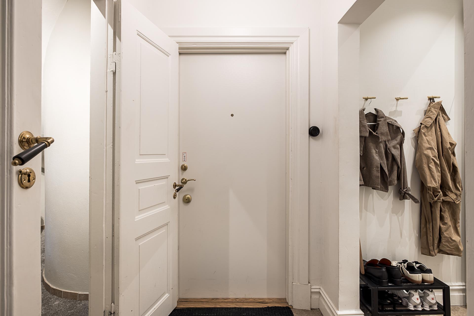 Redan i trapphuset förstår man att detta är en välskött förening. Den massiva ekporten leder in i ett välkomnande trapphus med en mängd originalkaraktär. Själva hallen bjuder på smart disponerade ytor med förvaring i form av garderober till vänster och avhängningsmöjligheter likaså. Den genersösa takhöjden gör att man genast blickar upp mot taket. Golvet pryds av stenliknande praktisk klinker och väggarna är målade i en bruten vit nyans.
