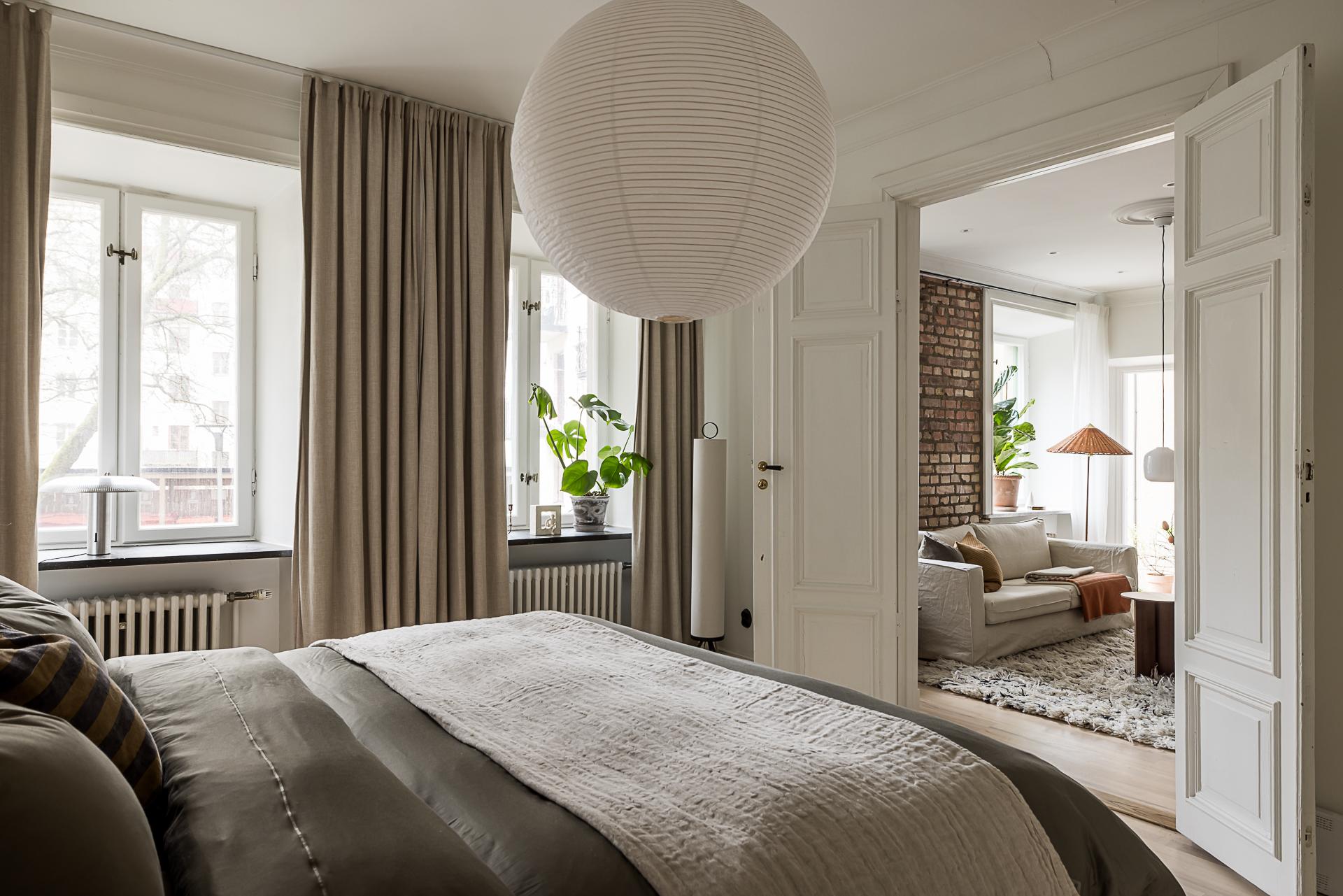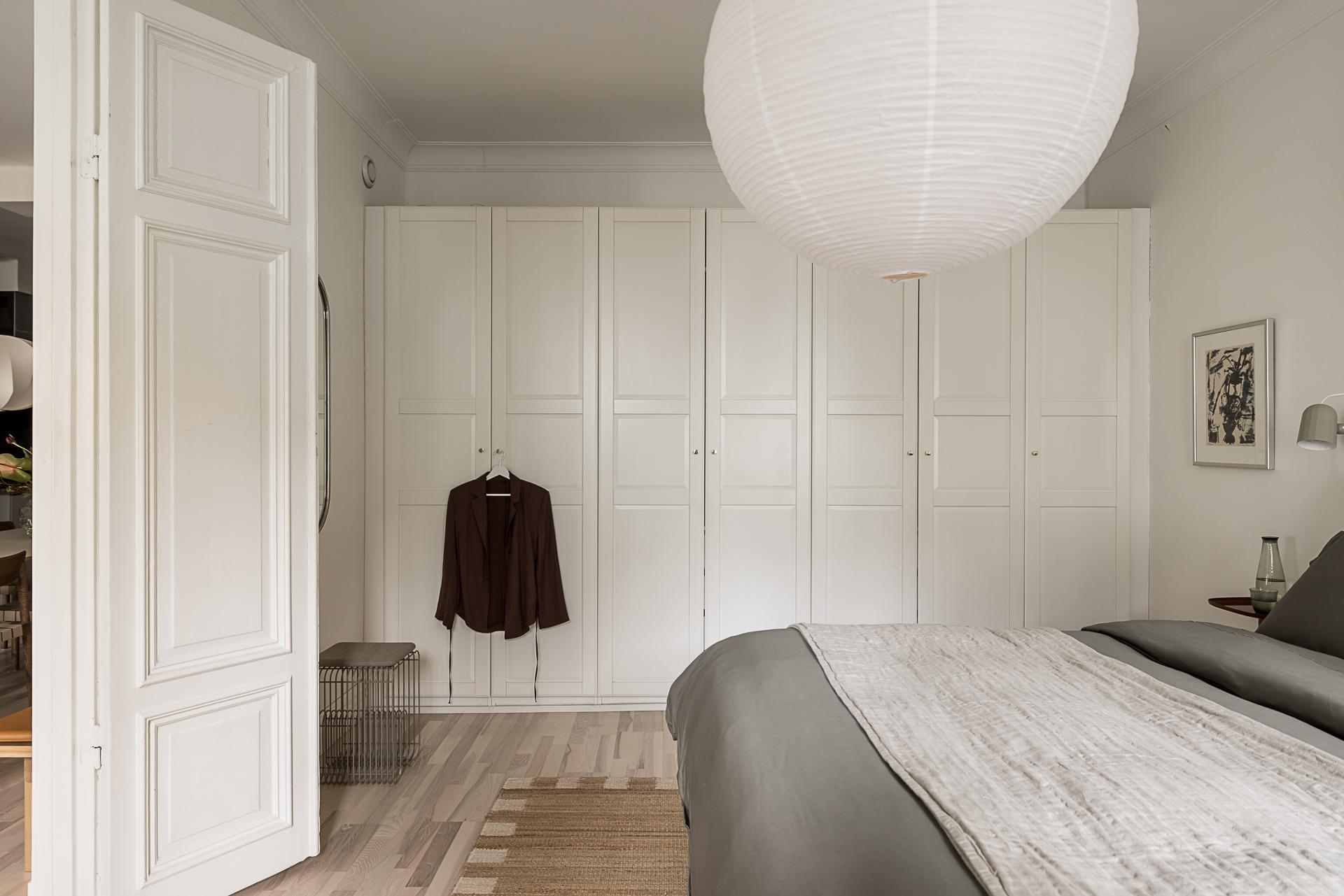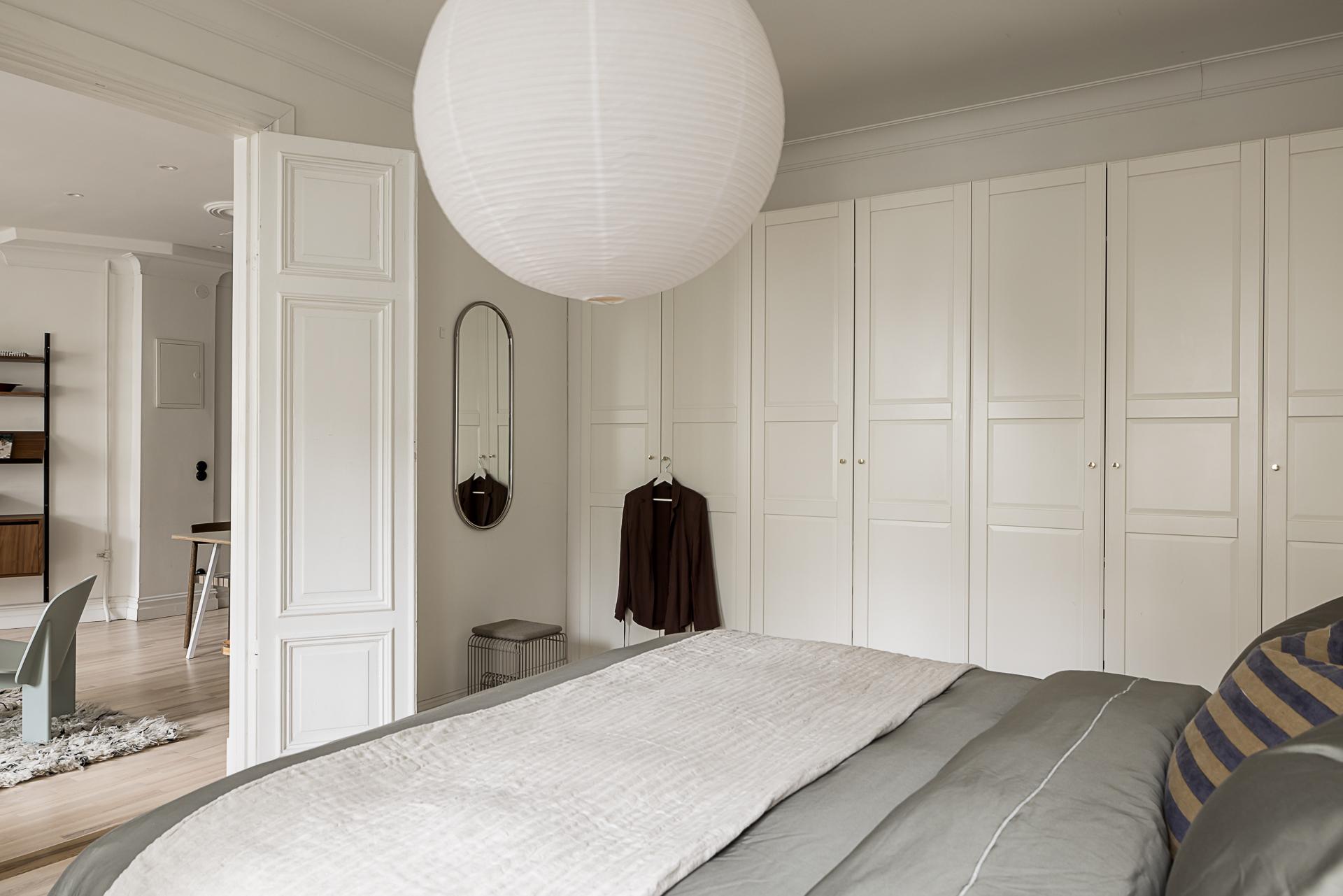 Genom vackra pardörrar öppnar sig sovrummet som en stillsam oas, ett rum där rymd och ro möts i perfekt balans. Här finns gott om plats för en generös dubbelsäng, och längs ena väggen sträcker sig förvaringen i form av garderober som smälter in i helheten och skapar ett harmoniskt lugn. Två höga fönster vetter mot den tysta innergården och släpper in ett mjukt ljus som vandrar genom rummet under dagens gång. Atmosfären är rogivande och avskild, en plats att landa på långt från vardagens brus. De ljusmålade väggarna samspelar med den varma askparketten och ger en tidlös, behaglig grund. Här infinner sig en naturlig stillhet, ett sovrum att vila i, drömma i och vakna långsamt i.