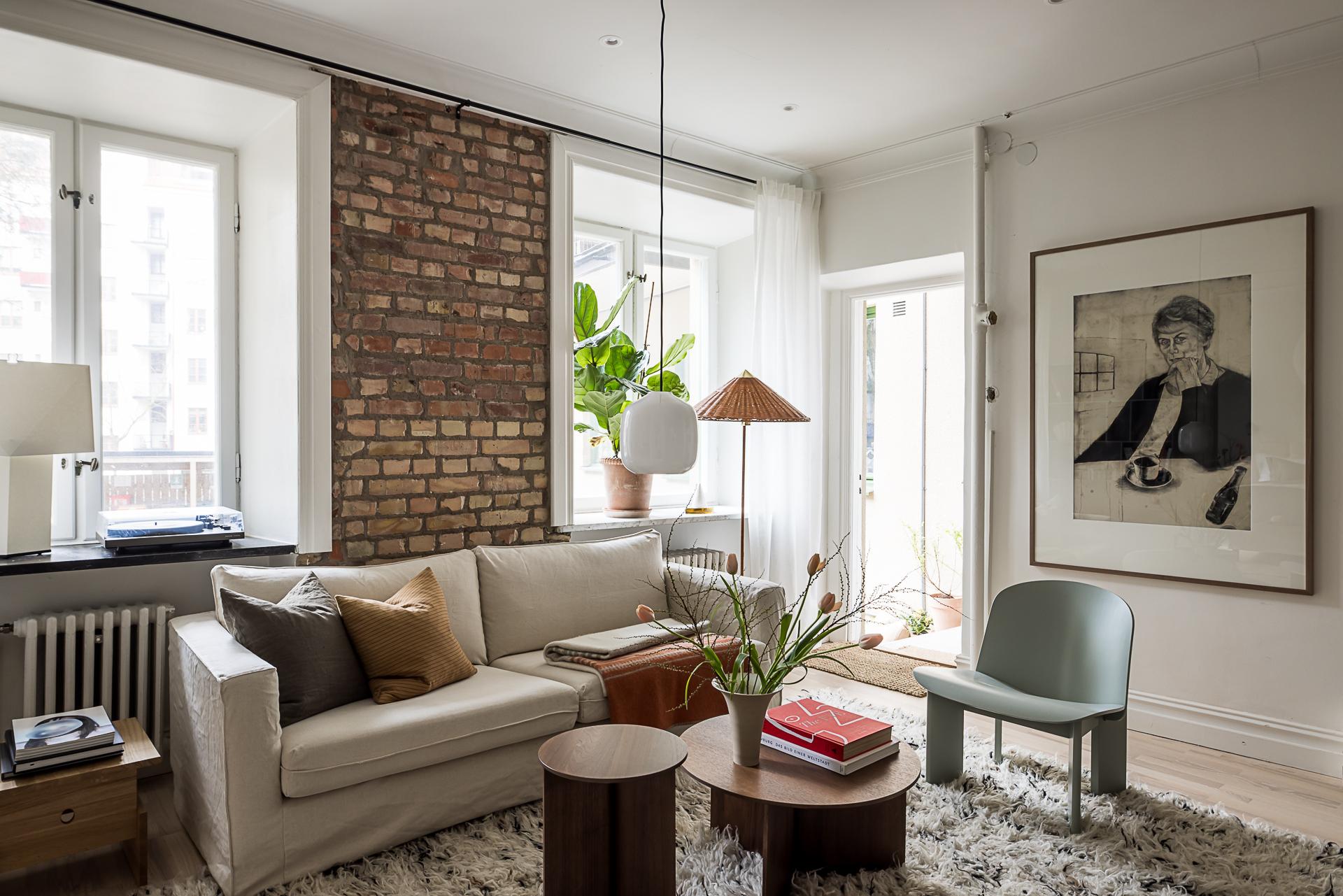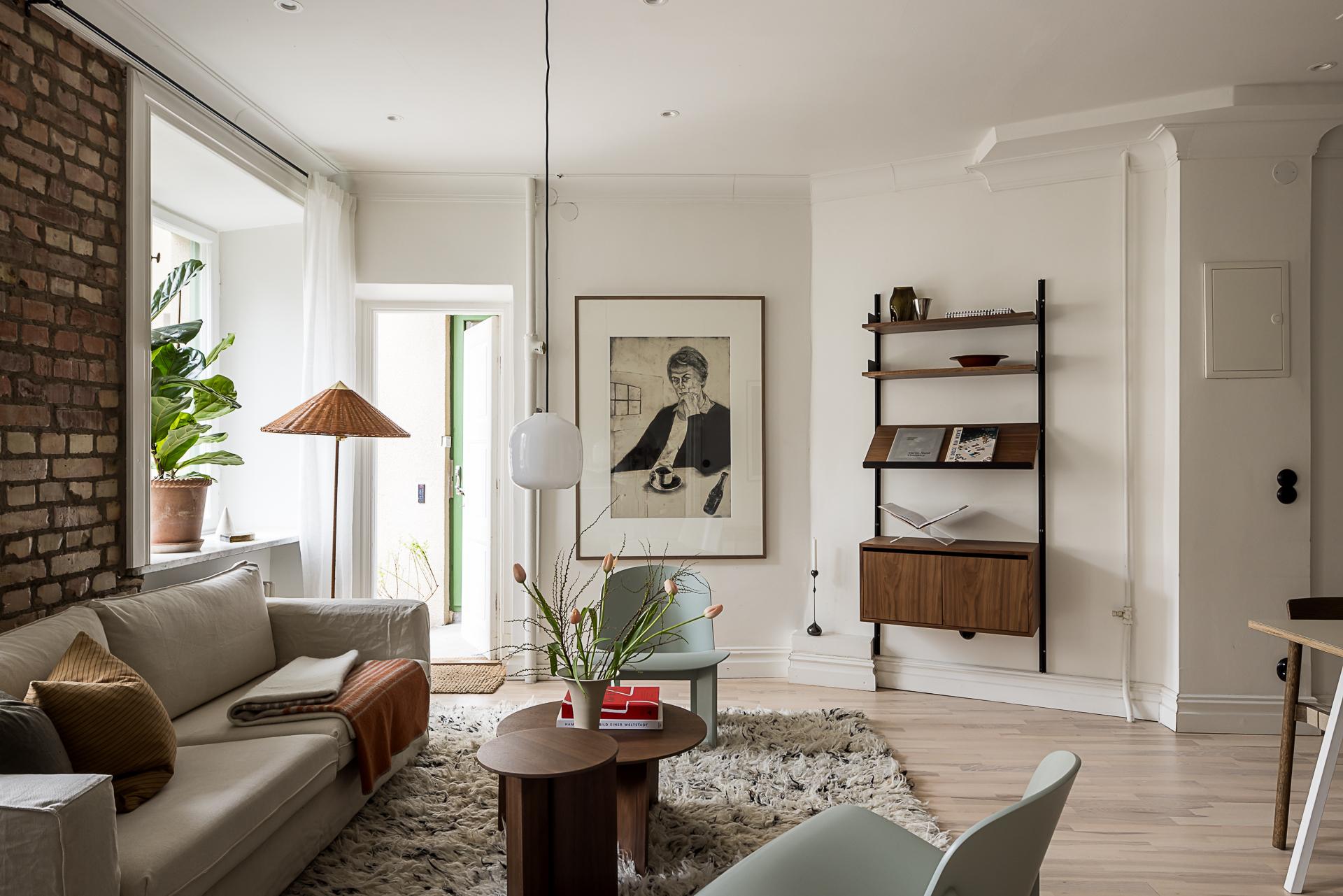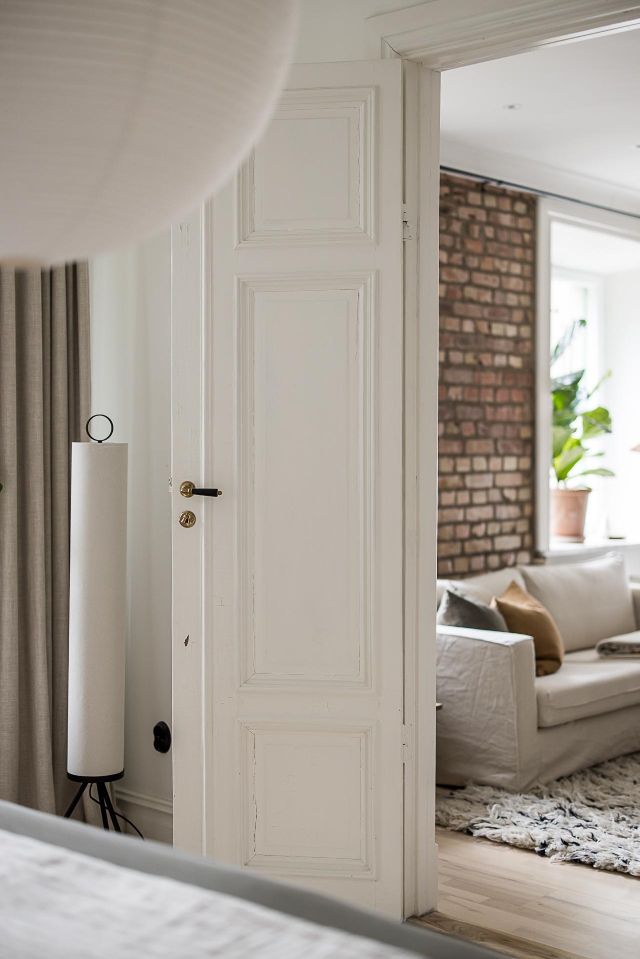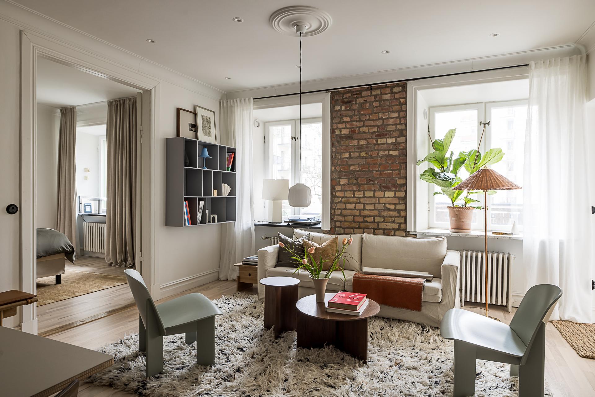 Vardagsrummet utgör bostadens självklara hjärta. Två höga fönster med djupa fönsternischer släpper in rikligt med ljus och vetter i rakt söderläge mot den lugna, grönskande gården, vilket skapar en rofylld atmosfär. Öppnar man fönstren hörs fägelkvitter och storstaden känns långt borta. Härifrån nås även en direkt utgång till gården där en mindre yta för uteplats finns – en underbar förlängning av rummet och en given plats att njuta av morgonkaffet i solen eller varma dagar utomhus. Väggarna är målade i en mjuk bruten vit ton som tillsammans med den vackra askparketten ger en ljus och enhetlig bas. Den framtagna tegelväggen tillför både karaktär och värme, och blir ett naturligt blickfång i rummet. Den generösa takhöjden förstärker känslan av rymd och elegans. Vackra pardörrar leder vidare in till sovrummet i fil och skapar ett fint flöde mellan rummen, samtidigt som de bidrar med en klassisk och tidlös charm. Här finns gott om plats för både soffgrupp och sociala ytor – ett rum att trivas i, oavsett om det är vardag eller fest.