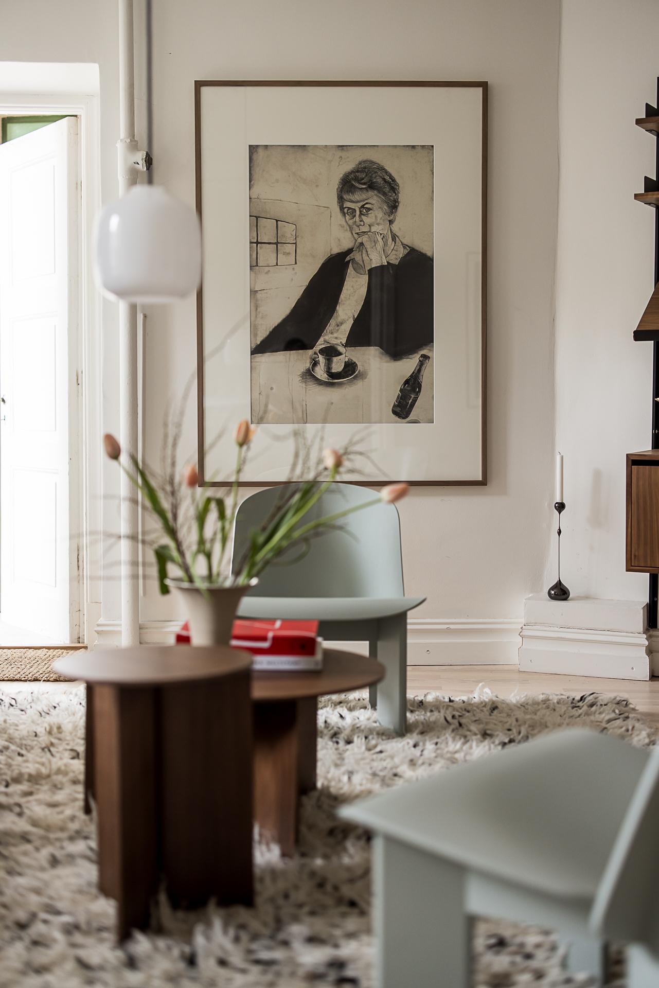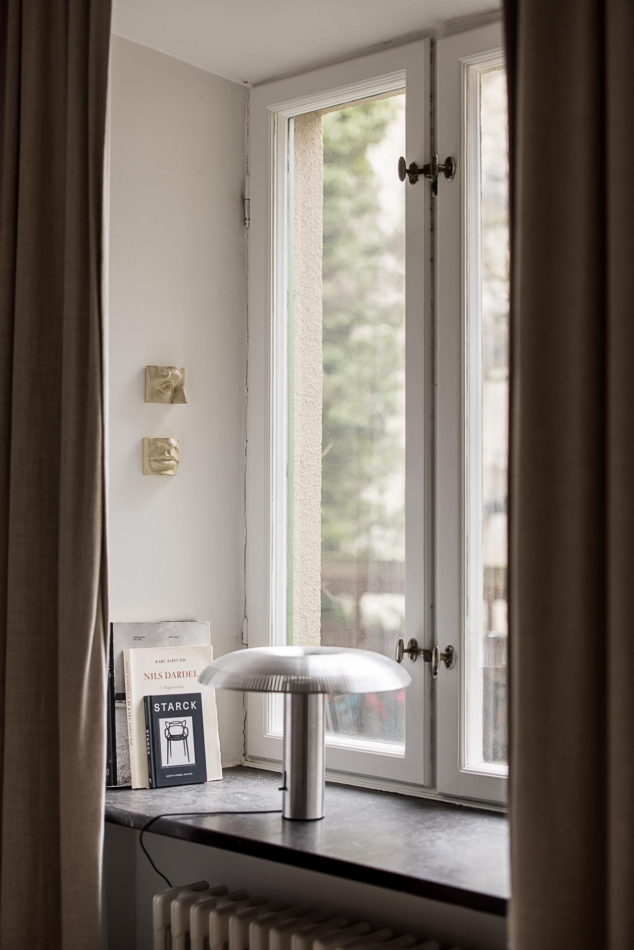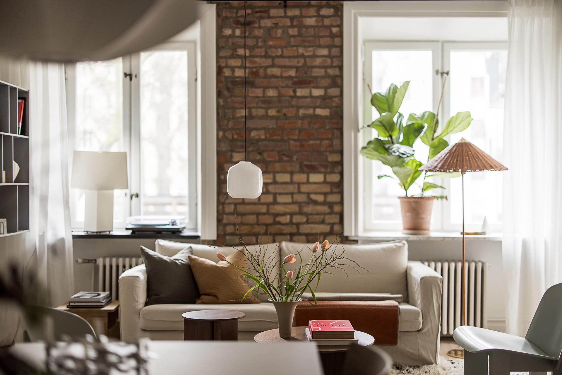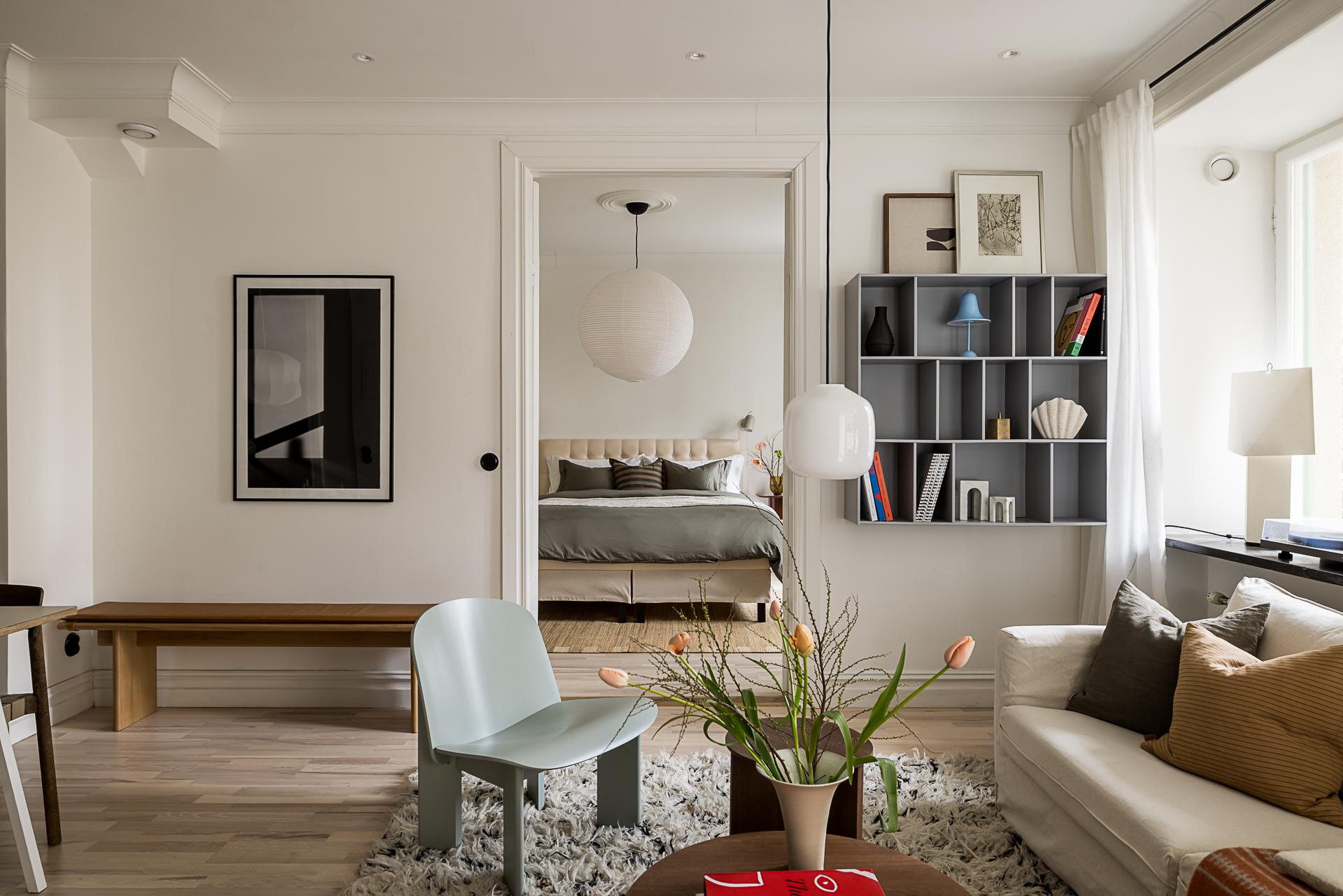 Vardagsrummet utgör bostadens självklara hjärta. Två höga fönster med djupa fönsternischer släpper in rikligt med ljus och vetter i rakt söderläge mot den lugna, grönskande gården, vilket skapar en rofylld atmosfär. Öppnar man fönstren hörs fägelkvitter och storstaden känns långt borta. Härifrån nås även en direkt utgång till gården där en mindre yta för uteplats finns – en underbar förlängning av rummet och en given plats att njuta av morgonkaffet i solen eller varma dagar utomhus. Väggarna är målade i en mjuk bruten vit ton som tillsammans med den vackra askparketten ger en ljus och enhetlig bas. Den framtagna tegelväggen tillför både karaktär och värme, och blir ett naturligt blickfång i rummet. Den generösa takhöjden förstärker känslan av rymd och elegans. Vackra pardörrar leder vidare in till sovrummet i fil och skapar ett fint flöde mellan rummen, samtidigt som de bidrar med en klassisk och tidlös charm. Här finns gott om plats för både soffgrupp och sociala ytor – ett rum att trivas i, oavsett om det är vardag eller fest.