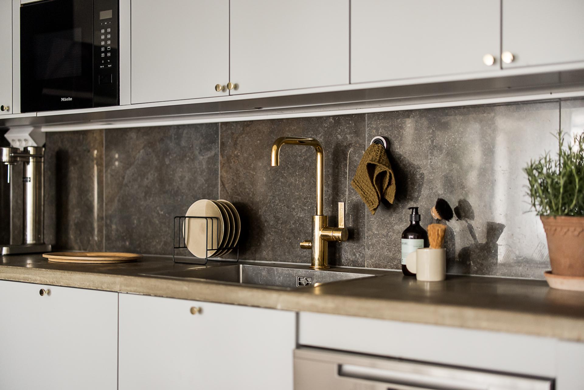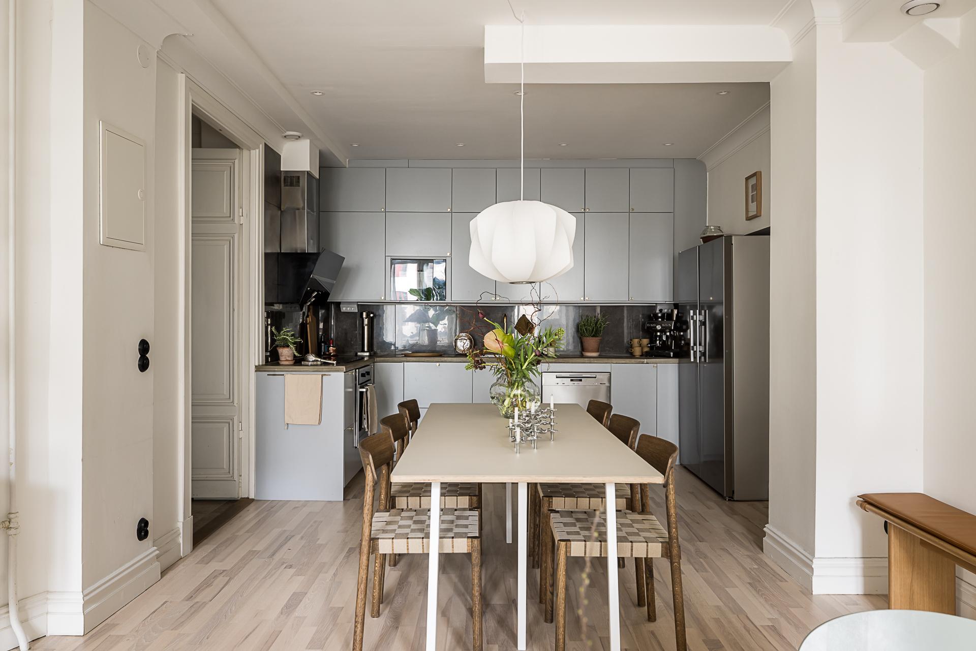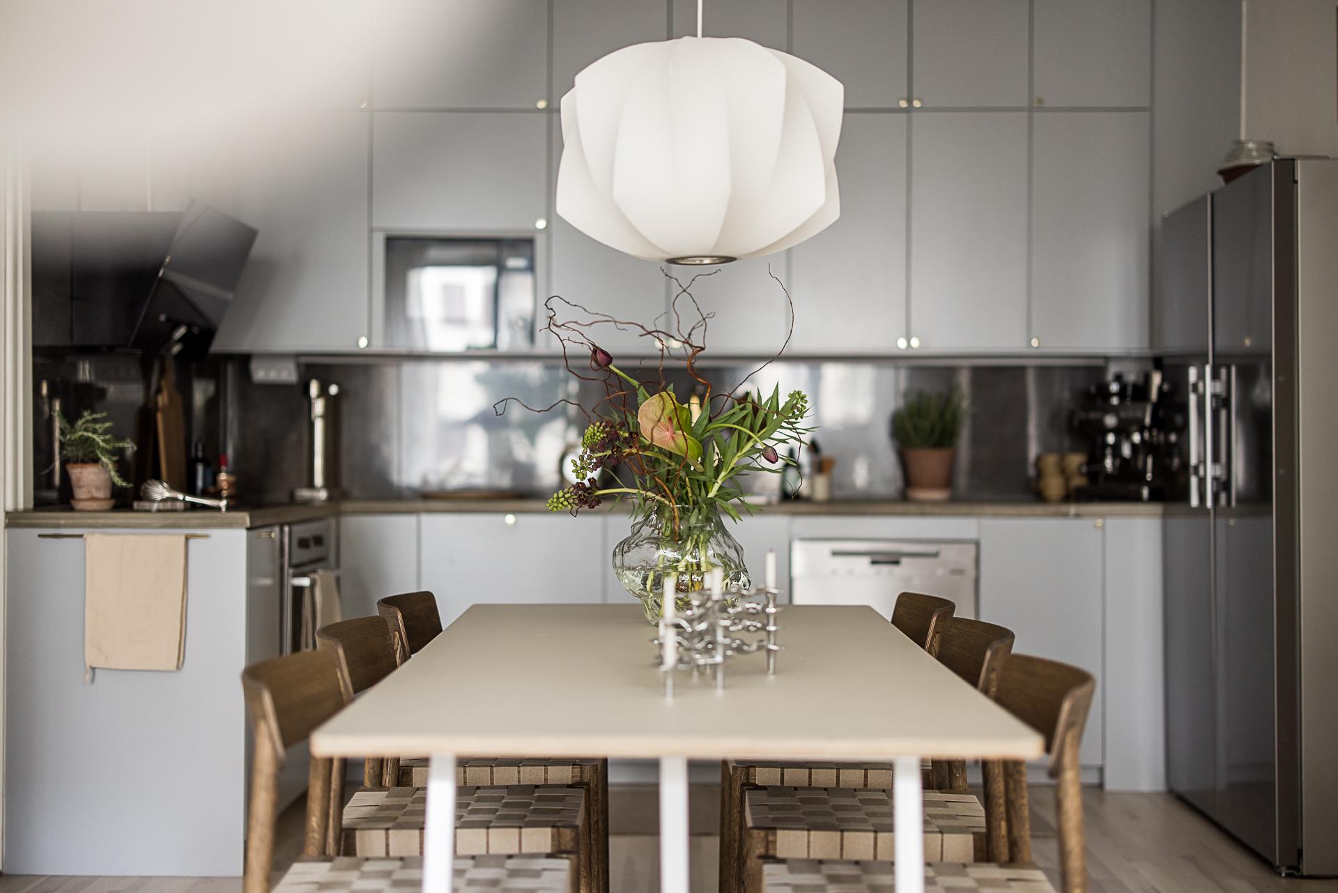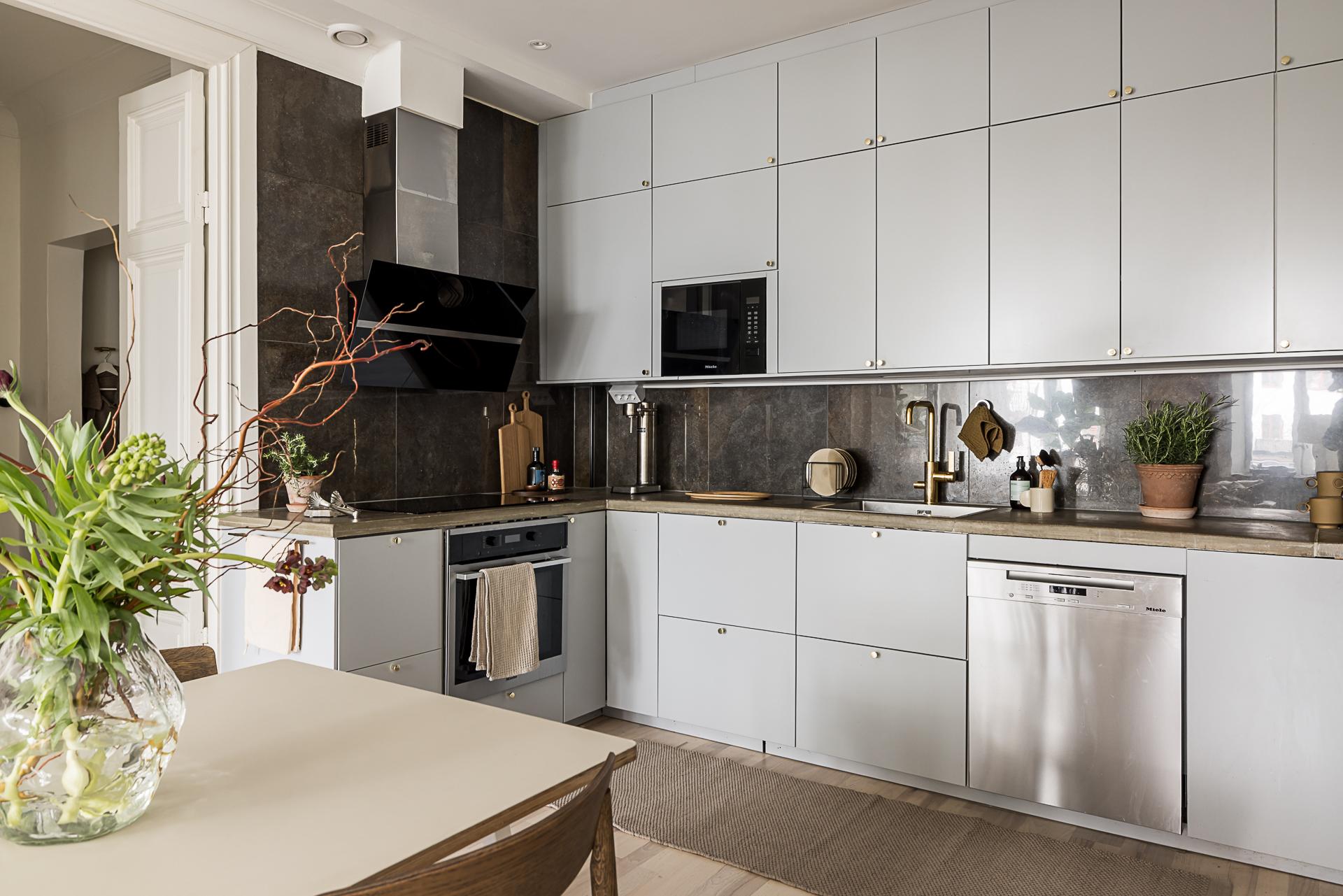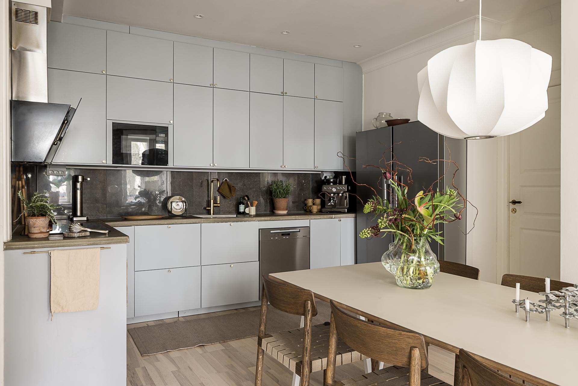 Detta stilrena, grå kök imponerar med sin moderna och tidlösa design där släta luckor samspelar med både över- och underskåp och skapar ett harmoniskt helhetsintryck. Köket är smart planerat i vinkel, vilket ger både generösa arbetsytor och ett naturligt flöde i rummet. Den påkostade maskinella utrustningen från Miéle lyfter köket till en hög nivå. Här finns en extra bred häll, inbyggnadsugn, diskmaskin, inbyggd micro samt en elegant fläktkåpa. Den breda kyl och frysen i fullhöjd erbjuder gott om plats för hela hushållets behov. Bänkskivan i gjuten betong ger en exklusiv och robust känsla, medan de stora stenliknande kakelplattorna i brungrå ton sträcker sig hela vägen upp till tak. Integrerade downlights och infällda spotlights ger ett behagligt ljus som förstärker kökets moderna karaktär. Förvaringsmöjligheterna är generösa och välplanerade, vilket gör köket både praktiskt och lätt att hålla organiserat. Den vackra askparketten löper vidare ut i en öppen och social yta mot vardagsrummet, vilket skapar en inbjudande plats för umgänge. Här finns gott om utrymme för ett stort matbord – en självklar samlingspunkt för långa middagar, trevliga samtal och minnesvärda stunder med familj och vänner.