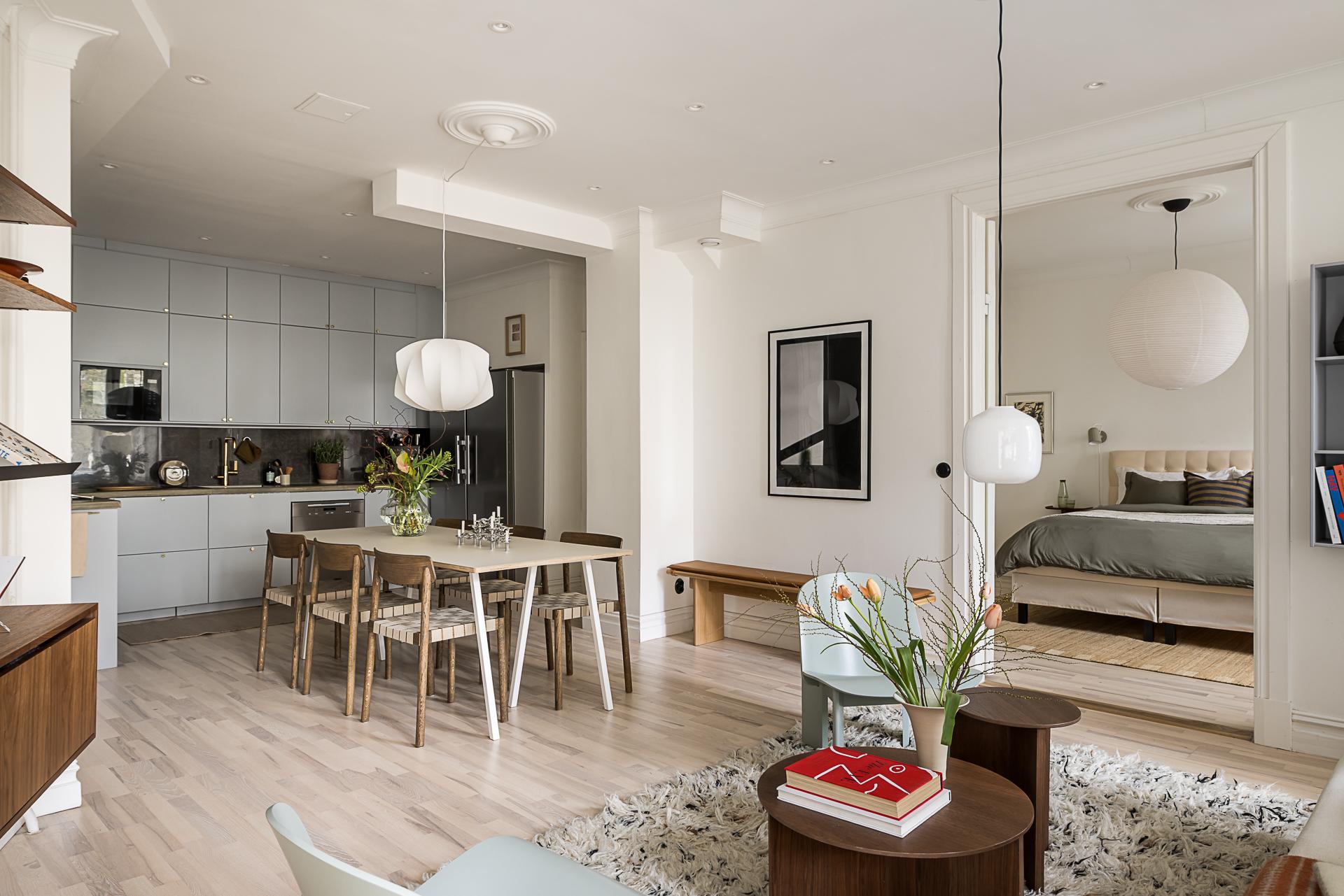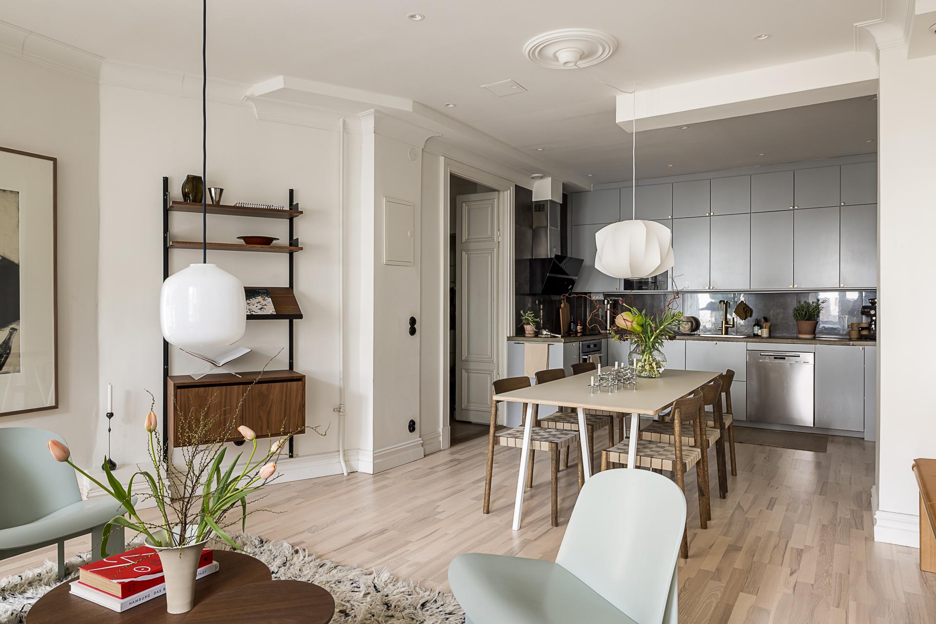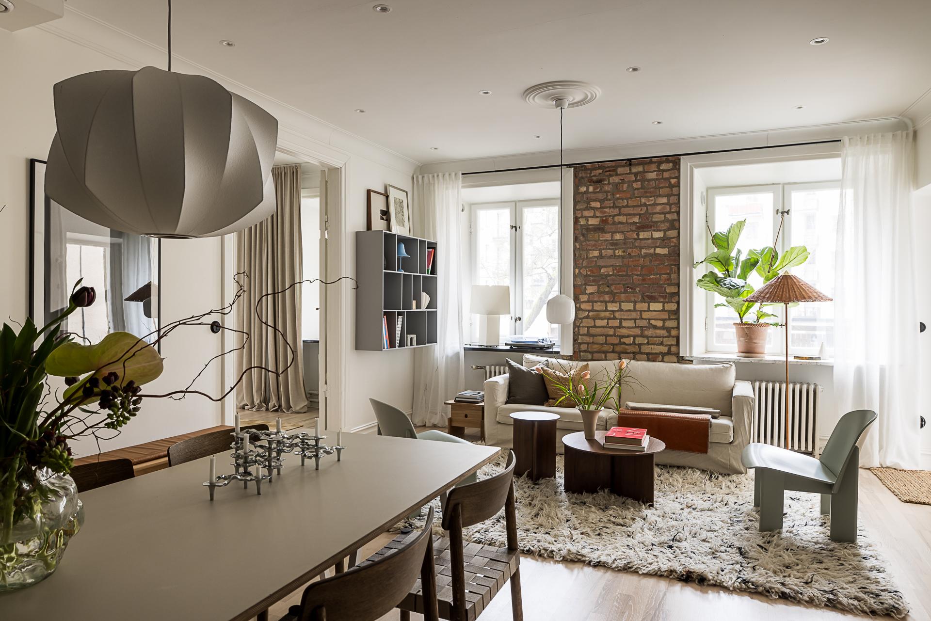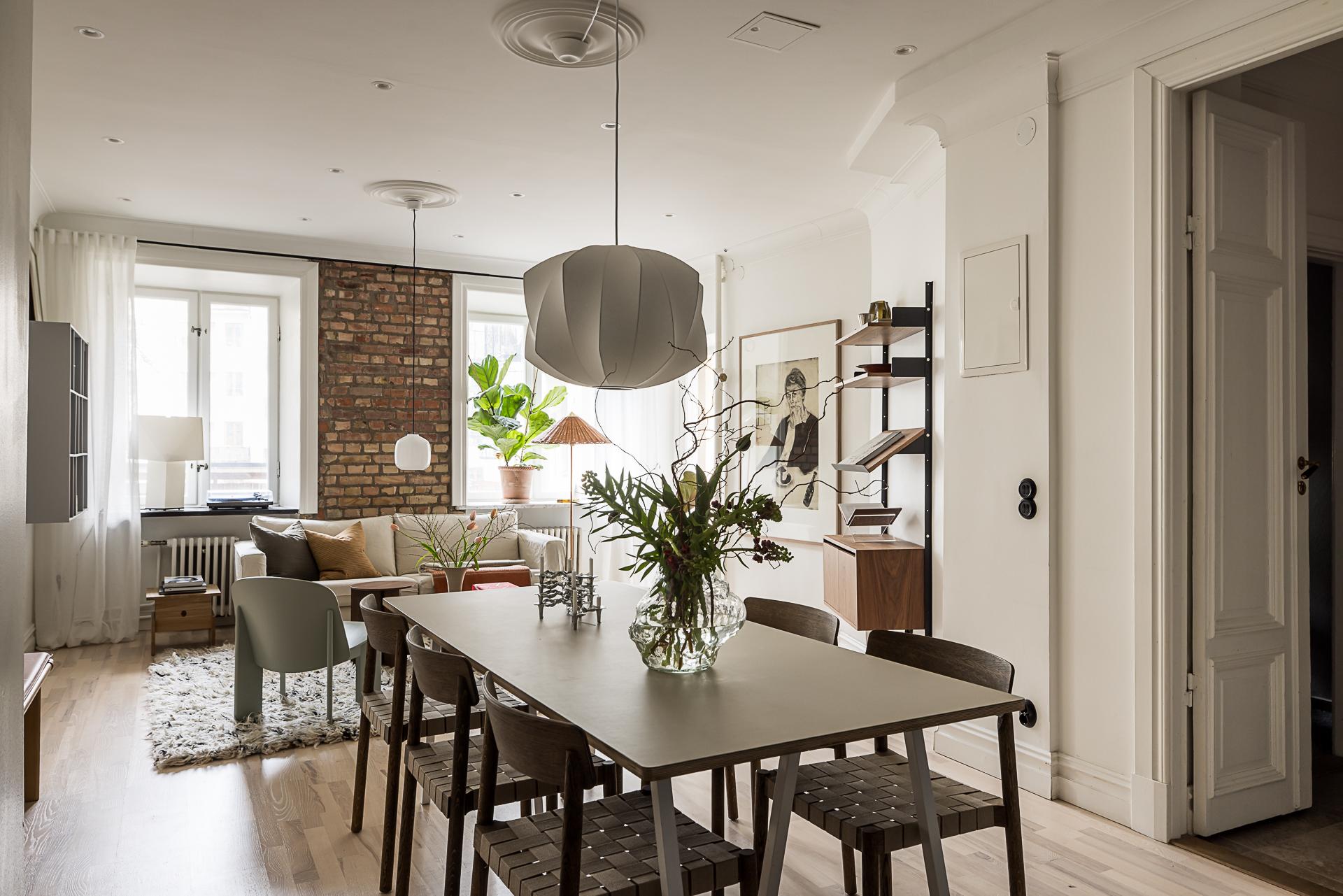 Bostaden präglas av en öppen och social planlösning där kök och vardagsrum möts i perfekt harmoni. Köket är smakfullt renoverat med noggrant utvalda material och blir en naturlig samlingspunkt för både vardag och fest. Badrummet är något utöver det vanliga – generöst tilltaget, lyxigt utformat med bastu och en känsla som för tankarna till ett exklusivt hotell. Interiören är vald med omsorg - askparkett löper mjukt genom rummen, väggarna är målade i ljusa, dämpade toner och en framtagen tegelvägg tillför karaktär och värme. Diskreta spotlights i taket förstärker den sofistikerade känslan. Det är tydligt hur det moderna möter husets historia från sent 1920-tal, med detaljer såsom höga fotlister, spegeldörrar, gjutjärnsradiatorer och djupa fönsterbänkar i sten.