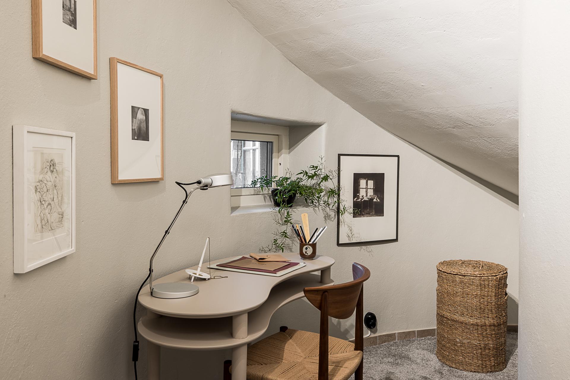 I anslutning till hallen och avskiljt från det större sovrummet ligger detta extra rum som ger en eftertraktad flexibilitet och passar lika bra som barnrum, gästrum eller ett rofyllt hemmakontor. Väggen följer trapphusets rundning och ett fönster mot söder släpper in ljus. Golvet pryds av en mjuk heltäckningsmatta och väggarna är målade i en ljus nyans.