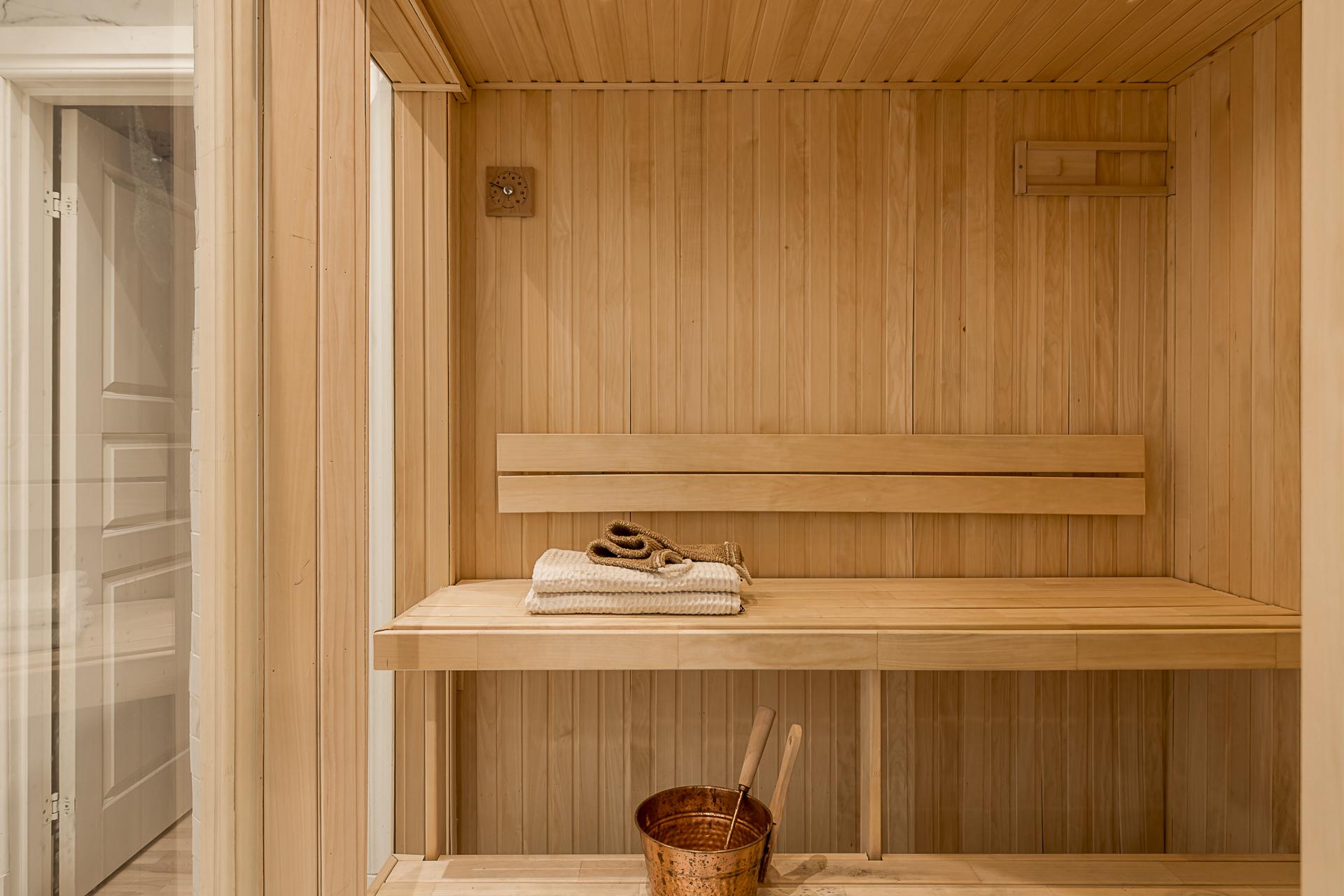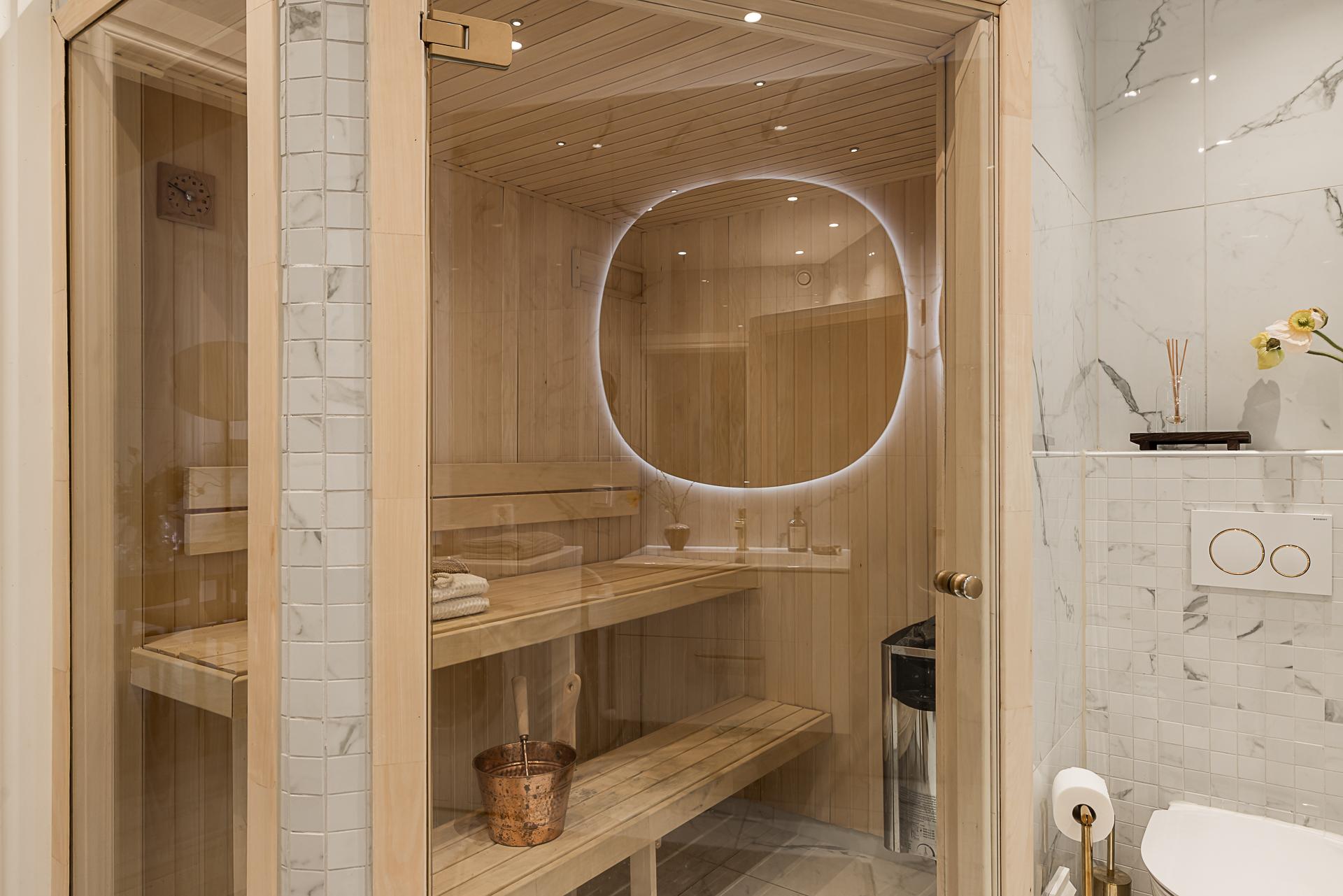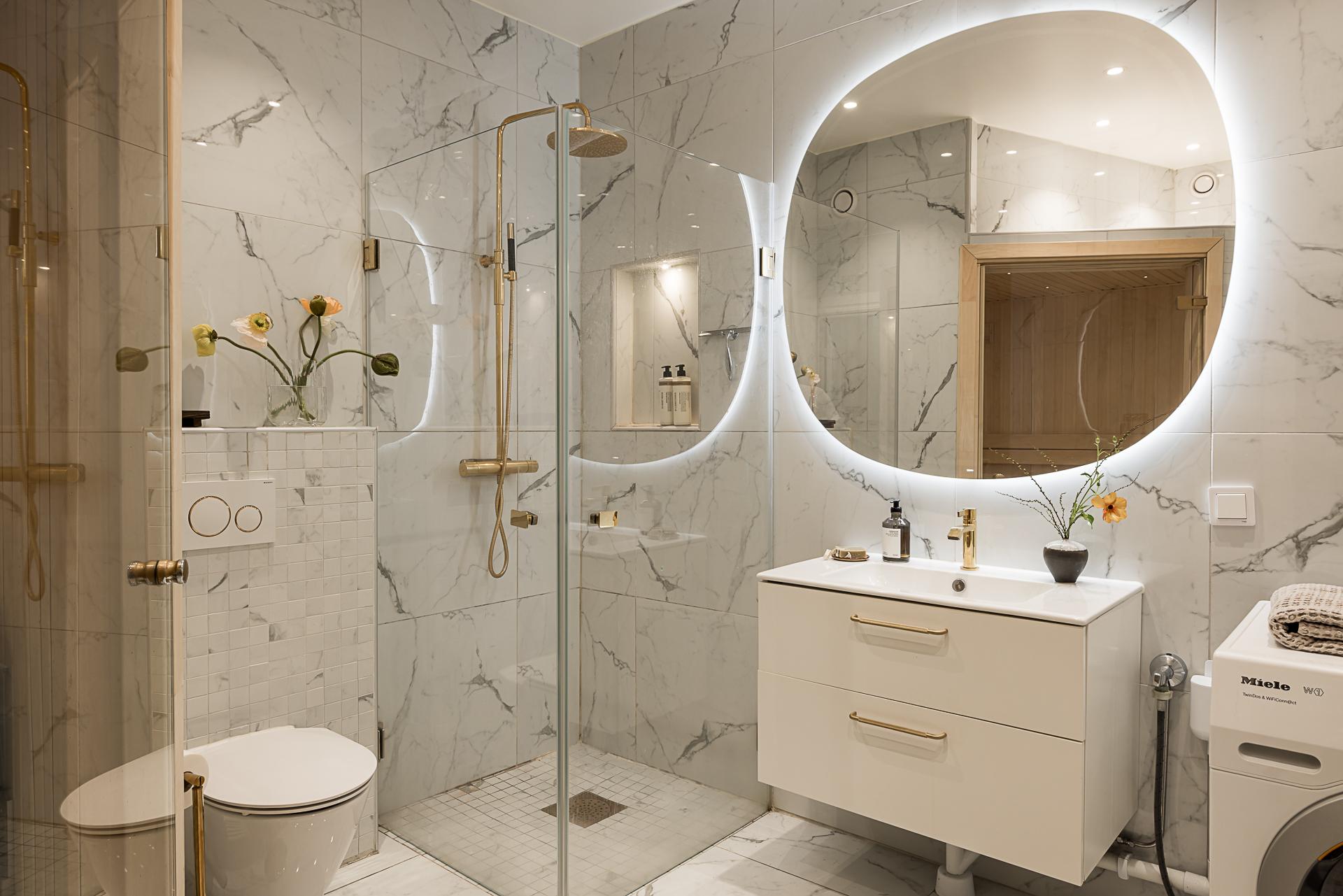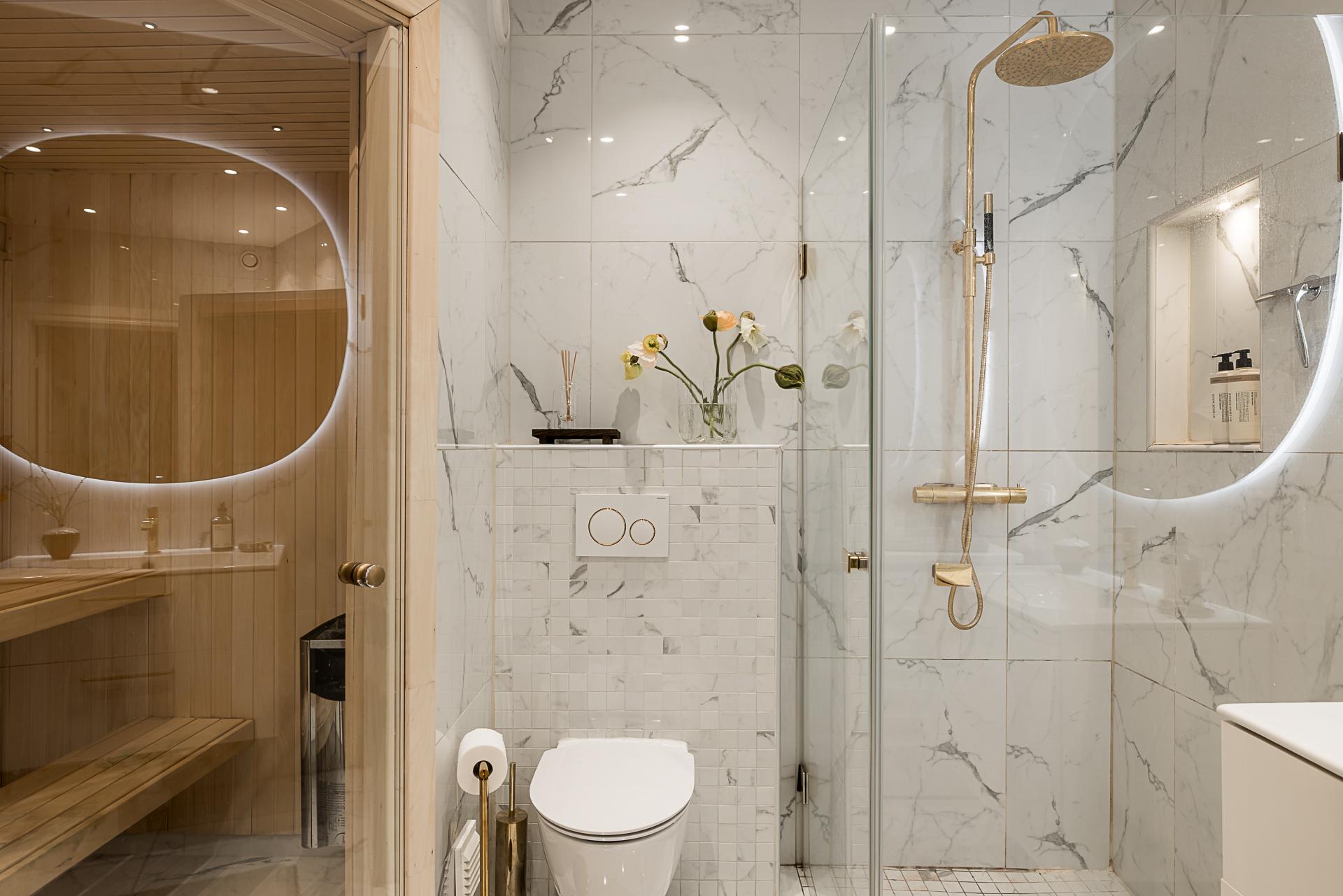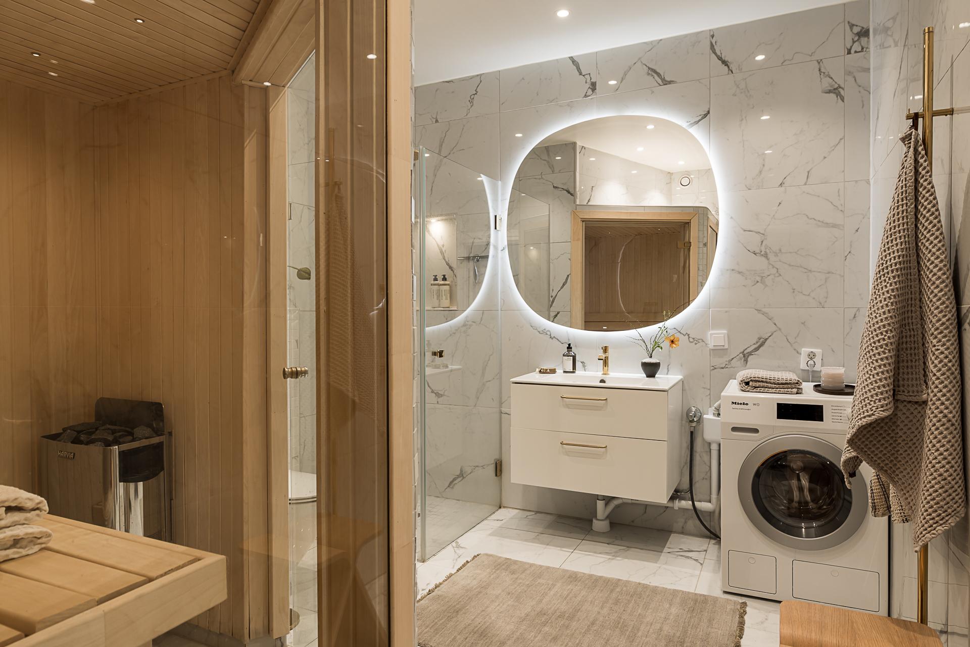 Extremt lyxigt badrum som för tankarna till ett hotell. Stort och påkostat med bastu och dusch. Allt totalrenoverat 2019 enligt konstens alla regler. Väggar och tak är klädda med stora carraramarmor-plattor och i taket sitter infällda spotlights för bästa ljus. En vit kommod med handfat och översittande spegel, wc-stol och tvättmaskin från kvalitativa Mièle. Bjud hem vännerna för en helkväll och bastu - som kommer att älska det!