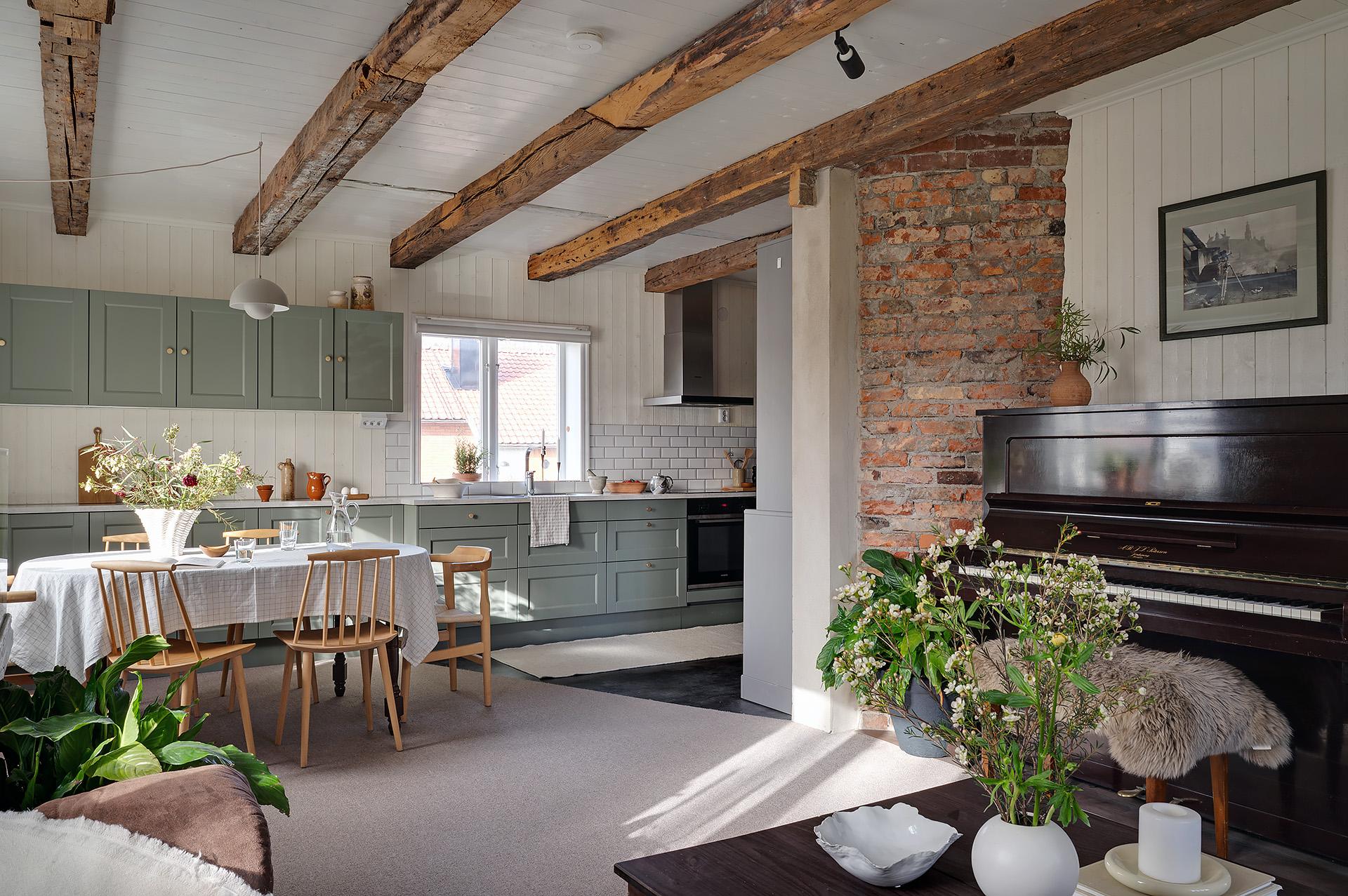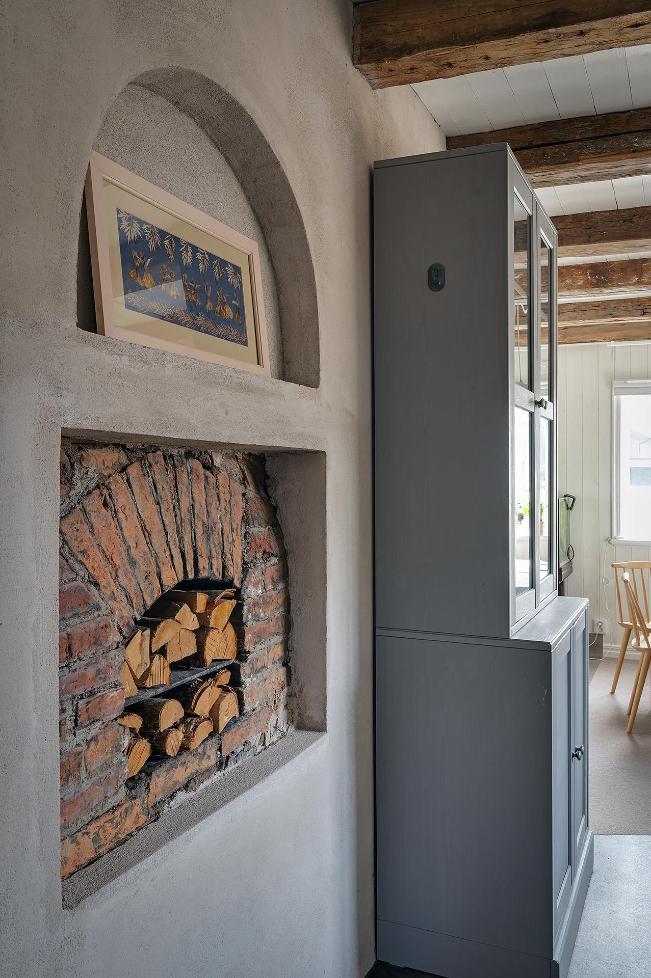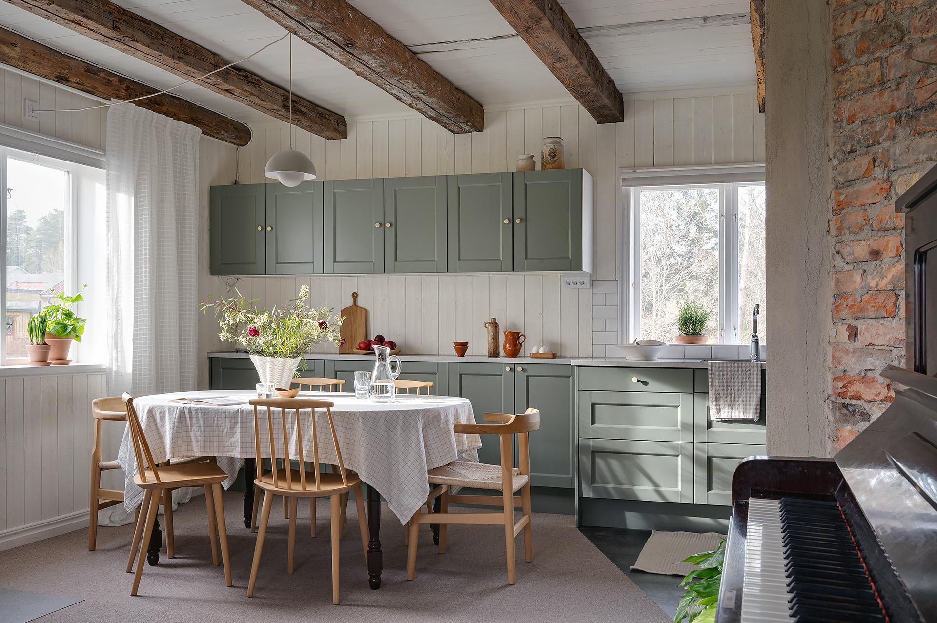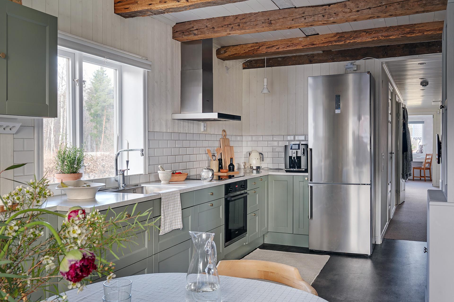 Vardagsrummet och köket förenas i en öppen sällskapsyta med härligt ljusinsläpp från fönster i tre väderstreck. Planlösningen bjuder in till umgänge, och det finns gott om plats för att samla släkt och vänner för trevliga middagar och kalas. Hemmakockarna har bra svängrum, och den breda köksbänken är förlängd ut i rummet. Det är även väl tilltaget med förvaring, och de gedigna köksskåpen kommer från Marbodal. Alla vitvaror – ugn, spishäll, fläkt, kyl/frys och integrerad diskmaskin – är av märket Siemens. Den inbyggda vedugnen som hittades i samband med renoveringen är en charmig detalj, men inte i bruk.