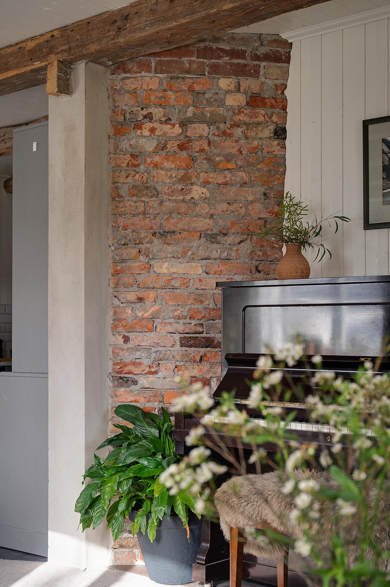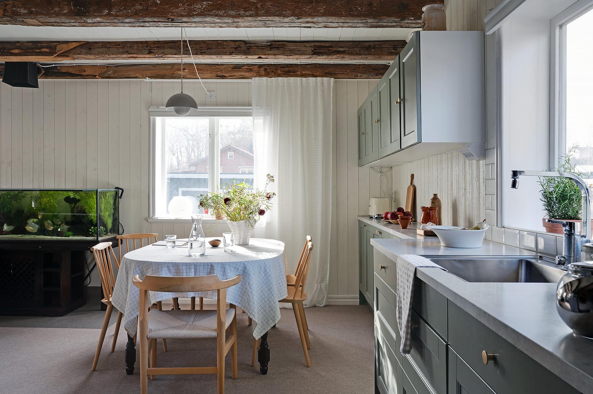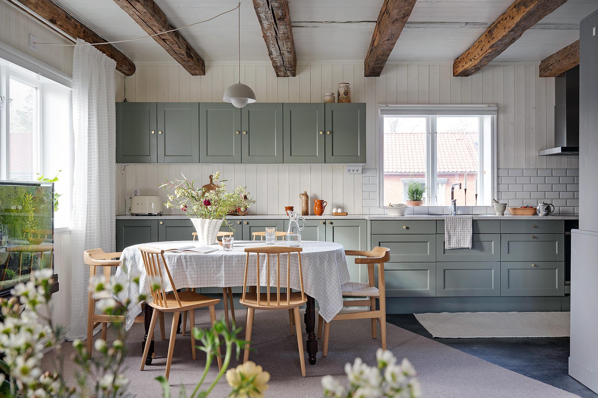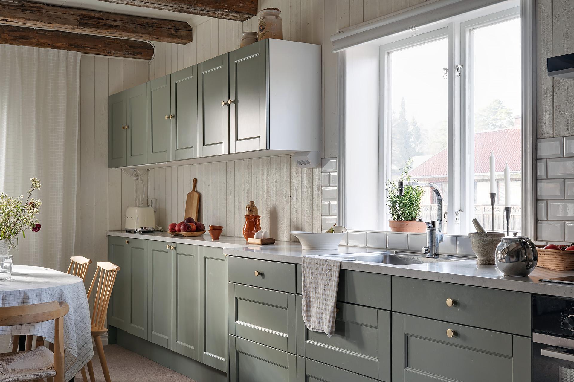 Vardagsrummet och köket förenas i en öppen sällskapsyta med härligt ljusinsläpp från fönster i tre väderstreck. Planlösningen bjuder in till umgänge, och det finns gott om plats för att samla släkt och vänner för trevliga middagar och kalas. Hemmakockarna har bra svängrum, och den breda köksbänken är förlängd ut i rummet. Det är även väl tilltaget med förvaring, och de gedigna köksskåpen kommer från Marbodal. Alla vitvaror – ugn, spishäll, fläkt, kyl/frys och integrerad diskmaskin – är av märket Siemens. Den inbyggda vedugnen som hittades i samband med renoveringen är en charmig detalj, men inte i bruk.