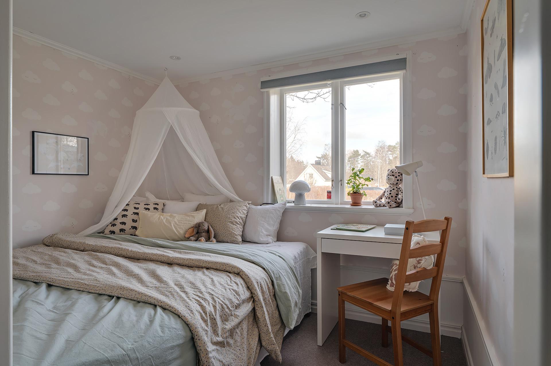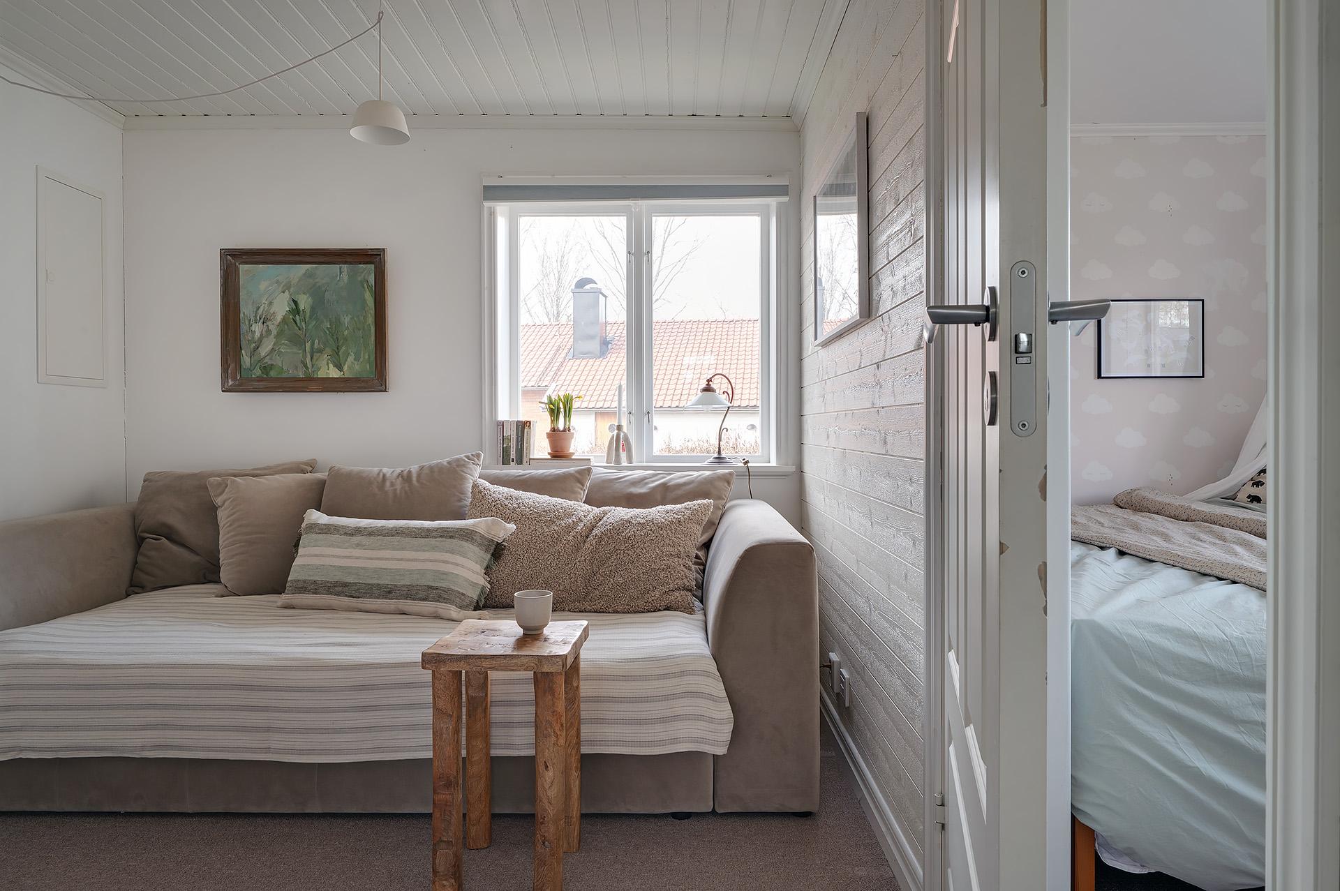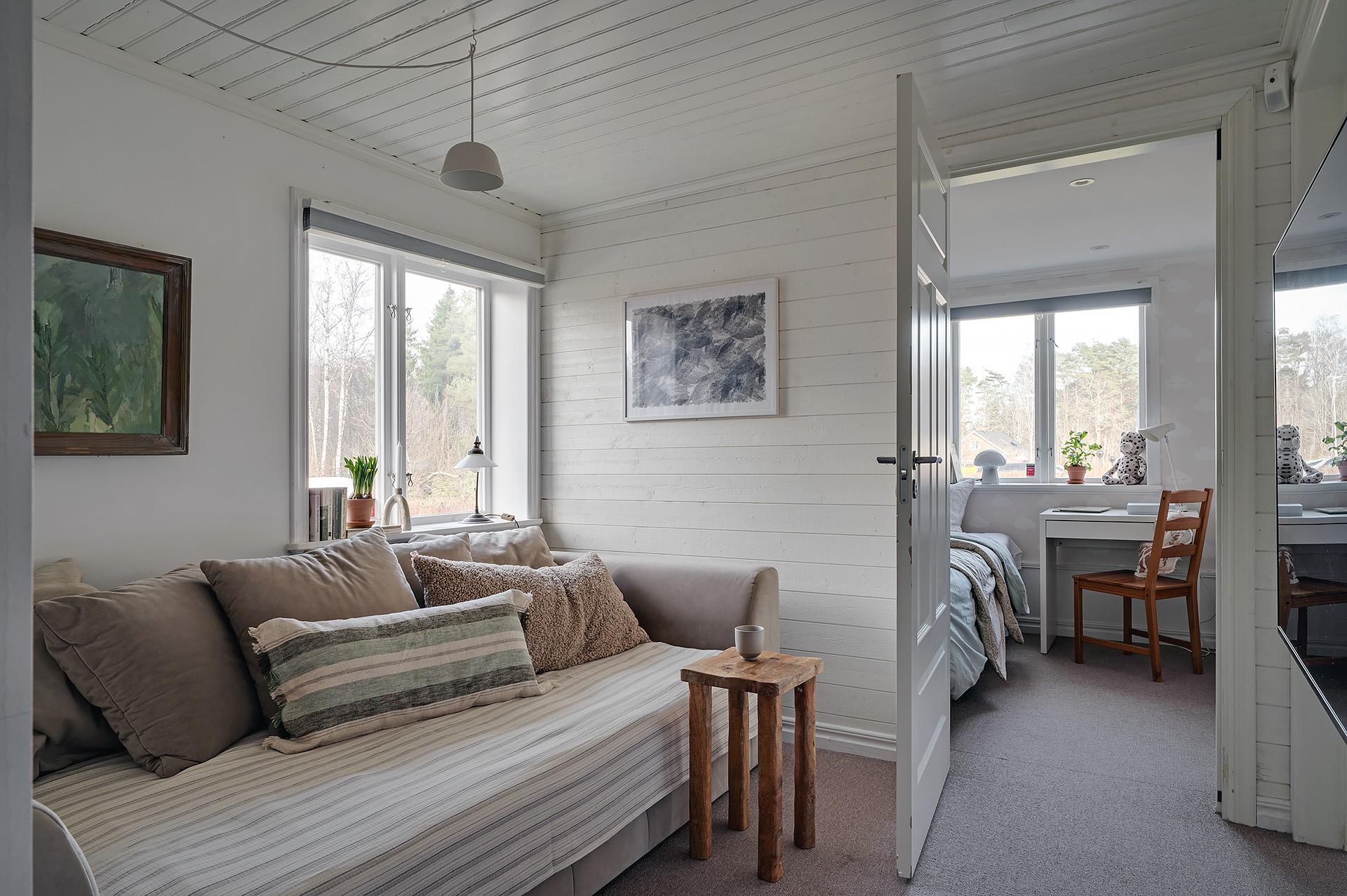Huset disponeras med tre väldimensionerade sovrum med fina tapeter och höga fotlister som ramar in betonggolvet. Det största har gott om plats för en dubbelsäng med nattduksbord och intill finns ett hemmakontor – alternativt klädkammare – med utgång till den soliga uteplatsen. De två andra sovrummen lämpar sig storleksmässigt väl som barn- eller gästrum.