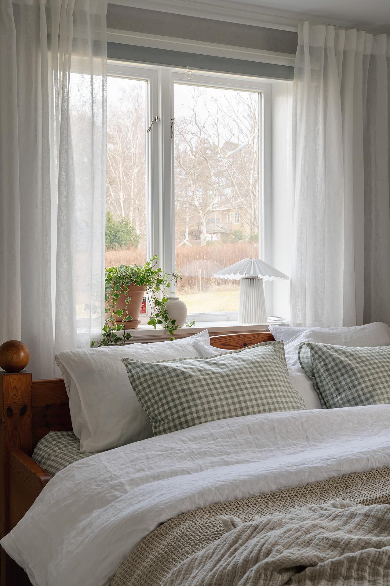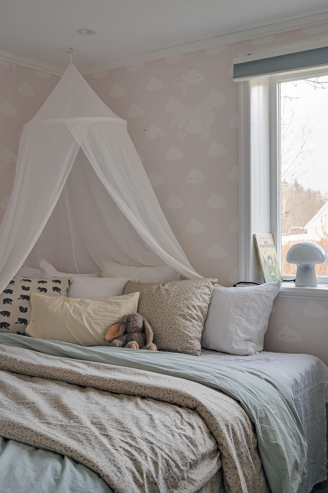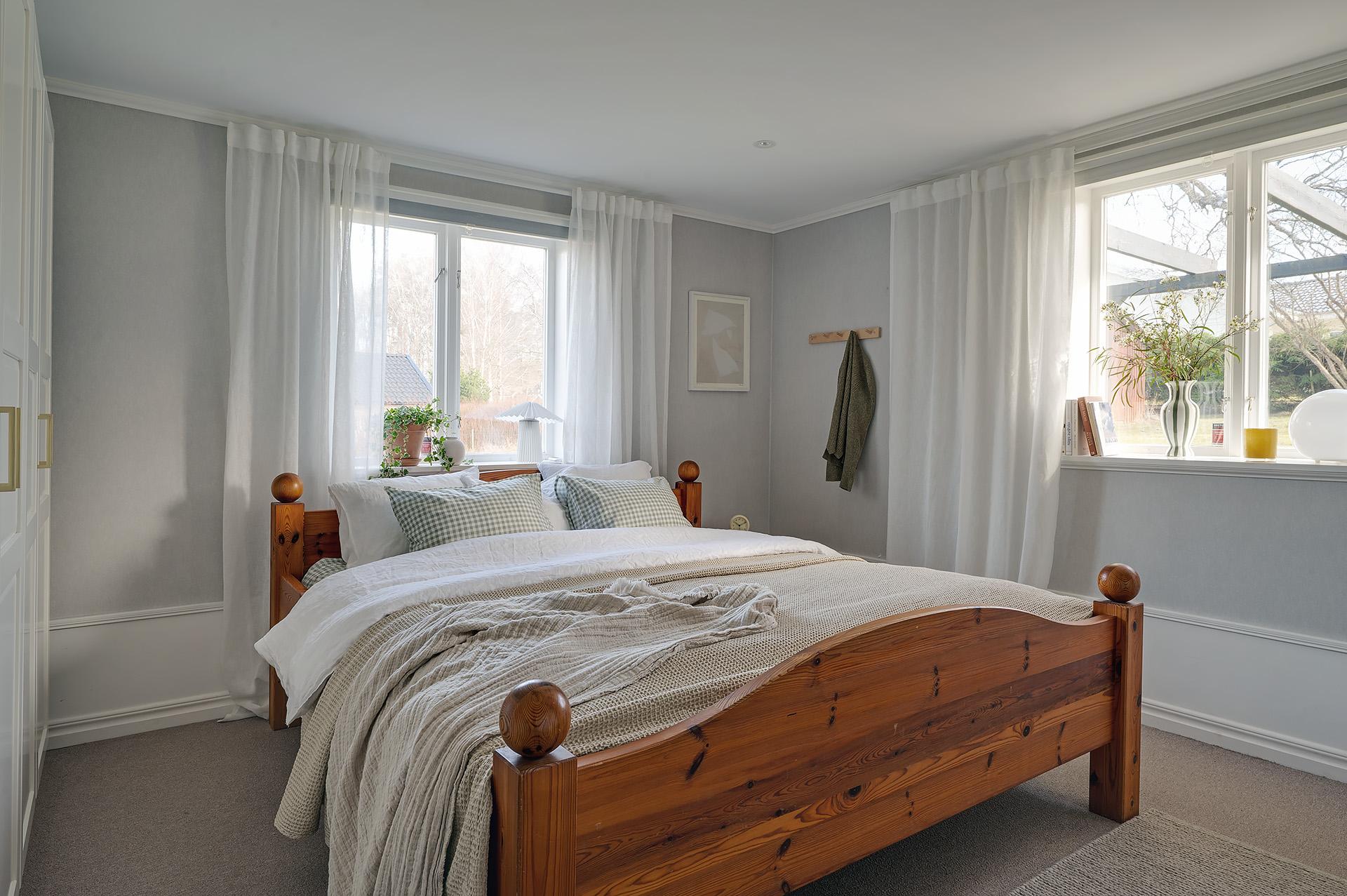 Huset disponeras med tre väldimensionerade sovrum med fina tapeter och höga fotlister som ramar in betonggolvet. Det största har gott om plats för en dubbelsäng med nattduksbord och intill finns ett hemmakontor – alternativt klädkammare – med utgång till den soliga uteplatsen. De två andra sovrummen lämpar sig storleksmässigt väl som barn- eller gästrum.