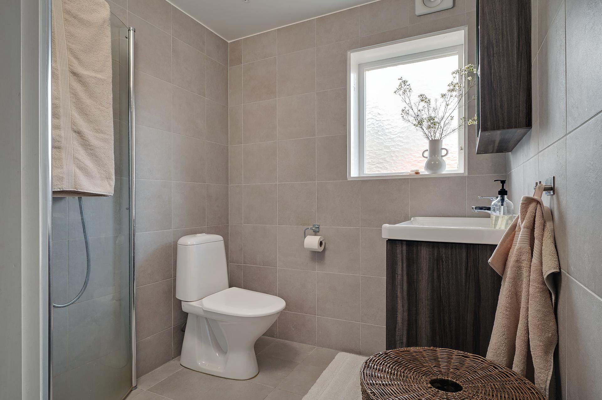 Båda badrummen inrymmer duschhörna, tvättkommod och toalett. I det ena finns även en tvättmaskin. Väggarna är helkaklade och golven belagda med klinker. Liksom i övriga huset är det behaglig golvvärme. Fönstren i norr släpper in dagsljus och frisk luft.
