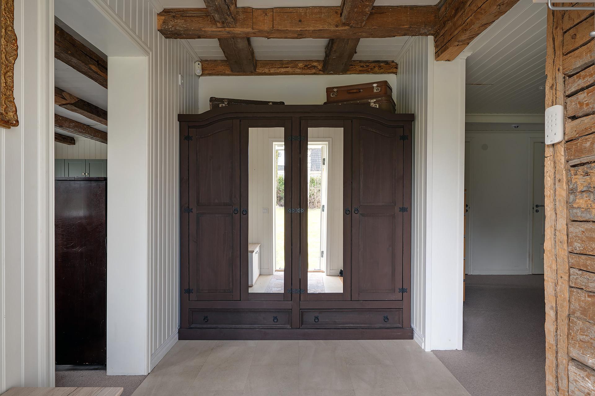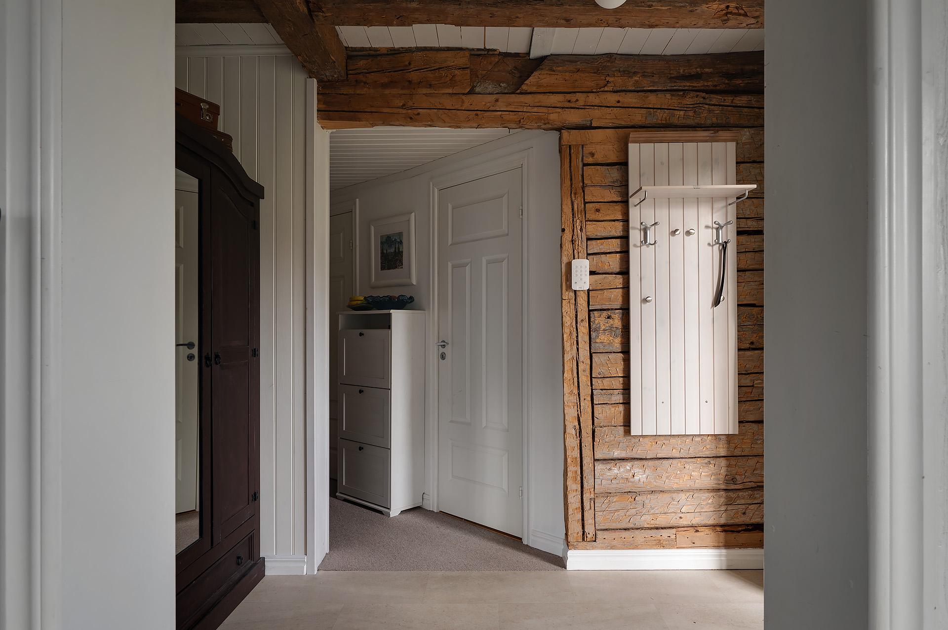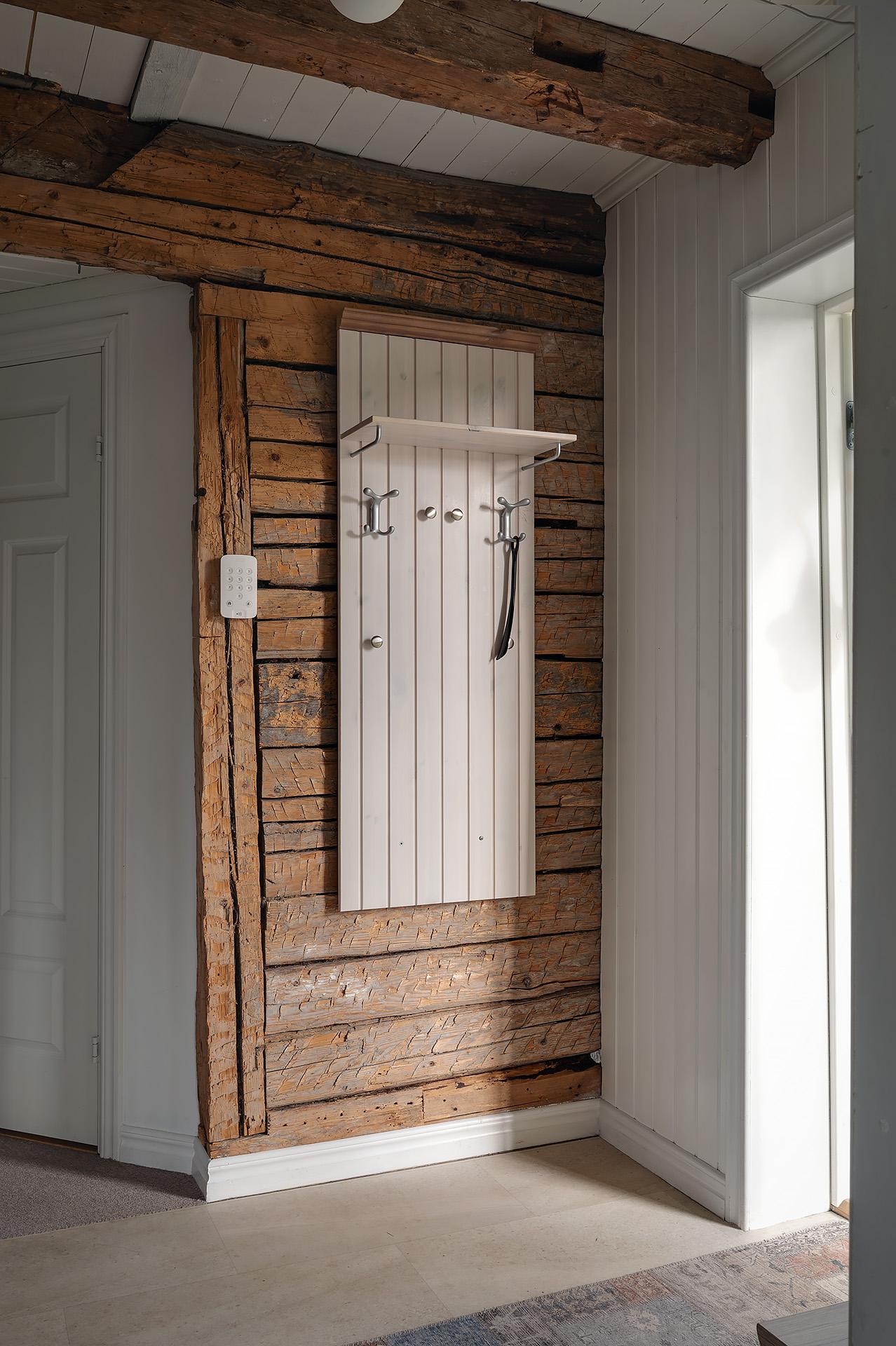 Med sina synliga takbjälkar, sin frilagda timmervägg och sitt tröskelfria betonggolv slår hallen an tonen för huset. Det är en ljus och välkomnande entré med gott om plats för både jackavhängning och sittmöbler.