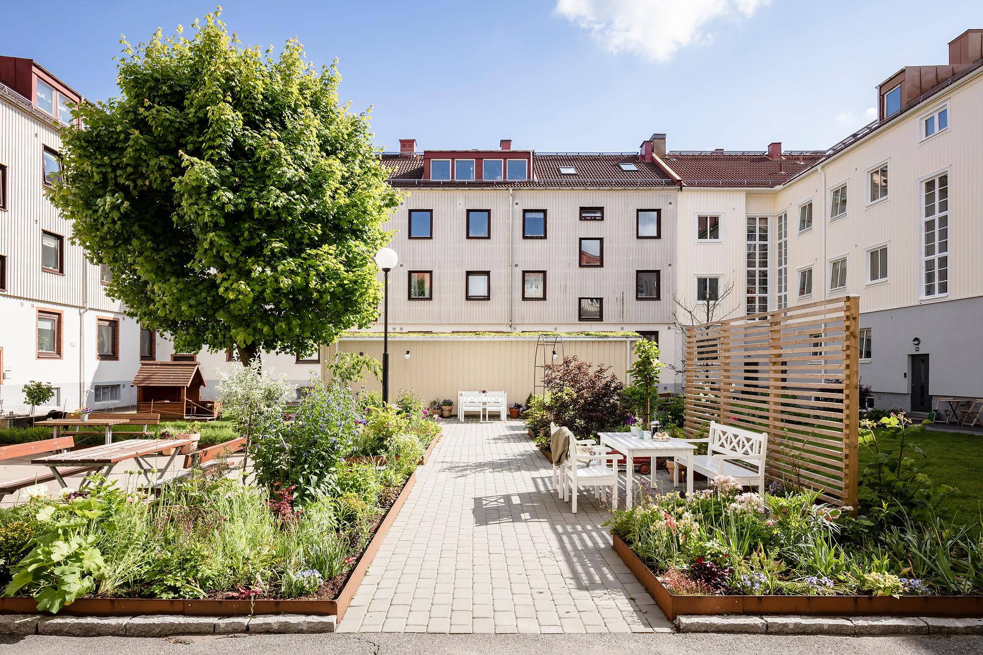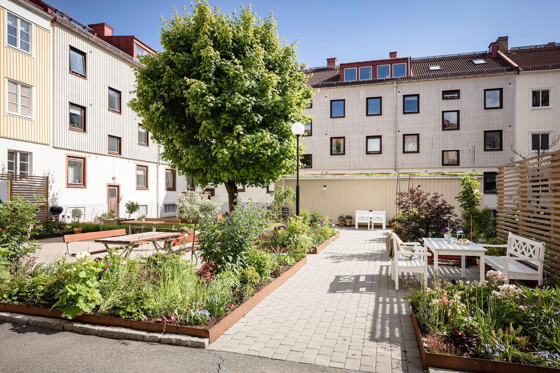 - Övriga utrymmen: Tvättstuga. Solig och vacker innergård samt trädgård på baksidan med utemöbler och grill. Gästrum. Hobbyrum. Cykelförråd med ingång från husets baksida.