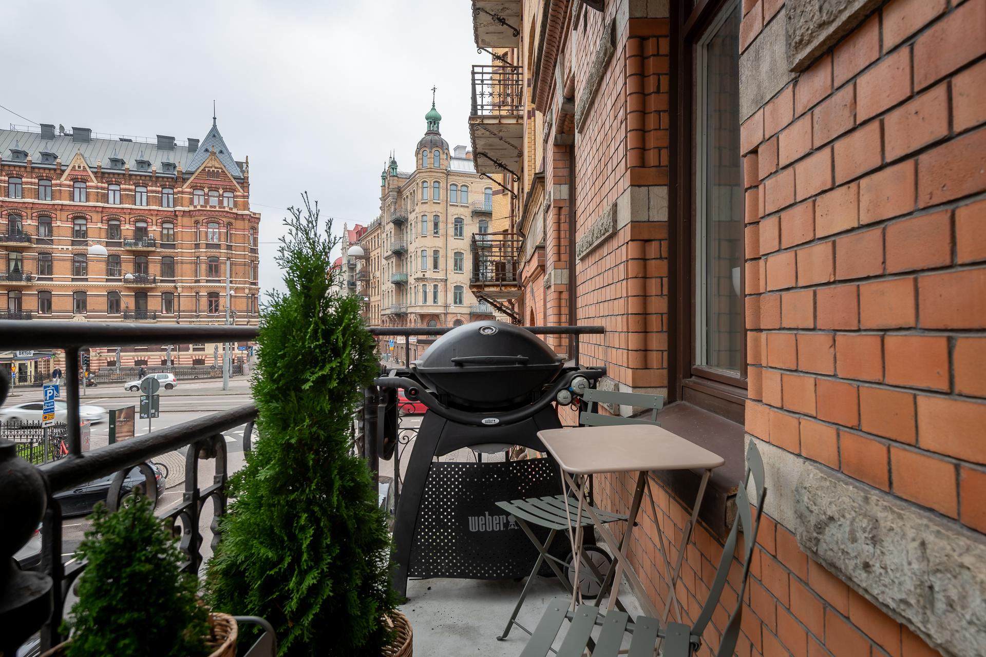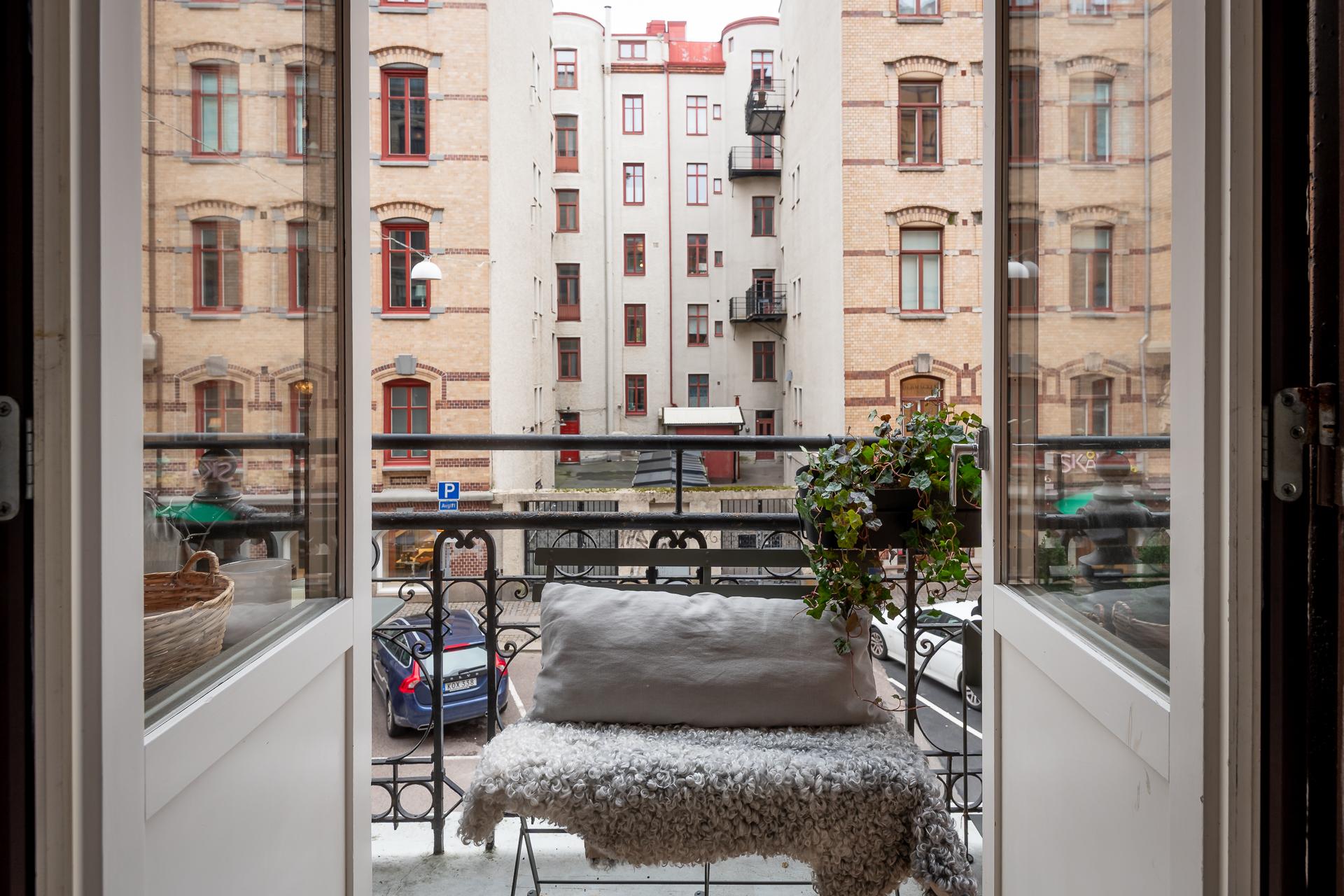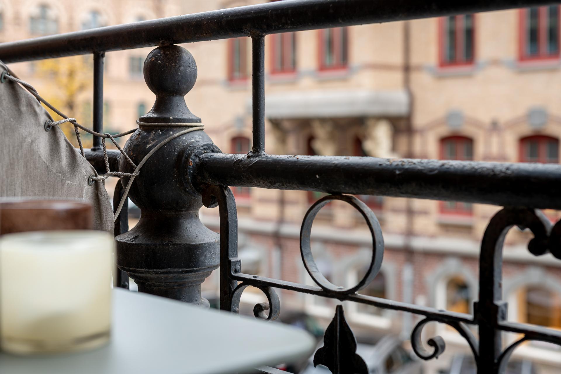 - Balkong/Uteplats: Ja. Stor smidesbalkong ut mot gatan i originalutförande.
