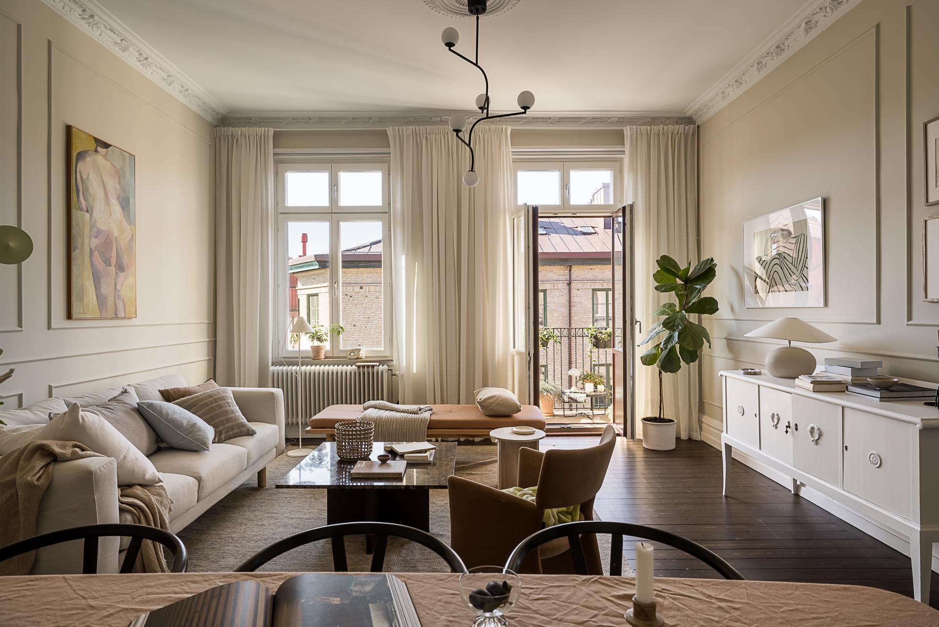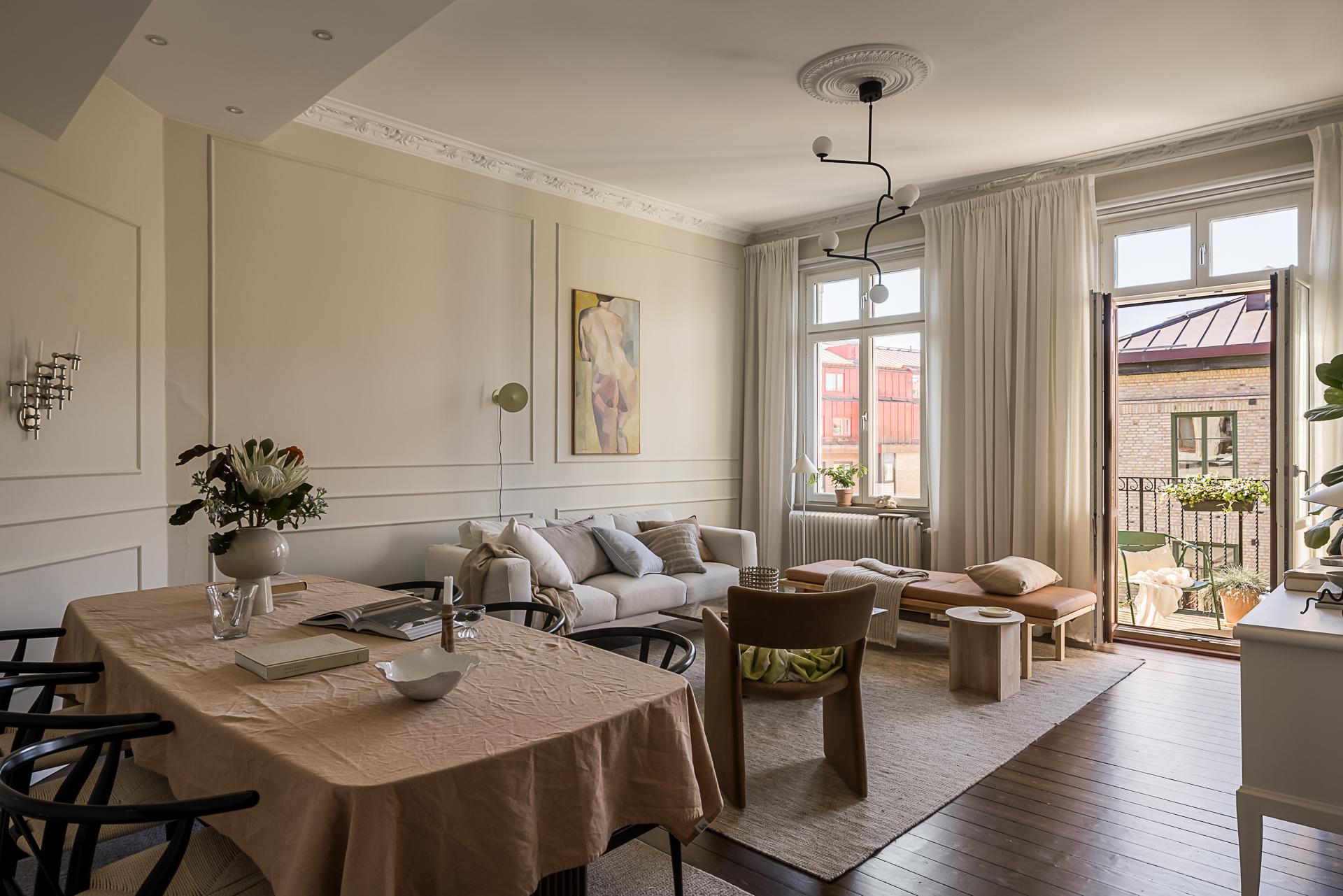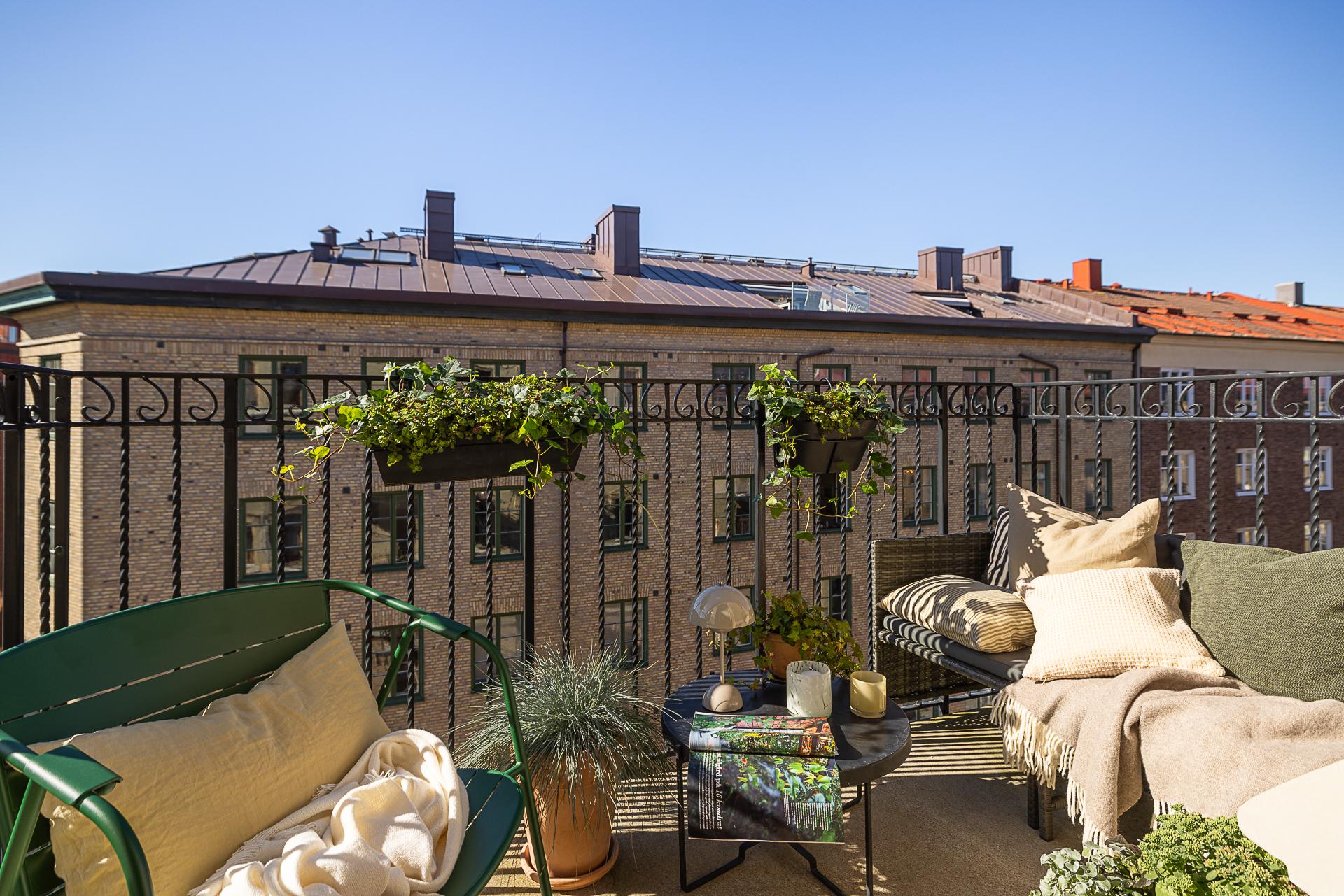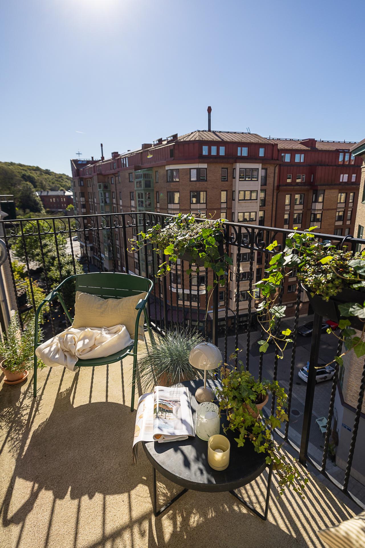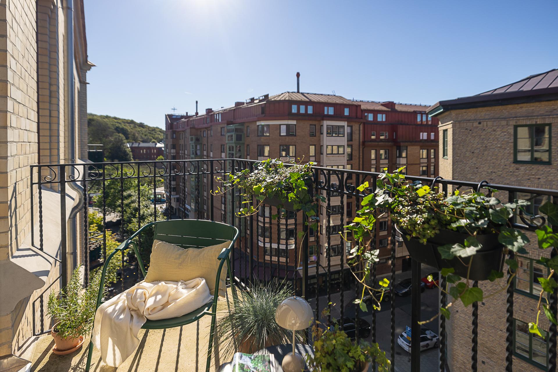 Sekelskiftestrea i högsta, friaste, ljusaste läge. Hissen går hela vägen upp till femte våningen och där väntar 82 kvadrat med brädgolv, dryga tre meter till tak och en västerbalkong med smidesräcke. Allt detta i fastighet med alldeles nyrenoverad fasad och nya fönster från 2020.