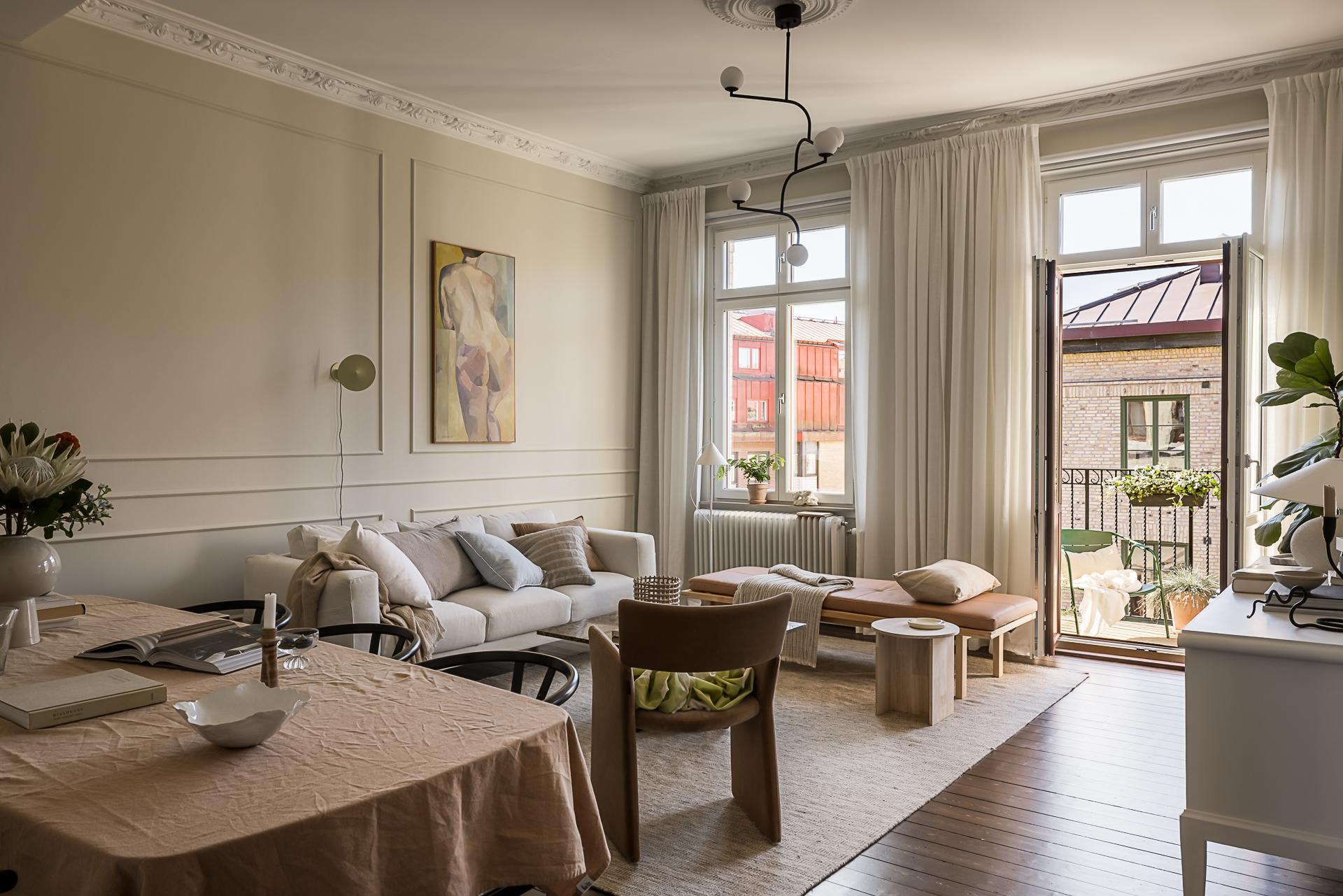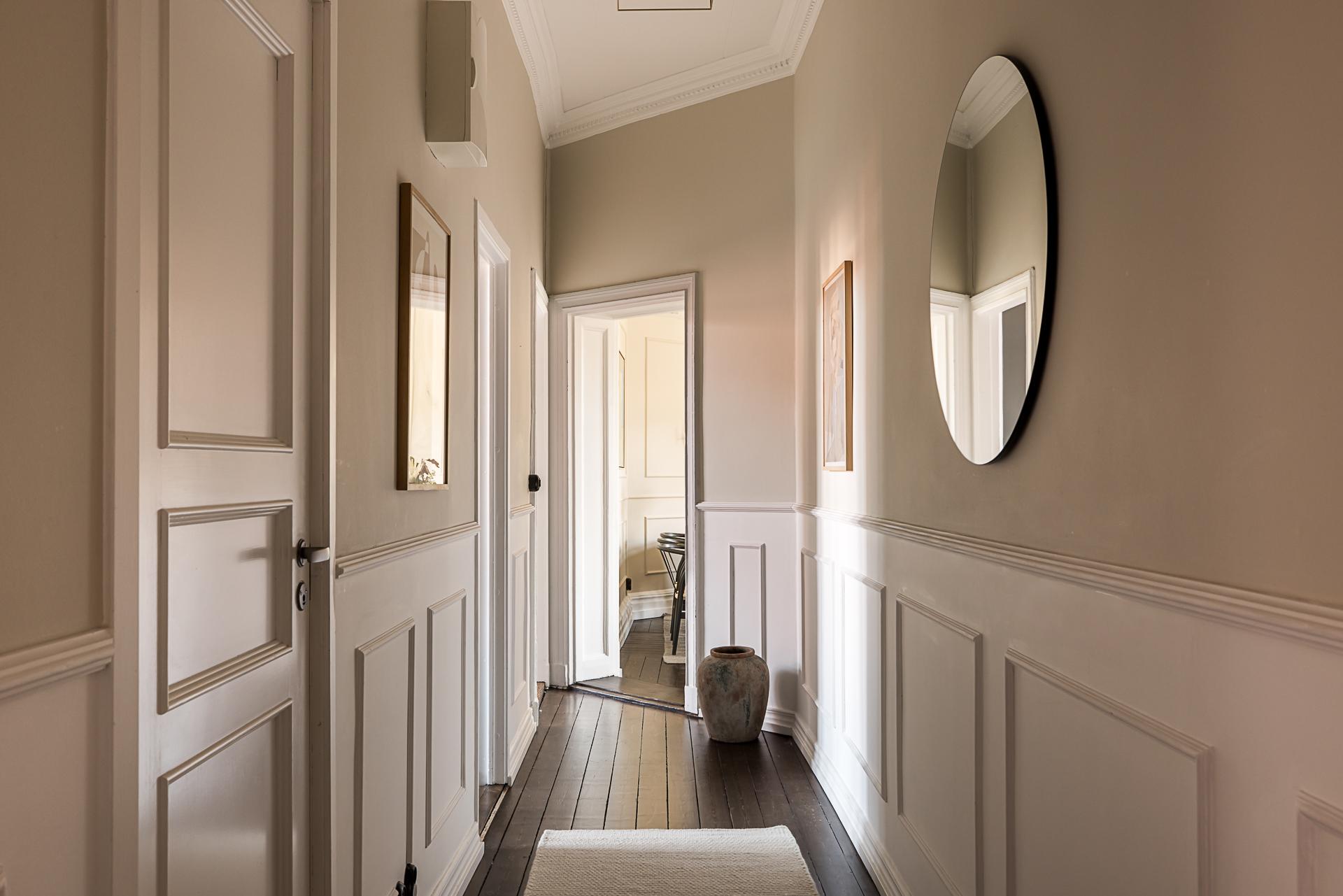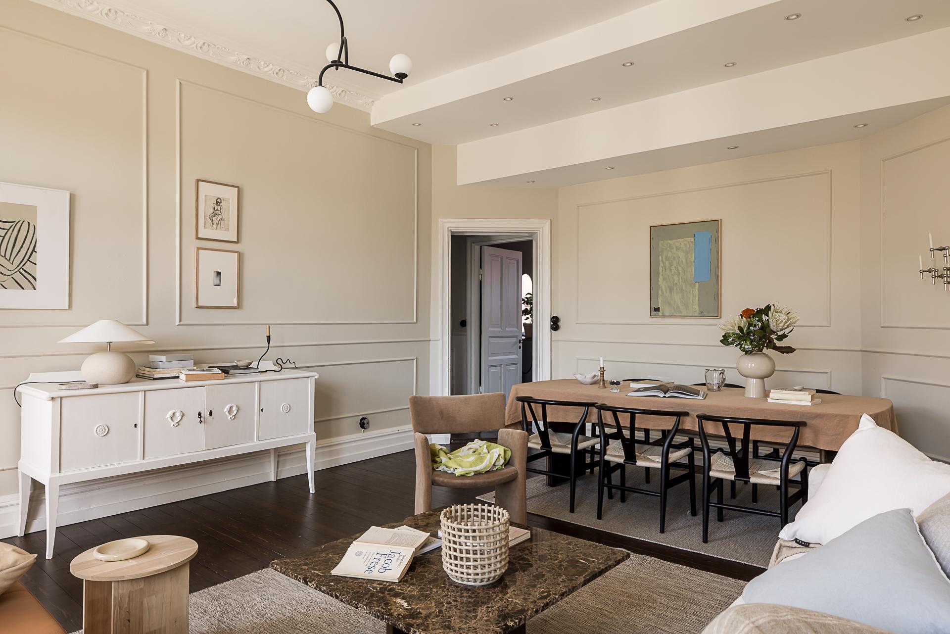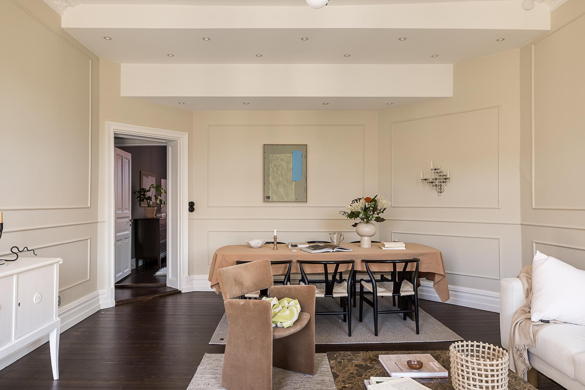 Sekelskiftestrea i högsta, friaste, ljusaste läge. Hissen går hela vägen upp till femte våningen och där väntar 82 kvadrat med brädgolv, dryga tre meter till tak och en västerbalkong med smidesräcke. Allt detta i fastighet med alldeles nyrenoverad fasad och nya fönster från 2020.