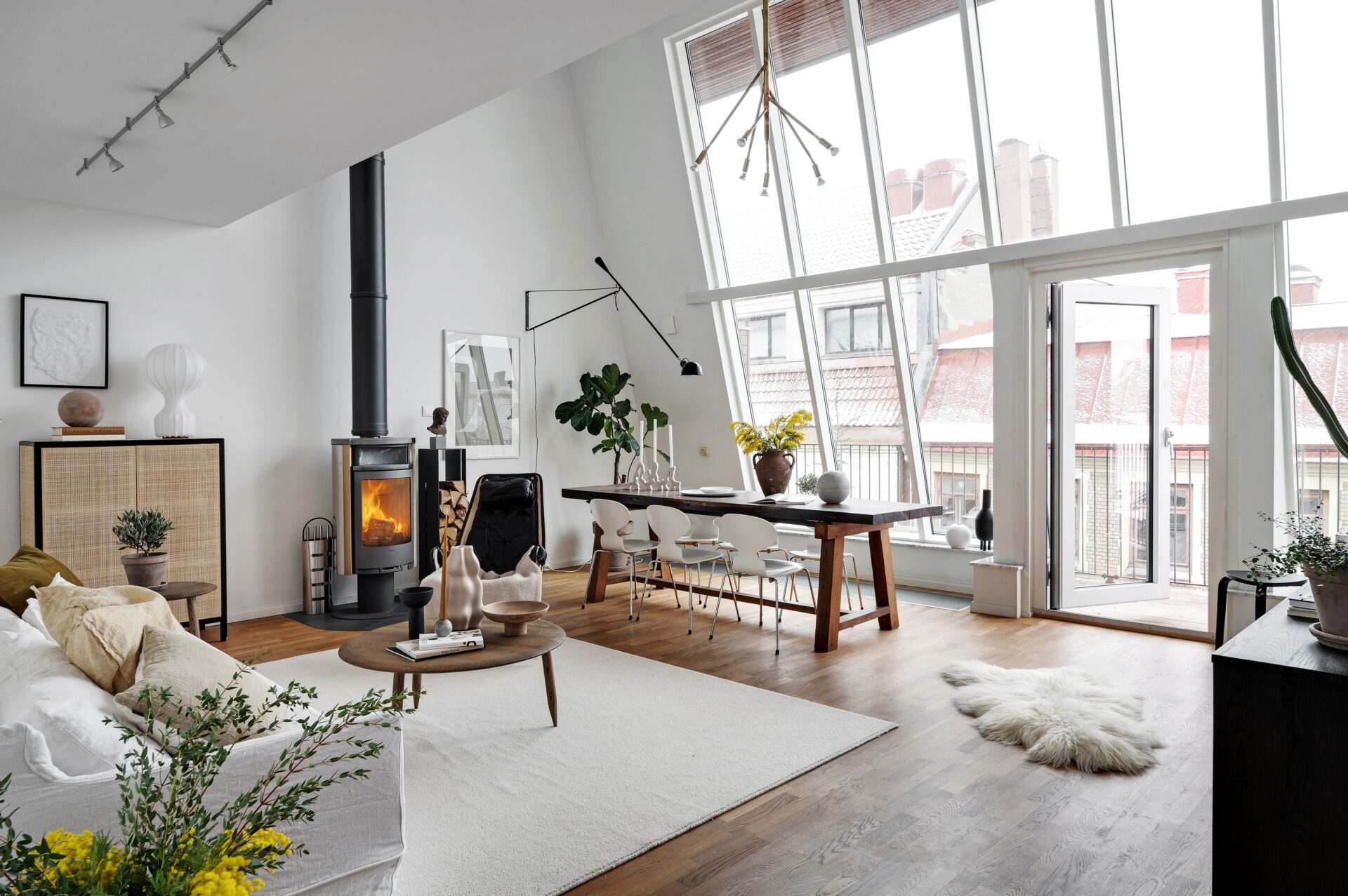 Spektakulär 4,5:a i två plan med ca 5 m i takhöjd, två terrasser, söderbalkong, eldstad, två badrum och enorma glaspartier för generöst ljusinsläpp. Fri från insyn och huskänsla" mitt i stan. Välskött fastighet med hiss till dörren. Extremt stabil förening med mycket låga avgifter och endast ca 1400 kr/skuld/kvm. Föreningen erbjuder gym, festlokal, bastu, gästlägenhet samt garageplatser. Bredband ingår i den redan låga avgiften. Eventuellt kan en garageplats överlåtas.