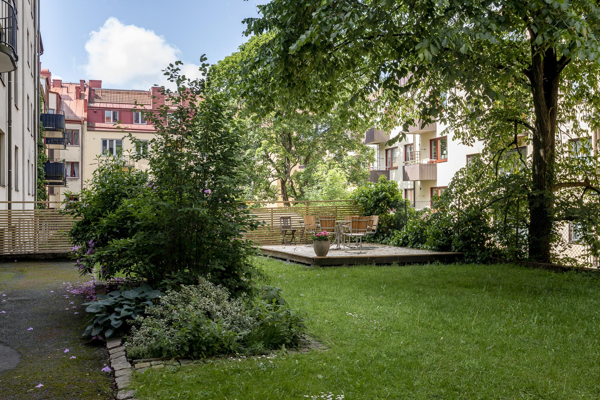 - Övriga utrymmen: Föreningen har en trevlig uteplats på innergården, trädäck med möbler och grill. Låst cykelrum samt cykelförvaring på gården.