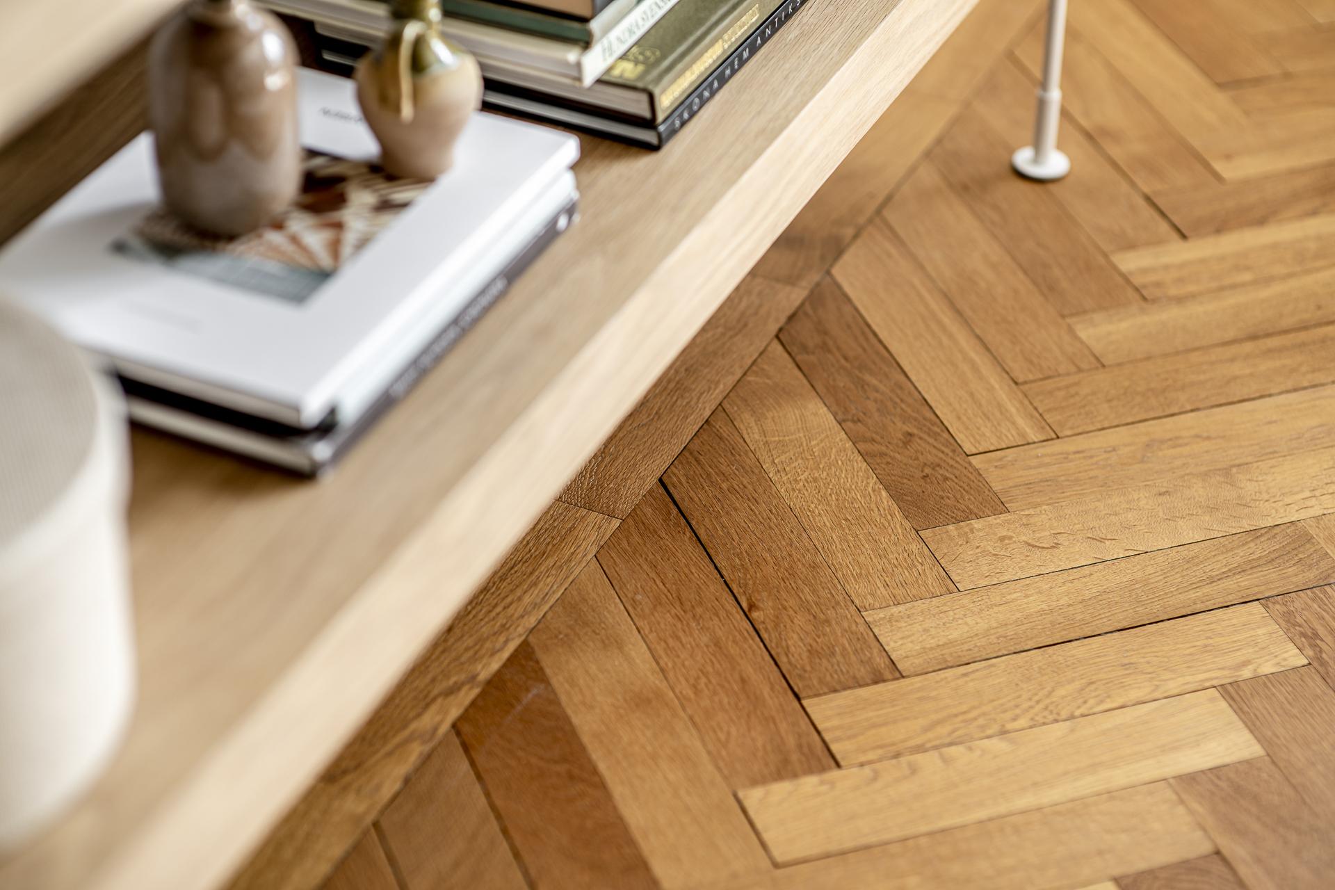 Vardagsrummet är luftigt och lättmöblerat med plats för såväl soffgrupp som matbord och övrigt möblemang. Ett stort fönsterparti släpper in rikligt med ljus och bjuder på en rogivande vy mot lummig grönska och Johanneskyrkan i bakgrunden. På golvet ligger vacker parkett i klassisk fiskbensläggning och väggarna är målade i en mjuk ljusgrå nyans som skapar en elegant och ombonad atmosfär.