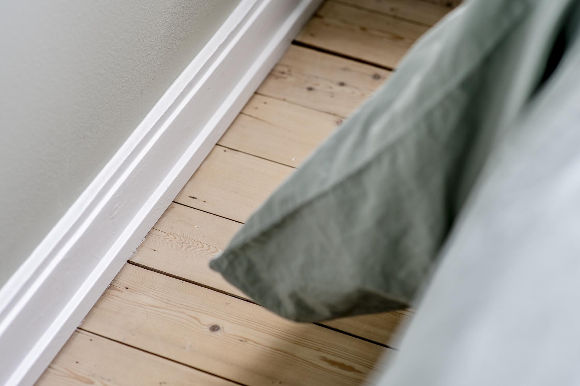 Det mindre sovrummet lämpar sig utmärkt som barnrum, gästrum eller hemmakontor. Även här är känslan lugn och ombonad med plats för säng, skrivbord och förvaring efter behov. Ett flexibelt rum som enkelt anpassas efter livets olika skeden. Väggarna är målade i en blå nyans och på golvet ligger ett brädgolv.